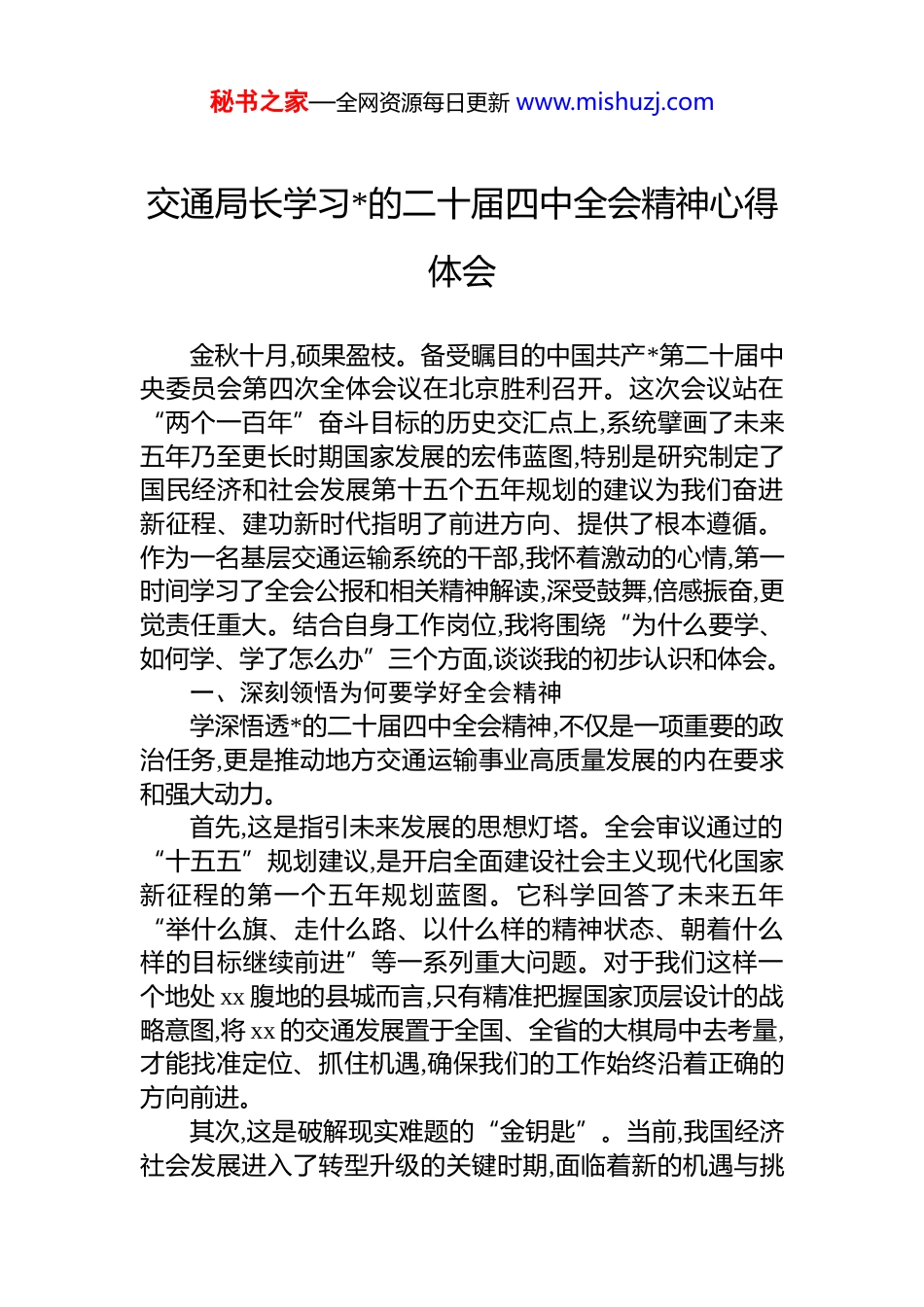秘书之家—全网资源每日更新 www.mishuzj.com交通局长学习*的二十届四中全会精神心得体会金秋十月,硕果盈枝。备受瞩目的中国共产*第二十届中央委员会第四次全体会议在北京胜利召开。这次会议站在“两个一百年”奋斗目标的历史交汇点上,系统擘画了未来五年乃至更长时期国家发展的宏伟蓝图,特别是研究制定了国民经济和社会发展第十五个五年规划的建议为我们奋进新征程、建功新时代指明了前进方向、提供了根本遵循。作为一名基层交通运输系统的干部,我怀着激动的心情,第一时间学习了全会公报和相关精神解读,深受鼓舞,倍感振奋,更觉责任重大。结合自身工作岗位,我将围绕“为什么要学、如何学、学了怎么办”三个方面,谈谈我的初步认识和体会。一、深刻领悟为何要学好全会精神学深悟透*的二十届四中全会精神,不仅是一项重要的政治任务,更是推动地方交通运输事业高质量发展的内在要求和强大动力。首先,这是指引未来发展的思想灯塔。全会审议通过的“十五五”规划建议,是开启全面建设社会主义现代化国家新征程的第一个五年规划蓝图。它科学回答了未来五年“举什么旗、走什么路、以什么样的精神状态、朝着什么样的目标继续前进”等一系列重大问题。对于我们这样一个地处 xx 腹地的县城而言,只有精准把握国家顶层设计的战略意图,将 xx 的交通发展置于全国、全省的大棋局中去考量,才能找准定位、抓住机遇,确保我们的工作始终沿着正确的方向前进。其次,这是破解现实难题的“金钥匙”。当前,我国经济社会发展进入了转型升级的关键时期,面临着新的机遇与挑秘书之家—全网资源每日更新 www.mishuzj.com战。交通运输作为经济社会发展的“先行官”,同样处于爬坡过坎、提质增效的重要关口。从路网的“连线成片”到服务的“优质高效”,从传统的基建模式到智慧绿色交通的转型,我们面临着资金、技术、管理等多方面的挑战。全会提出的关于高质量发展、深化改革、统筹发展与安全等一系列新理念、新部署为我们破解这些发展中的瓶颈问题提供了理论指导和方法论支持。最后,这是砥砺初心使命的政治必修课。作为一名*员干部,学习贯彻*中央的决策部署是天职。全会精神是*的创新理论在新的历史条件下的具体化。通过学习,能够不断提高自身的政治判断力、政治领悟力、政治执行力,自觉在思想上政治上行动上同以***同志为核心的*中央保持高度一致。这不仅是对个人*性的锤炼,更是确保交通运输权力始终为人民服务的根本保证。只有心中有方向,脚下才有力量,才能在服务群众出行、促进经济循环的道路上行得更稳、走得更远。二、融会贯通如何学好全会精神学习领会全会精神,不能停留在“听过、看过”的浅表层面,必须坚持多维度、深层次、全方位地学,真正做到入脑入心、知行合一。一是在原原本本学上下功夫。我将带头静下心来,逐字逐句研读全会公报及相关文件。坚持读原文、悟原理,深刻理解其中蕴含的核心要义、精神实质和实践要求。特别是对全会提出的新判断、新提法、新举措,要反复琢磨、深入思考,力求吃透精神、把握精髓,避免一知半解、断章取义。二是在联系实际学上求实效。理论的价值在于指导实践。我将把学习全会精神与我们 xx 县交通运输工作的实际紧密结合起来。例如,在学习“构建现代化基础设施体系”时,我会立刻联想到我们县正在推进的普通省道建设和“四好农村路”提质升级工程;在学习“推动城乡融合和区域协调发展”时,我会思考如何通过优化城乡公交线路、发展农秘书之家—全网资源每日更新 www.mishuzj.com村物流来服务乡村振兴战略。通过这种带着问题学、带着责任学的方式,让学习过程成为分析问题、研究工作、谋划未来的过程。三是在以上率下学上作表率。作为单位的“班长”,我深知自身的示范引领作用至关重要。我将以身作则,先学一步、学深一层。同时,将学习贯彻全会精神作为局*组理论学习中心组的核心内容精心组织专题学习研讨,并号召全局干部职工通过“三会一课”、主题*日、青年理论学习小组等多种形式,迅速掀起学习热潮。通过领导带头、全员参与,营造出比学赶超的浓厚氛围,确保全会精神在 xx 交通运输系统落地生根。三、知行合一学了之后要怎么办学习的目的全在于运用。作为县交通运输局的负责...