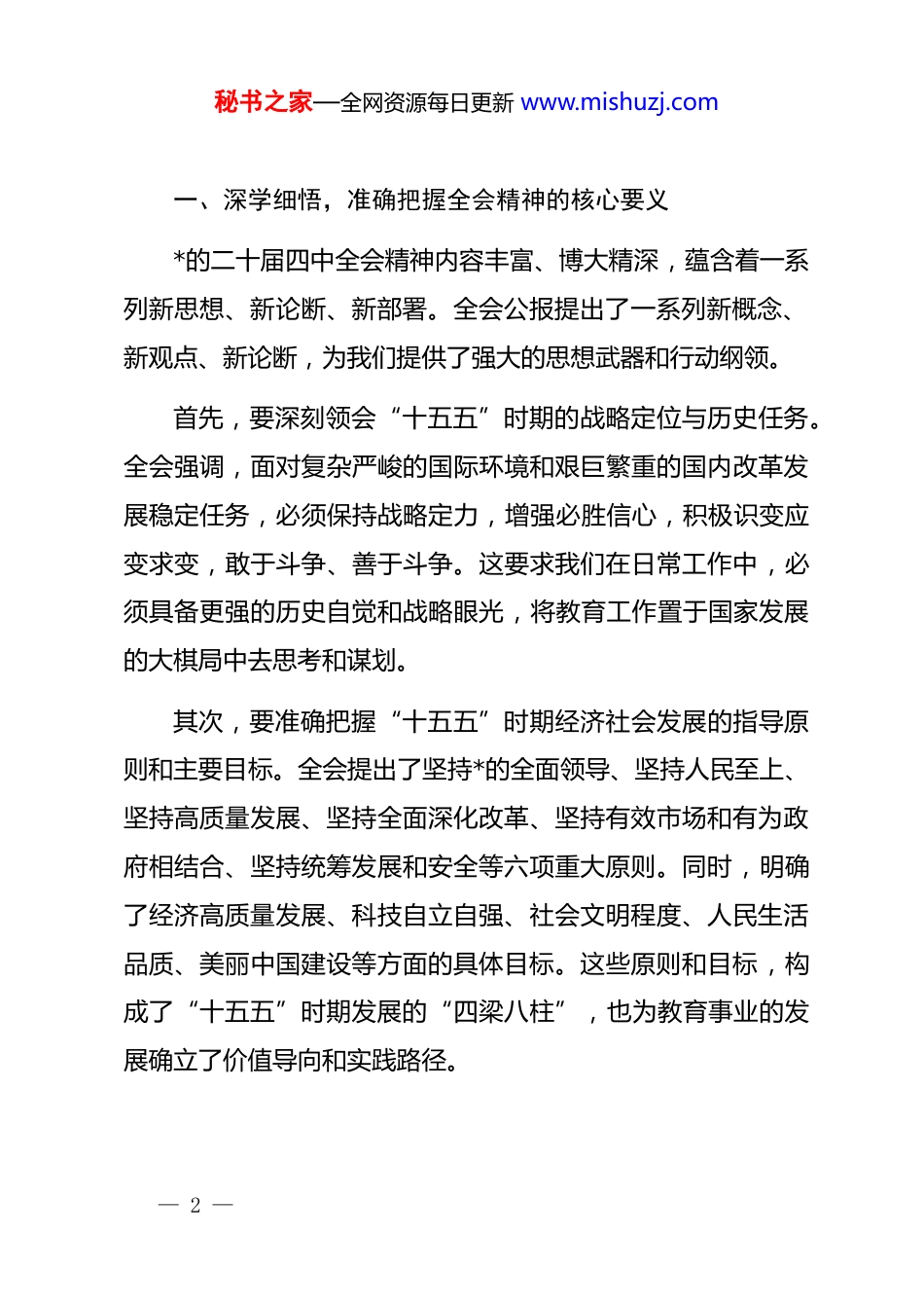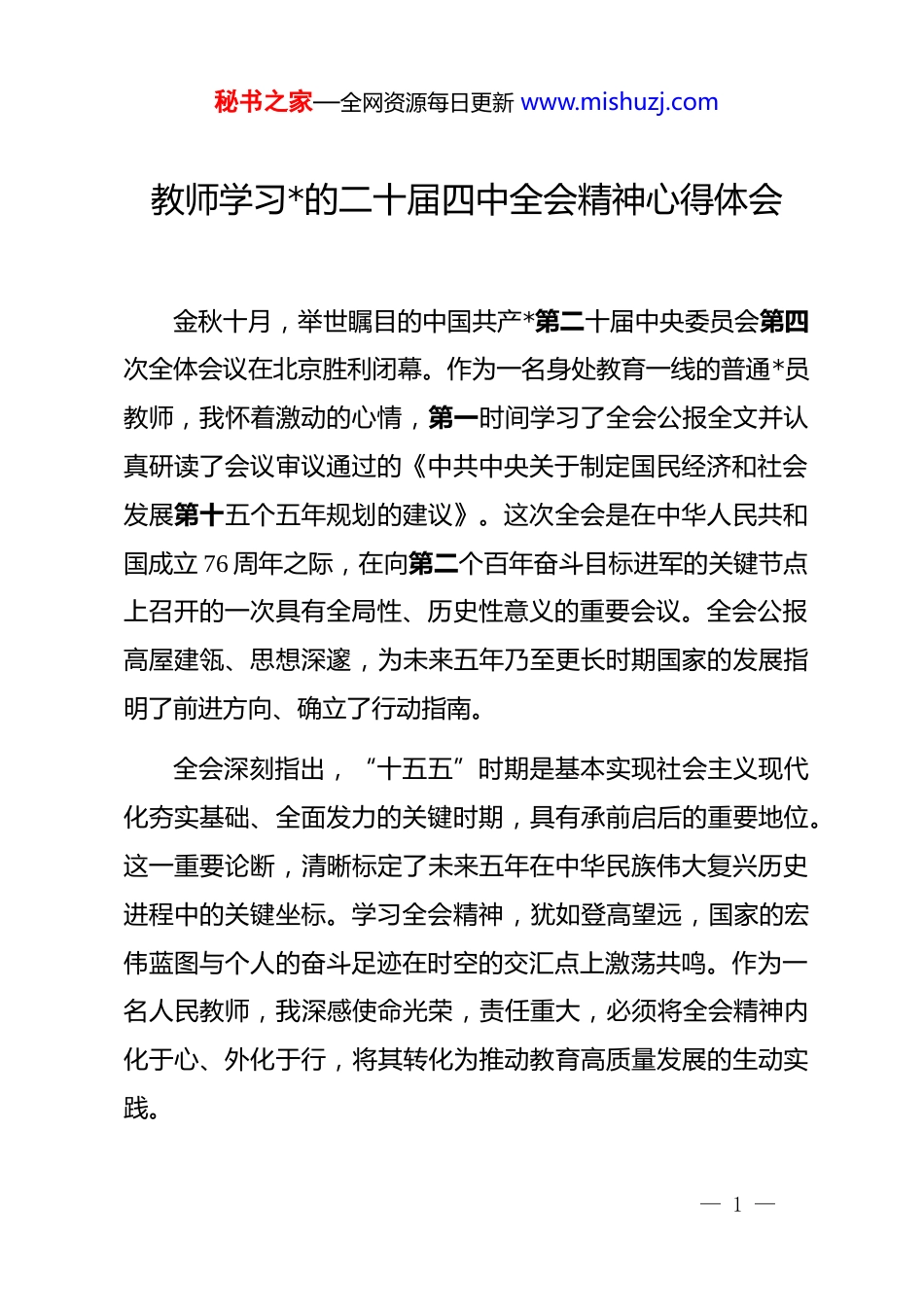 秘书之家—全网资源每日更新 www.mishuzj.com教师学习*的二十届四中全会精神心得体会金秋十月,举世瞩目的中国共产*第二十届中央委员会第四次全体会议在北京胜利闭幕。作为一名身处教育一线的普通*员教师,我怀着激动的心情,第一时间学习了全会公报全文并认真研读了会议审议通过的《中共中央关于制定国民经济和社会发展第十五个五年规划的建议》。这次全会是在中华人民共和国成立 76 周年之际,在向第二个百年奋斗目标进军的关键节点上召开的一次具有全局性、历史性意义的重要会议。全会公报高屋建瓴、思想深邃,为未来五年乃至更长时期国家的发展指明了前进方向、确立了行动指南。全会深刻指出,“十五五”时期是基本实现社会主义现代化夯实基础、全面发力的关键时期,具有承前启后的重要地位。这一重要论断,清晰标定了未来五年在中华民族伟大复兴历史进程中的关键坐标。学习全会精神,犹如登高望远,国家的宏伟蓝图与个人的奋斗足迹在时空的交汇点上激荡共鸣。作为一名人民教师,我深感使命光荣,责任重大,必须将全会精神内化于心、外化于行,将其转化为推动教育高质量发展的生动实践。— 1 —秘书之家—全网资源每日更新 www.mishuzj.com一、深学细悟,准确把握全会精神的核心要义*的二十届四中全会精神内容丰富、博大精深,蕴含着一系列新思想、新论断、新部署。全会公报提出了一系列新概念、新观点、新论断,为我们提供了强大的思想武器和行动纲领。首先,要深刻领会“十五五”时期的战略定位与历史任务。全会强调,面对复杂严峻的国际环境和艰巨繁重的国内改革发展稳定任务,必须保持战略定力,增强必胜信心,积极识变应变求变,敢于斗争、善于斗争。这要求我们在日常工作中,必须具备更强的历史自觉和战略眼光,将教育工作置于国家发展的大棋局中去思考和谋划。其次,要准确把握“十五五”时期经济社会发展的指导原则和主要目标。全会提出了坚持*的全面领导、坚持人民至上、坚持高质量发展、坚持全面深化改革、坚持有效市场和有为政府相结合、坚持统筹发展和安全等六项重大原则。同时,明确了经济高质量发展、科技自立自强、社会文明程度、人民生活品质、美丽中国建设等方面的具体目标。这些原则和目标,构成了“十五五”时期发展的“四梁八柱”,也为教育事业的发展确立了价值导向和实践路径。— 2 —秘书之家—全网资源每日更新 www.mishuzj.com再者,要系统理解全会部署的十二项重大任务。这些任务涵盖了建设现代化产业体系、加快实现高水平科技自立自强、全面深化改革构建高水平社会主义市场经济体制、扩大高水平对外开放、推进乡村全面振兴、促进区域协调发展、加强社会主义先进文化建设、切实保障和改善民生、加快发展方式绿色转型、推进国家安全体系和能力现代化等方方面面。这十二项任务环环相扣、互为支撑,构成了一个系统完备的现代化建设施工图。特别值得注意的是,公报更加着眼于扩大内需,提出了“以新需求引领新供给,以新供给创造新需求”的互动理念,这对于我们思考教育如何服务于经济社会发展,具有深刻的启示意义。二、知行合一,将全会精神融入立德树人全过程学习的最终目的在于运用。作为一名 xx 小学的人民教师,贯彻落实二十届四中全会精神,最根本的就是要将其与立德树人的根本任务紧密结合,培养能够担当民族复兴大任的时代新人。第一,对接国家战略,更新教育教学内容。全会《建议》将“加快实现高水平科技自立自强”放到了突出位置。这为我们的教育工作发出了明确的信号。在日常教学中,不能再满足— 3 —秘书之家—全网资源每日更新 www.mishuzj.com于传统的知识传授,必须将科学精神、创新意识和实践能力的培养贯穿于各学科教学之中。在科学课上,要多设计一些探究性、开放性的实验,激发学生的好奇心和想象力。在信息技术课上,要引导学生了解人工智能、大数据等前沿科技,培养他们的数字素养。在语文、数学等基础学科中,也要有意识地融入逻辑思维、批判性思维的训练,为培养未来的创新人才打下坚实的基础。同时,全会提出的“加快发展方式绿色转型”和“加强社会主义先进文化建设”等任务,也要求我们在德育和美育工作中,...