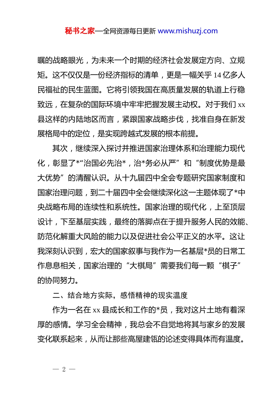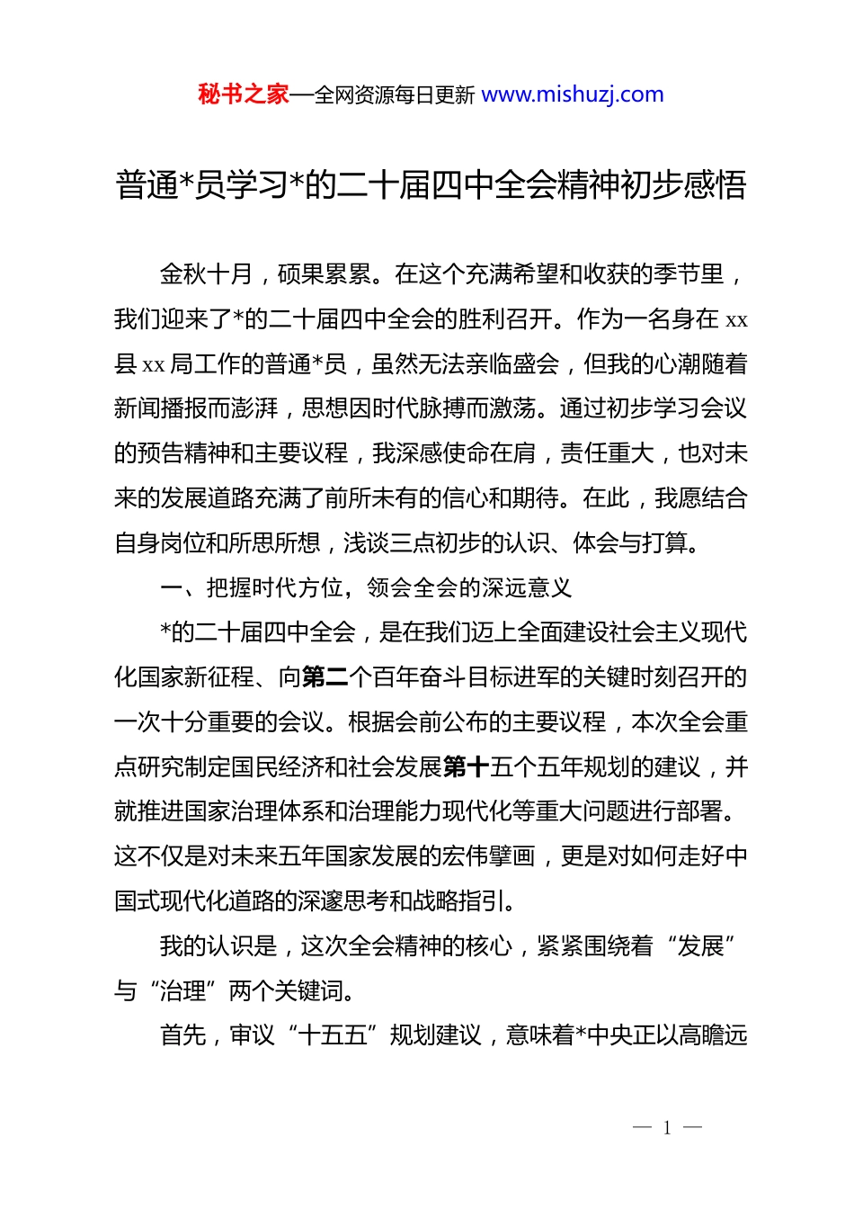 秘书之家—全网资源每日更新 www.mishuzj.com普通*员学习*的二十届四中全会精神初步感悟金秋十月,硕果累累。在这个充满希望和收获的季节里,我们迎来了*的二十届四中全会的胜利召开。作为一名身在 xx县 xx 局工作的普通*员,虽然无法亲临盛会,但我的心潮随着新闻播报而澎湃,思想因时代脉搏而激荡。通过初步学习会议的预告精神和主要议程,我深感使命在肩,责任重大,也对未来的发展道路充满了前所未有的信心和期待。在此,我愿结合自身岗位和所思所想,浅谈三点初步的认识、体会与打算。一、把握时代方位,领会全会的深远意义*的二十届四中全会,是在我们迈上全面建设社会主义现代化国家新征程、向第二个百年奋斗目标进军的关键时刻召开的一次十分重要的会议。根据会前公布的主要议程,本次全会重点研究制定国民经济和社会发展第十五个五年规划的建议,并就推进国家治理体系和治理能力现代化等重大问题进行部署。这不仅是对未来五年国家发展的宏伟擘画,更是对如何走好中国式现代化道路的深邃思考和战略指引。我的认识是,这次全会精神的核心,紧紧围绕着“发展”与“治理”两个关键词。首先,审议“十五五”规划建议,意味着*中央正以高瞻远— 1 —秘书之家—全网资源每日更新 www.mishuzj.com瞩的战略眼光,为未来一个时期的经济社会发展定方向、立规矩。这不仅仅是一份经济指标的清单,更是一幅关乎 14 亿多人民福祉的民生蓝图。它将引领我国在高质量发展的轨道上行稳致远,在复杂的国际环境中牢牢把握发展主动权。对于我们 xx县这样的内陆地区而言,紧跟国家战略步伐,找准自身在新发展格局中的定位,是实现跨越式发展的根本前提。其次,继续深入探讨并推进国家治理体系和治理能力现代化,彰显了*“治国必先治*,治*务必从严”和“制度优势是最大优势”的清醒认识。从十九届四中全会专题研究国家制度和国家治理问题,到二十届四中全会继续深化这一主题体现了*中央战略布局的连续性和系统性。国家治理的现代化,上至顶层设计,下至基层实践,最终的落脚点在于提升服务人民的效能、防范化解重大风险的能力以及促进社会公平正义的水平。这让我深刻认识到,宏大的国家叙事与我作为一名基层*员的日常工作息息相关,国家治理的“大棋局”需要我们每一颗“棋子”的协同努力。二、结合地方实际,感悟精神的现实温度作为一名在 xx 县成长和工作的*员,我对这片土地有着深厚的感情。学习全会精神,我总会不自觉地将其与家乡的发展变化联系起来,从而让那些高屋建瓴的论述变得具体而有温度。— 2 —秘书之家—全网资源每日更新 www.mishuzj.com我体会到,推进“治理能力现代化”对于我们基层工作者而言,绝非一句空洞的口号,而是一场深刻的自我革命。回想过去,我们的一些工作方式或许还存在惯性思维,习惯于老经验、老办法;一些服务流程或许还不够优化,让群众和企业来回跑路;面对一些新出现的社会矛盾和问题,我们的应对能力有时也显得捉襟见肘。全会精神就像一面镜子,照见了我们工作中的“堵点”和个人能力上的“短板”。它提醒我,新时代呼唤新的能力,人民群众期待更高效、更公平、更温暖的公共服务。结合我们 xx 县的发展实际,这种体会尤为深刻。近年来,县委县政府大力推动新型工业化和新型城镇化,致力于培育壮大市场主体,力争到 2025 年实现一系列发展目标。例如,2024年我县的经济总量实现了 4.6%的增长,发展势头持续向好。然而,要将这些美好的蓝图变为现实,关键就在于治理。一个地区的核心竞争力,很大程度上就是其治理能力的竞争。优良的营商环境、高效的政务服务、和谐的社会秩序、美丽的生态环境,这些都是治理能力现代化的直接体现。当我看到全会精神强调这一点时,我感受到了一种强烈的共鸣和紧迫感。我所在的 xx 局,作为服务全县经济社会发展的一环,我们的工作作风、办事效率直接关系到政策的落地效果和群众的切身感受。全会— 3 —秘书之家—全网资源每日更新 www.mishuzj.com的精神,是对我最直接的动员和鞭策。三、立足本职岗位,践行使命的坚定步伐学习的目的在于应用,感悟的价值在于行动。面对二十届四中全会擘画的新征程...