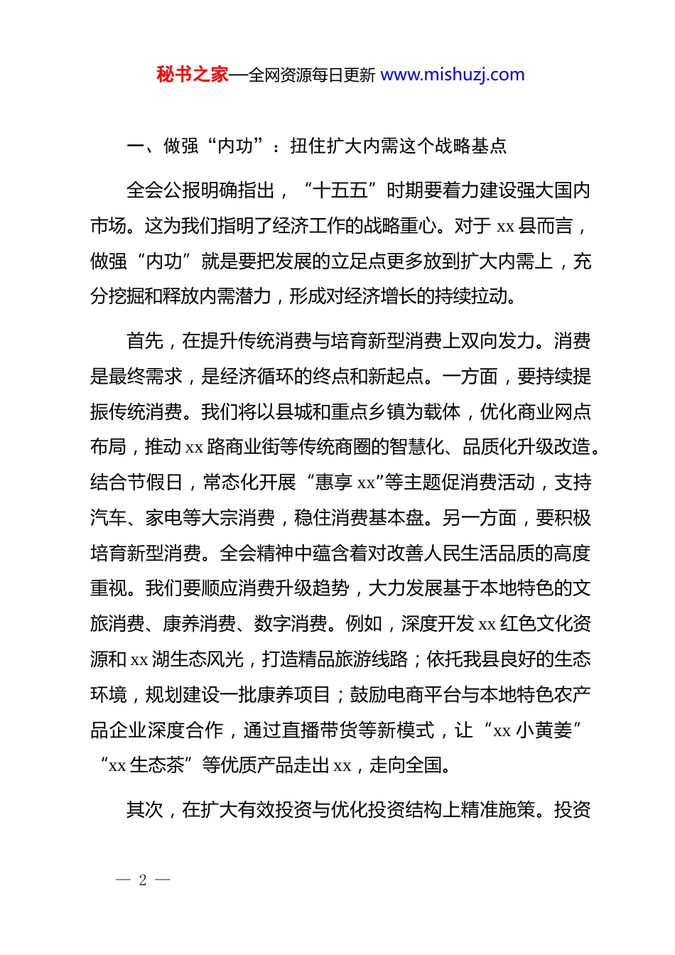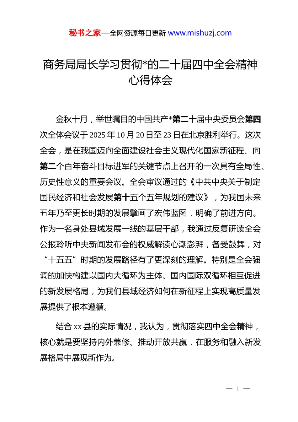 秘书之家—全网资源每日更新 www.mishuzj.com商务局局长学习贯彻*的二十届四中全会精神心得体会金秋十月,举世瞩目的中国共产*第二十届中央委员会第四次全体会议于 2025 年 10 月 20 日至 23 日在北京胜利举行。这次全会,是在我国迈向全面建设社会主义现代化国家新征程、向第二个百年奋斗目标进军的关键节点上召开的一次具有全局性、历史性意义的重要会议。全会审议通过的《中共中央关于制定国民经济和社会发展第十五个五年规划的建议》,为我国未来五年乃至更长时期的发展擘画了宏伟蓝图,明确了前进方向。作为一名身处县域发展一线的基层干部,我通过反复研读全会公报聆听中央新闻发布会的权威解读心潮澎湃,备受鼓舞,对“十五五”时期的发展路径有了更深刻的理解。特别是全会强调的加快构建以国内大循环为主体、国内国际双循环相互促进的新发展格局,为我们县域经济如何在新征程上实现高质量发展提供了根本遵循。结合 xx 县的实际情况,我认为,贯彻落实四中全会精神,核心就是要坚持内外兼修、推动开放共赢,在服务和融入新发展格局中展现新作为。— 1 —秘书之家—全网资源每日更新 www.mishuzj.com一、做强“内功”:扭住扩大内需这个战略基点全会公报明确指出,“十五五”时期要着力建设强大国内市场。这为我们指明了经济工作的战略重心。对于 xx 县而言,做强“内功”就是要把发展的立足点更多放到扩大内需上,充分挖掘和释放内需潜力,形成对经济增长的持续拉动。首先,在提升传统消费与培育新型消费上双向发力。消费是最终需求,是经济循环的终点和新起点。一方面,要持续提振传统消费。我们将以县城和重点乡镇为载体,优化商业网点布局,推动 xx 路商业街等传统商圈的智慧化、品质化升级改造。结合节假日,常态化开展“惠享 xx”等主题促消费活动,支持汽车、家电等大宗消费,稳住消费基本盘。另一方面,要积极培育新型消费。全会精神中蕴含着对改善人民生活品质的高度重视。我们要顺应消费升级趋势,大力发展基于本地特色的文旅消费、康养消费、数字消费。例如,深度开发 xx 红色文化资源和 xx 湖生态风光,打造精品旅游线路;依托我县良好的生态环境,规划建设一批康养项目;鼓励电商平台与本地特色农产品企业深度合作,通过直播带货等新模式,让“xx 小黄姜”“xx 生态茶”等优质产品走出 xx,走向全国。其次,在扩大有效投资与优化投资结构上精准施策。投资— 2 —秘书之家—全网资源每日更新 www.mishuzj.com是连接供需两端的关键环节。我们要摒弃“大水漫灌”的粗放投资模式,围绕全会提出的建设现代化产业体系和加强基础设施建设的要求,把资金投向强基础、增后劲、利长远的领域。当前,xx 县正处于转型升级的关键期,我们将聚焦“xx 新能源产业园”和“xx 高端装备制造配套基地”两大主导产业,加大产业链招商力度,吸引更多优质项目落地,形成产业集聚效应。同时,积极争取上级资金,加快推进 5g 基站、工业互联网、充电桩等新型基础设施建设,为数字经济发展提供坚实支撑。在民生领域,将继续加大对教育、医疗、养老等公共服务设施的投入,补齐民生短板,让发展成果更多更公平惠及全县人民。最后,在完善内需体系与激发内生动力上深化改革。构建强大的内需体系,离不开通畅的经济循环和充满活力的市场主体。我们将坚决贯彻全会关于构建高水平社会主义市场经济体制的精神持续深化“放管服”改革,全力打造市场化、法治化、国际化的一流营商环境。通过简化审批流程、降低制度性交易成本、加强知识产权保护等措施,让国企敢干、民企敢闯、外企敢投。激发市场主体的活力,特别是支持我县一批“专精特新”中小企业发展壮大,是激发经济内生动力的关键所在。二、善借“外力”:实行更高水平对外开放— 3 —秘书之家—全网资源每日更新 www.mishuzj.com全会强调,要实行更高水平对外开放,拓展中国式现代化的发展空间。身处内陆地区的 xx 县,虽然不沿边、不靠海,但在新发展格局下,对外开放同样大有可为。我们必须破除“内陆思维”,树立“开放思维”,善于借用外部资源、技术和市场,为县域发展注入新动能。第一,以优...