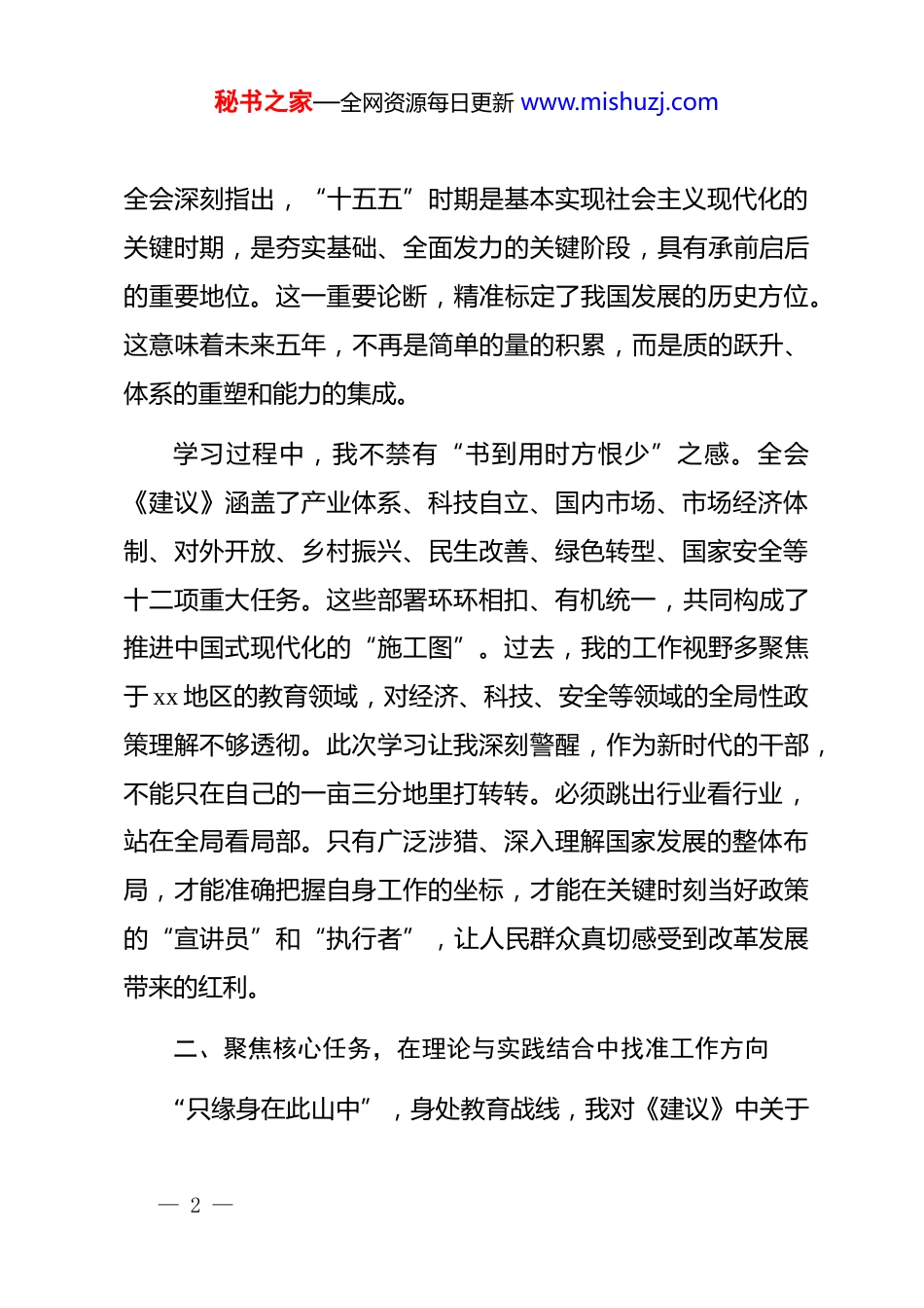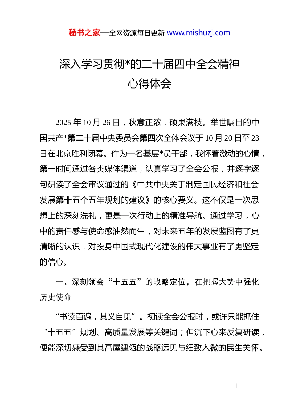 秘书之家—全网资源每日更新 www.mishuzj.com深入学习贯彻*的二十届四中全会精神心得体会2025 年 10 月 26 日,秋意正浓,硕果满枝。举世瞩目的中国共产*第二十届中央委员会第四次全体会议于 10 月 20 日至 23日在北京胜利闭幕。作为一名基层*员干部,我怀着激动的心情,第一时间通过各类媒体渠道,认真学习了全会公报,并逐字逐句研读了全会审议通过的《中共中央关于制定国民经济和社会发展第十五个五年规划的建议》的核心要义。这不仅是一次思想上的深刻洗礼,更是一次行动上的精准导航。通过学习,心中的责任感与使命感油然而生,对未来五年的发展蓝图有了更清晰的认识,对投身中国式现代化建设的伟大事业有了更坚定的信心。一、深刻领会“十五五”的战略定位,在把握大势中强化历史使命“书读百遍,其义自见”。初读全会公报时,或许只能抓住“十五五”规划、高质量发展等关键词;但沉下心来反复研读,便能深切感受到其高屋建瓴的战略远见与细致入微的民生关怀。— 1 —秘书之家—全网资源每日更新 www.mishuzj.com全会深刻指出,“十五五”时期是基本实现社会主义现代化的关键时期,是夯实基础、全面发力的关键阶段,具有承前启后的重要地位。这一重要论断,精准标定了我国发展的历史方位。这意味着未来五年,不再是简单的量的积累,而是质的跃升、体系的重塑和能力的集成。学习过程中,我不禁有“书到用时方恨少”之感。全会《建议》涵盖了产业体系、科技自立、国内市场、市场经济体制、对外开放、乡村振兴、民生改善、绿色转型、国家安全等十二项重大任务。这些部署环环相扣、有机统一,共同构成了推进中国式现代化的“施工图”。过去,我的工作视野多聚焦于 xx 地区的教育领域,对经济、科技、安全等领域的全局性政策理解不够透彻。此次学习让我深刻警醒,作为新时代的干部,不能只在自己的一亩三分地里打转转。必须跳出行业看行业,站在全局看局部。只有广泛涉猎、深入理解国家发展的整体布局,才能准确把握自身工作的坐标,才能在关键时刻当好政策的“宣讲员”和“执行者”,让人民群众真切感受到改革发展带来的红利。二、聚焦核心任务,在理论与实践结合中找准工作方向“只缘身在此山中”,身处教育战线,我对《建议》中关于— 2 —秘书之家—全网资源每日更新 www.mishuzj.com科技、教育、人才的论述感受尤为深刻。全会再次强调了教育、科技、人才是中国式现代化的基础性、战略性支撑,并将“加快实现高水平科技自立自强”作为“十五五”时期的重大任务之一。这为我们基层教育工作指明了核心方向和根本遵循。国家间的竞争,归根结底是科技和人才的竞争,而人才培养的根基在教育。作为 xx 局的一员,我深知,我们肩负的不仅仅是传授知识的责任,更是为国家未来播种创新火种的使命。过去,升学压力、评价单一等问题给学生、家长乃至整个社会带来了困扰。对照全会精神,我认为必须以更大的决心和勇气推动变革。首先,要以服务国家战略需求为导向,重塑人才培养模式。全会强调要推动科技创新与产业创新深度融合,发展新兴产业和未来产业。这就要求我们的教育体系必须做出快速响应。在基础教育阶段,需要进一步加强科学、技术、工程和数学教育,激发学生的好奇心和探究欲,培养他们的创新思维和实践能力,为拔尖创新人才的涌现提供肥沃土壤。在职业教育层面,则应深化产教融合,紧密对接 xx 地区乃至国家的产业链、创新链,培养更多高素质的技术技能人才、能工巧匠。其次,要以立德树人为根本,构建和谐健康的教育生态。— 3 —秘书之家—全网资源每日更新 www.mishuzj.com全会提出的主要目标中包括“社会文明程度得到新提升”。这要求我们必须把思想道德建设放在更加突出的位置。要创新德育模式,将社会主义核心价值观融入教育教学全过程,引导学生树立正确的国家观、历史观、民族观。同时,深化家校社协同育人机制,加强对家庭教育的指导,整合社区资源,共同营造一个摒弃功利、回归育人本质的良好环境,让孩子们能够身心健康、全面发展。再者,要统筹发展与安全,筑牢教育系统的安全防线。全会提出的六大原则之一便是“坚持统筹发展和安全”。...