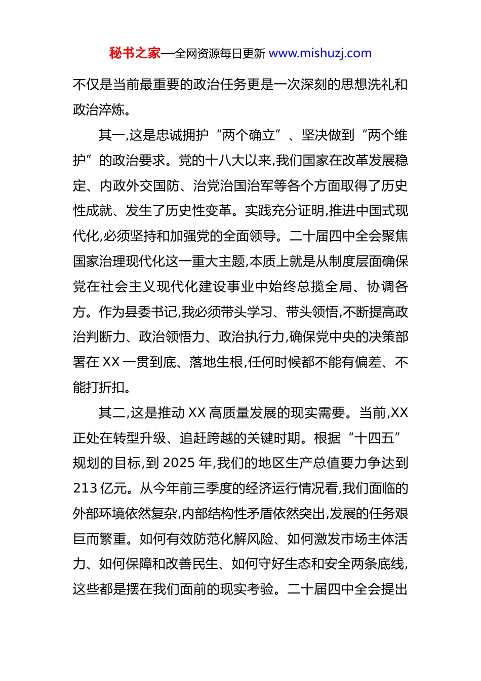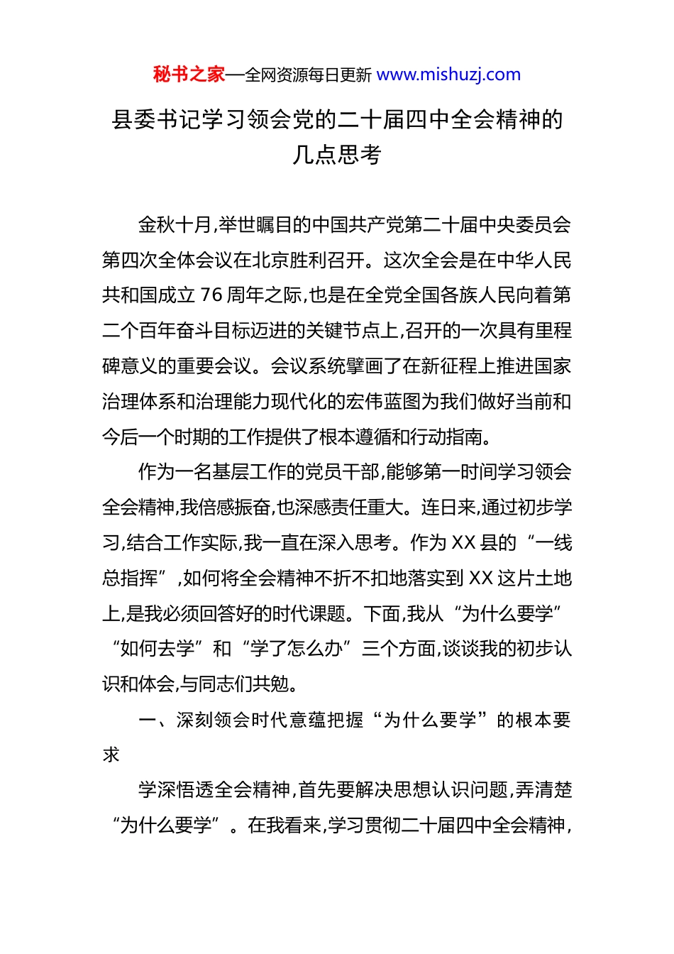 秘书之家—全网资源每日更新 www.mishuzj.com县委书记学习领会党的二十届四中全会精神的几点思考 金秋十月,举世瞩目的中国共产党第二十届中央委员会第四次全体会议在北京胜利召开。这次全会是在中华人民共和国成立 76 周年之际,也是在全党全国各族人民向着第二个百年奋斗目标迈进的关键节点上,召开的一次具有里程碑意义的重要会议。会议系统擘画了在新征程上推进国家治理体系和治理能力现代化的宏伟蓝图为我们做好当前和今后一个时期的工作提供了根本遵循和行动指南。作为一名基层工作的党员干部,能够第一时间学习领会全会精神,我倍感振奋,也深感责任重大。连日来,通过初步学习,结合工作实际,我一直在深入思考。作为 XX 县的“一线总指挥”,如何将全会精神不折不扣地落实到 XX 这片土地上,是我必须回答好的时代课题。下面,我从“为什么要学”“如何去学”和“学了怎么办”三个方面,谈谈我的初步认识和体会,与同志们共勉。一、深刻领会时代意蕴把握“为什么要学”的根本要求学深悟透全会精神,首先要解决思想认识问题,弄清楚“为什么要学”。在我看来,学习贯彻二十届四中全会精神,秘书之家—全网资源每日更新 www.mishuzj.com不仅是当前最重要的政治任务更是一次深刻的思想洗礼和政治淬炼。其一,这是忠诚拥护“两个确立”、坚决做到“两个维护”的政治要求。党的十八大以来,我们国家在改革发展稳定、内政外交国防、治党治国治军等各个方面取得了历史性成就、发生了历史性变革。实践充分证明,推进中国式现代化,必须坚持和加强党的全面领导。二十届四中全会聚焦国家治理现代化这一重大主题,本质上就是从制度层面确保党在社会主义现代化建设事业中始终总揽全局、协调各方。作为县委书记,我必须带头学习、带头领悟,不断提高政治判断力、政治领悟力、政治执行力,确保党中央的决策部署在 XX 一贯到底、落地生根,任何时候都不能有偏差、不能打折扣。其二,这是推动 XX 高质量发展的现实需要。当前,XX正处在转型升级、追赶跨越的关键时期。根据“十四五”规划的目标,到 2025 年,我们的地区生产总值要力争达到213 亿元。从今年前三季度的经济运行情况看,我们面临的外部环境依然复杂,内部结构性矛盾依然突出,发展的任务艰巨而繁重。如何有效防范化解风险、如何激发市场主体活力、如何保障和改善民生、如何守好生态和安全两条底线,这些都是摆在我们面前的现实考验。二十届四中全会提出秘书之家—全网资源每日更新 www.mishuzj.com的关于推进国家治理体系和治理能力现代化的新理念、新思想、新战略,就像一把“金钥匙”,为我们破解发展难题、厚植发展优势提供了科学指引。不学深、不悟透,就可能在工作中迷失方向,错失发展机遇。其三,这是提升干部队伍履职能力的内在逻辑。推进治理能力现代化,关键在人,关键在干部。面对新形势新任务,我们的一些干部或多或少还存在本领恐慌、能力赤字的问题。有的习惯于老办法、旧路径,对新发展理念理解不深;有的攻坚克难的锐气不足,存在“躺平”心态;有的服务群众的意识和能力不强,工作方法简单。学习全会精神,就是要引导全县广大党员干部,特别是领导干部,主动对标对表中央的新要求,来一次思想观念的大更新、能力素质的大提升、工作作风的大转变,从而更好地肩负起时代赋予我们的重任。二、坚持理论联系实际探索“如何去学”的有效路径学习领会全会精神,不能停留在口号上,更不能满足于“一知半解”,必须下足“真学、真懂、真信、真用”的功夫。我感到,要真正学到精髓、悟透要义,必须坚持以下几个结合。一是坚持原原本本学与融会贯通学相结合。学习全会精神,首先要静下心来,原原本本、逐字逐句地研读全会公报以及审议通过的《决定》等重要文件。只有吃透了原文,才秘书之家—全网资源每日更新 www.mishuzj.com能准确把握其精神实质和核心要义。同时,要把学习全会精神同学习党的二十大精神结合起来,同学习历次中央全会精神贯通起来,特别是要与十九届四中全会关于国家治理体系和治理能力现代化的《决定》对比学习,深刻理解党中央在不同历史阶段对这一重大课题的战略考量和部署,从而形成一个系统、完整、立体的认识。二是坚持“关键少数”带头学与“绝...