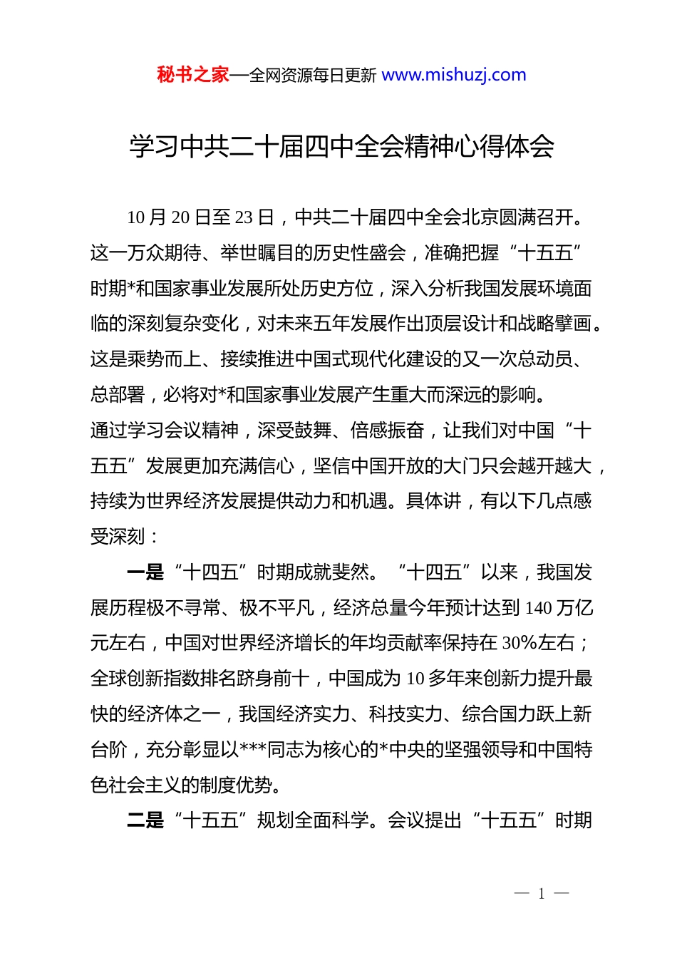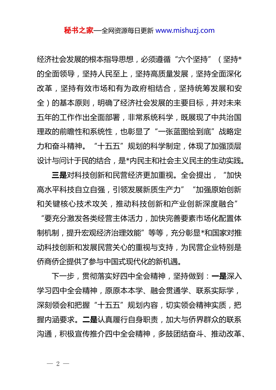 秘书之家—全网资源每日更新 www.mishuzj.com学习中共二十届四中全会精神心得体会10 月 20 日至 23 日,中共二十届四中全会北京圆满召开。这一万众期待、举世瞩目的历史性盛会,准确把握“十五五”时期*和国家事业发展所处历史方位,深入分析我国发展环境面临的深刻复杂变化,对未来五年发展作出顶层设计和战略擘画。这是乘势而上、接续推进中国式现代化建设的又一次总动员、总部署,必将对*和国家事业发展产生重大而深远的影响。通过学习会议精神,深受鼓舞、倍感振奋,让我们对中国“十五五”发展更加充满信心,坚信中国开放的大门只会越开越大,持续为世界经济发展提供动力和机遇。具体讲,有以下几点感受深刻:一是“十四五”时期成就斐然。“十四五”以来,我国发展历程极不寻常、极不平凡,经济总量今年预计达到 140 万亿元左右,中国对世界经济增长的年均贡献率保持在 30%左右;全球创新指数排名跻身前十,中国成为 10 多年来创新力提升最快的经济体之一,我国经济实力、科技实力、综合国力跃上新台阶,充分彰显以***同志为核心的*中央的坚强领导和中国特色社会主义的制度优势。二是“十五五”规划全面科学。会议提出“十五五”时期— 1 —秘书之家—全网资源每日更新 www.mishuzj.com经济社会发展的根本指导思想,必须遵循“六个坚持”(坚持*的全面领导,坚持人民至上,坚持高质量发展,坚持全面深化改革,坚持有效市场和有为政府相结合,坚持统筹发展和安全)的基本原则,明确了经济社会发展的主要目标,并对未来五年的工作作出全面部署,非常系统科学,既展现了中共治国理政的前瞻性和系统性,也彰显了“一张蓝图绘到底”战略定力和奋斗精神。“十五五”规划的科学制定,体现了加强顶层设计与问计于民的结合,是*内民主和社会主义民主的生动实践。三是对科技创新和民营经济更加重视。全会提出,“加快高水平科技自立自强,引领发展新质生产力”“加强原始创新和关键核心技术攻关,推动科技创新和产业创新深度融合”“要充分激发各类经营主体活力,加快完善要素市场化配置体制机制,提升宏观经济治理效能”等等,充分彰显*和国家对推动科技创新和发展民营关心的重视与支持,为民营企业特别是侨商侨企提供了参与中国式现代化的新机遇。下一步,贯彻落实好四中全会精神,坚持做到:一是深入学习四中全会精神,原原本本学、融会贯通学、联系实际学,深刻领会和把握“十五五”规划内容,切实领会精神实质,把握内涵要求。二是认真履行自身职责,加大与侨界群众的联系沟通,积极宣传推介四中全会精神,多鼓团结奋斗、推动改革、— 2 —秘书之家—全网资源每日更新 www.mishuzj.com共促发展的干劲,多提实心实意、真招实策的建言,为推进经济社会发展尽职尽力。三是发挥侨界优势,以自己的亲身经历讲好中国故事,把所见所闻正能量传递给身边的每一个人,向世界展现可信、可爱、可敬的中国形象,为增强中国软实力贡献力量;坚持以侨为桥、以侨引智、以侨引才,宣传好山东这块投资热土,为地方“双招双引”发挥积极作用。四是坚持把四中全会精神转化为干事创业的内在动力,贯穿于事业发展的全过程,坚持实干兴邦,聚焦实体产业,下力抓好所属企业的工业打印机、钠离子电池、科技产业园等,以实干实绩诠释责任担当,为推进中国式现代化作出更大贡献。提一点建议:关注并着力解决民营企业面临的突出困境,坚定企业发展信心。当前的主要问题是,市场需求不足,民营企业营收增速明显下滑,行业“内卷”加剧,综合成本持续上涨,企业利润低,民营企业经营艰难。特别是六成以上房地产企业出现亏损,超半数企业在手现金无法覆盖一年内到期债务,具有较大风险。建议实施政策精准发力,针对民营企业的不同困难,采取税费减免、利率优惠、政府收储去库存等,下力纾困解难,帮助民营企业渡过难关,坚定发展信心,助力高质量发展。— 3 —