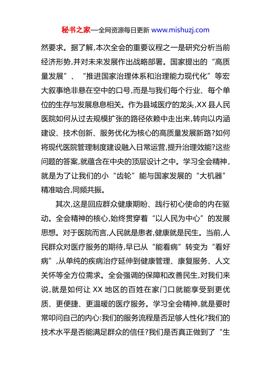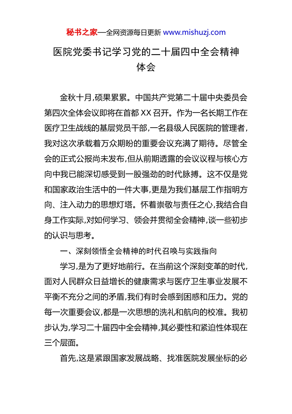 秘书之家—全网资源每日更新 www.mishuzj.com医院党委书记学习党的二十届四中全会精神体会 金秋十月,硕果累累。中国共产党第二十届中央委员会第四次全体会议即将在首都 XX 召开。作为一名长期工作在医疗卫生战线的基层党员干部,一名县级人民医院的管理者,我对这次承载着万众期盼的重要会议充满了期待。尽管全会的正式公报尚未发布,但从前期透露的会议议程与核心方向中我已能深切感受到一股强劲的时代脉搏。这不仅是党和国家政治生活中的一件大事,更是为我们基层工作指明方向、注入动力的思想灯塔。怀着崇敬与责任之心,我结合自身工作实际,对如何学习、领会并贯彻全会精神,谈一些初步的认识与思考。一、深刻领悟全会精神的时代召唤与实践指向学习,是为了更好地前行。在当前这个深刻变革的时代,面对人民群众日益增长的健康需求与医疗卫生事业发展不平衡不充分之间的矛盾,我们有时会感到困惑和压力。党的每一次重要会议,都是一次思想的洗礼和航向的校准。我初步认为,学习二十届四中全会精神,其必要性和紧迫性体现在三个层面。首先,这是紧跟国家发展战略、找准医院发展坐标的必秘书之家—全网资源每日更新 www.mishuzj.com然要求。据了解,本次全会的重要议程之一是研究分析当前经济形势,并对未来发展作出战略部署。国家提出的“高质量发展”、“推进国家治理体系和治理能力现代化”等宏大叙事绝非悬在空中的口号,而是与我们每个行业、每个单位的生存与发展息息相关。作为县域医疗的龙头,XX 县人民医院如何从过去规模扩张的路径依赖中走出来,转向以内涵建设、技术创新、服务优化为核心的高质量发展新路?如何将现代医院管理制度建设融入日常运营,提升治理效能?这些问题的答案,就蕴含在中央的顶层设计之中。学习全会精神,就是为了让我们的小“齿轮”能与国家发展的“大机器”精准啮合,同频共振。其次,这是回应群众健康期盼、践行初心使命的内在驱动。全会精神的核心,始终贯穿着“以人民为中心”的发展思想。对于医院而言,人民就是患者,健康就是民生。当前,人民群众对医疗服务的期待,早已从“能看病”转变为“看好病”,从单纯的疾病治疗延伸到健康管理、康复服务、人文关怀等全方位需求。全会强调的保障和改善民生,对我们来说,就是如何让 XX 地区的百姓在家门口就能享受到更优质、更便捷、更温暖的医疗服务。学习全会精神,就是要时常叩问自己的内心:我们的服务流程是否足够人性化?我们的技术水平是否能满足群众的信任?我们是否真正做到了“生秘书之家—全网资源每日更新 www.mishuzj.com命至上”?这种学习,能帮助我们不断擦亮“人民医院为人民”的底色。最后,这是应对行业变革挑战、实现自我革新的迫切需要。医药卫生体制改革已进入深水区,DIP 支付方式改革的全面推行公立医院绩效考核的指挥棒作用、医疗反腐的高压态势都对医院的精细化管理和运营能力提出了前所未有的挑战。这些变革,本质上都是国家治理能力现代化在卫生健康领域的具体体现。全会关于深化改革、防范化解风险的部署为我们指明了改革的方向和底线。只有通过深入学习,我们才能准确理解政策背后的逻辑,变被动应付为主动适应,化外部压力为内生动力,在严峻的挑战中抓住转型升级的机遇,确保医院在复杂的环境中行稳致远。二、坚持融会贯通在学思践悟中求得真知学习领会全会精神,不能停留在读读文件、听听报告的浅表层面,必须下“绣花”功夫,做到入脑入心、知行合一。作为医院的“班长”,我感到自己首先要当好学习的表率,并带领全院干部职工,探索一套行之有效的学习方法。一是要原原本本学,力求吃透精神实质。待全会公报和相关决议文件发布后,第一时间组织原原本本、逐字逐句地学习。不仅要学习其中的新思想、新论断、新部署,更要深刻领会贯穿其中的立场、观点和方法。要将学习全会精神秘书之家—全网资源每日更新 www.mishuzj.com与学习党的二十大精神以及习近平总书记关于卫生健康工作的重要论述结合起来,形成一个完整的理论体系。只有在“深”字上下功夫,才能避免理解上的片面化和碎片化。二是要带着问题学,力求对接医院实际。学习不能“空对空”,必须紧密联系医院发展的实际和个人思想工作的实际。我计划在学习过程...