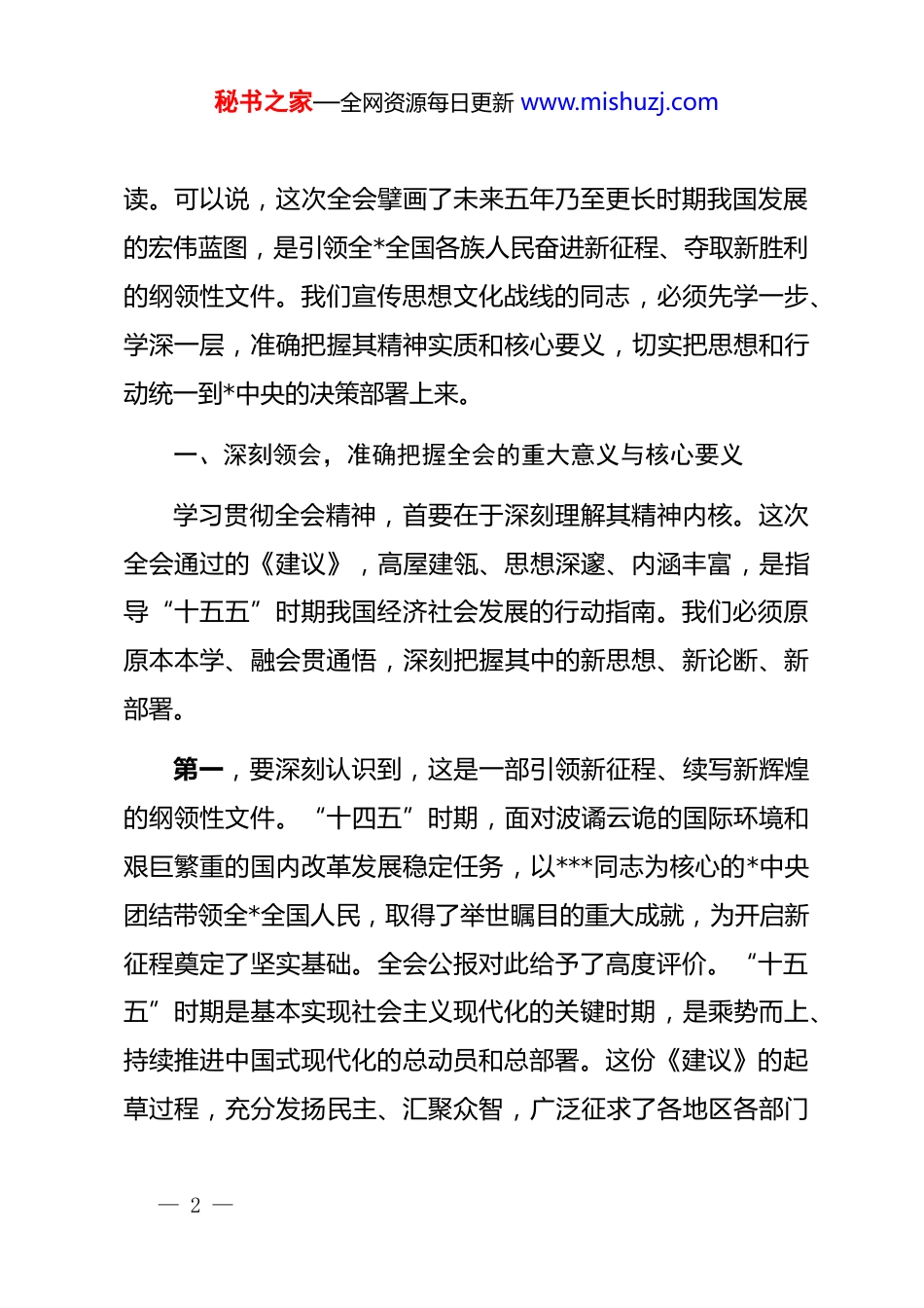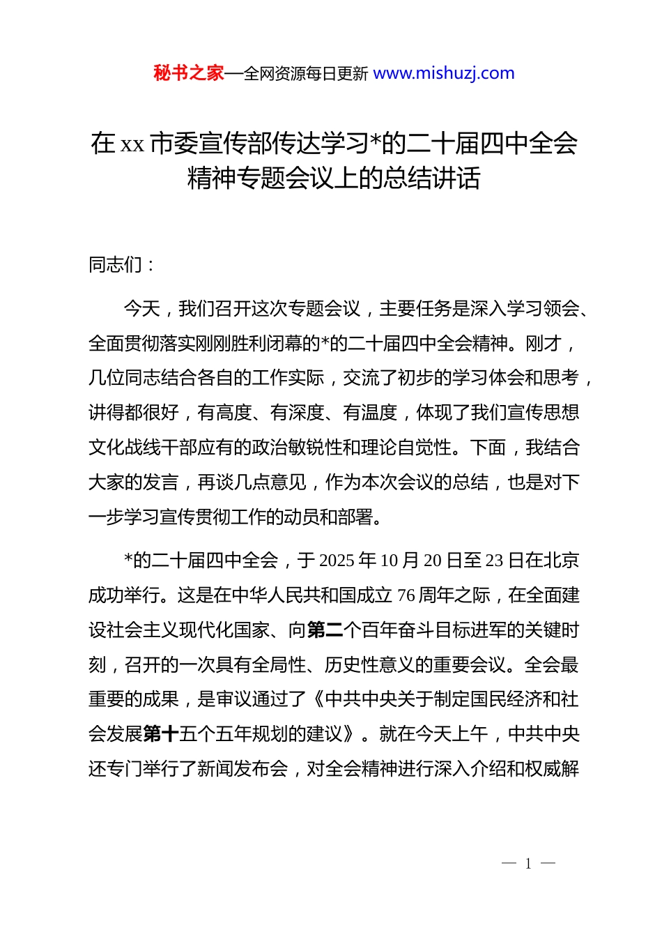 秘书之家—全网资源每日更新 www.mishuzj.com在 xx 市委宣传部传达学习*的二十届四中全会精神专题会议上的总结讲话同志们:今天,我们召开这次专题会议,主要任务是深入学习领会、全面贯彻落实刚刚胜利闭幕的*的二十届四中全会精神。刚才,几位同志结合各自的工作实际,交流了初步的学习体会和思考,讲得都很好,有高度、有深度、有温度,体现了我们宣传思想文化战线干部应有的政治敏锐性和理论自觉性。下面,我结合大家的发言,再谈几点意见,作为本次会议的总结,也是对下一步学习宣传贯彻工作的动员和部署。*的二十届四中全会,于 2025 年 10 月 20 日至 23 日在北京成功举行。这是在中华人民共和国成立 76 周年之际,在全面建设社会主义现代化国家、向第二个百年奋斗目标进军的关键时刻,召开的一次具有全局性、历史性意义的重要会议。全会最重要的成果,是审议通过了《中共中央关于制定国民经济和社会发展第十五个五年规划的建议》。就在今天上午,中共中央还专门举行了新闻发布会,对全会精神进行深入介绍和权威解— 1 —秘书之家—全网资源每日更新 www.mishuzj.com读。可以说,这次全会擘画了未来五年乃至更长时期我国发展的宏伟蓝图,是引领全*全国各族人民奋进新征程、夺取新胜利的纲领性文件。我们宣传思想文化战线的同志,必须先学一步、学深一层,准确把握其精神实质和核心要义,切实把思想和行动统一到*中央的决策部署上来。一、深刻领会,准确把握全会的重大意义与核心要义学习贯彻全会精神,首要在于深刻理解其精神内核。这次全会通过的《建议》,高屋建瓴、思想深邃、内涵丰富,是指导“十五五”时期我国经济社会发展的行动指南。我们必须原原本本学、融会贯通悟,深刻把握其中的新思想、新论断、新部署。第一,要深刻认识到,这是一部引领新征程、续写新辉煌的纲领性文件。“十四五”时期,面对波谲云诡的国际环境和艰巨繁重的国内改革发展稳定任务,以***同志为核心的*中央团结带领全*全国人民,取得了举世瞩目的重大成就,为开启新征程奠定了坚实基础。全会公报对此给予了高度评价。“十五五”时期是基本实现社会主义现代化的关键时期,是乘势而上、持续推进中国式现代化的总动员和总部署。这份《建议》的起草过程,充分发扬民主、汇聚众智,广泛征求了各地区各部门— 2 —秘书之家—全网资源每日更新 www.mishuzj.com各方面的意见和建议,是全过程人民民主的生动体现。文件分为三大板块,清晰阐明了“十五五”时期发展的重大意义、战略任务和重大举措,以及坚持*的全面领导、推进民主法治等保障措施为我们指明了前进方向,提供了根本遵循。第二,要深刻认识到,这是一幅擘画高质量发展、增进人民福祉的科学蓝图。高质量发展是全面建设社会主义现代化国家的首要任务。全会《建议》紧紧扭住这一主题,提出了一系列具有标志性的新目标和新举措。全会强调,推动“十五五”时期发展,必须遵循坚持*的全面领导、坚持以人民为中心、坚持高质量发展、坚持全面深化改革、坚持有效市场和有为政府相结合、坚持统筹发展和安全等六大原则。这六大原则,是我们应对未来风险挑战、推动事业发展的根本保证。全会提出了“十五五”时期的主要目标,涵盖了高质量发展取得新突破、科技自立自强能力实现新跃升、社会文明程度得到新提高、人民生活品质达到新水平、美丽中国建设迈出新步伐等多个方面。这些目标相互贯通、有机统一,描绘了一幅经济繁荣、科技进步、文化昌盛、社会和谐、生态优美的壮丽画卷。第三,要深刻认识到,这是一个统筹发展和安全、应对变局开新局的战略总览。当前和今后一个时期,我国发展仍然处— 3 —秘书之家—全网资源每日更新 www.mishuzj.com于重要战略机遇期,但面临的国内外环境正在发生深刻复杂变化。全会《建议》深刻洞察时与势,统筹中华民族伟大复兴战略全局和世界百年未有之大变局,强调要统筹推进“五位一体”总体布局,协调推进“四个全面”战略布局,将统筹发展和安全贯穿于国家发展各领域和全过程。全会提出的十二项重大部署,既包括建设现代化产业体系、加快实现高水平科技自立自强、着力扩大国内需求等发展任务,也...