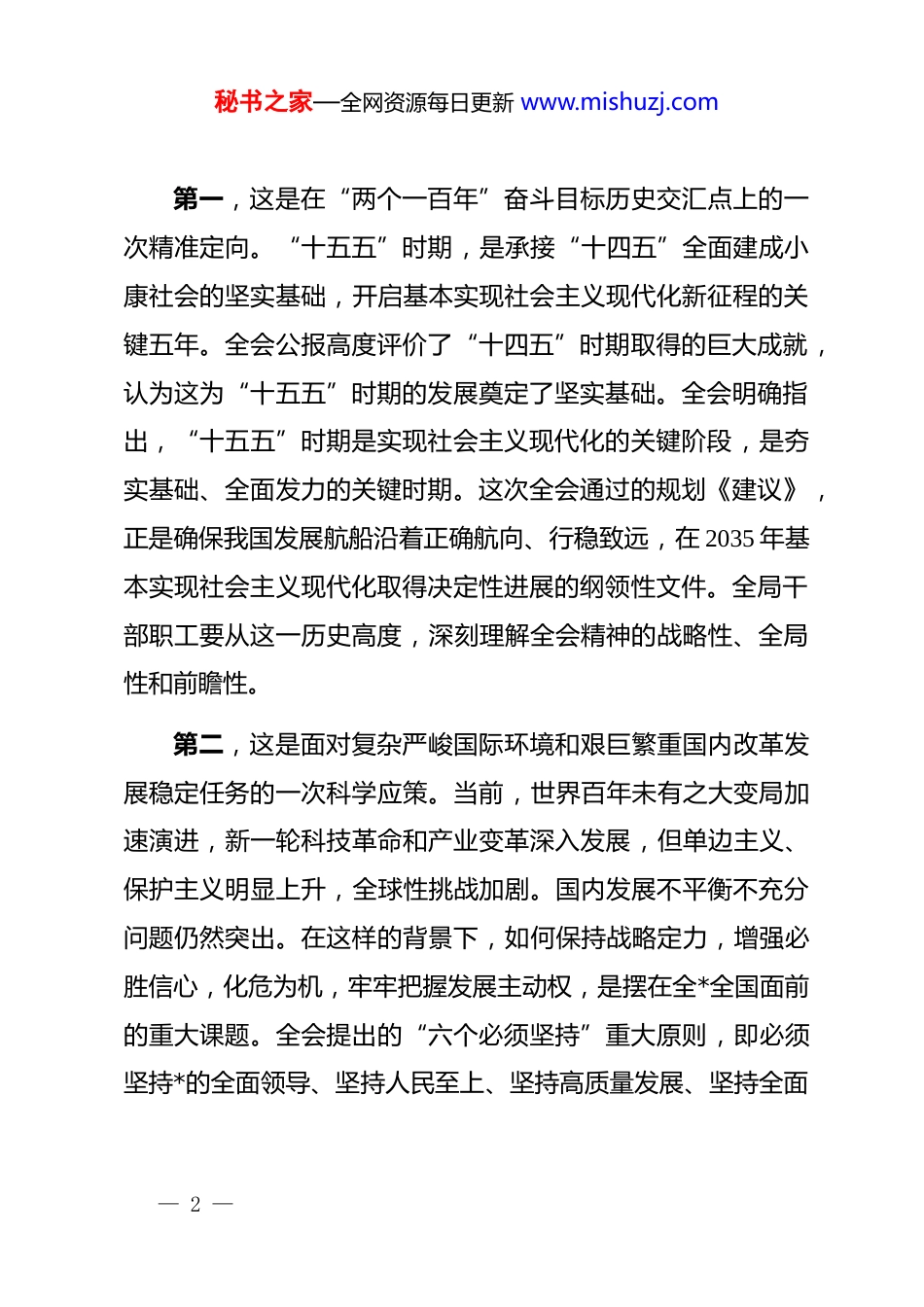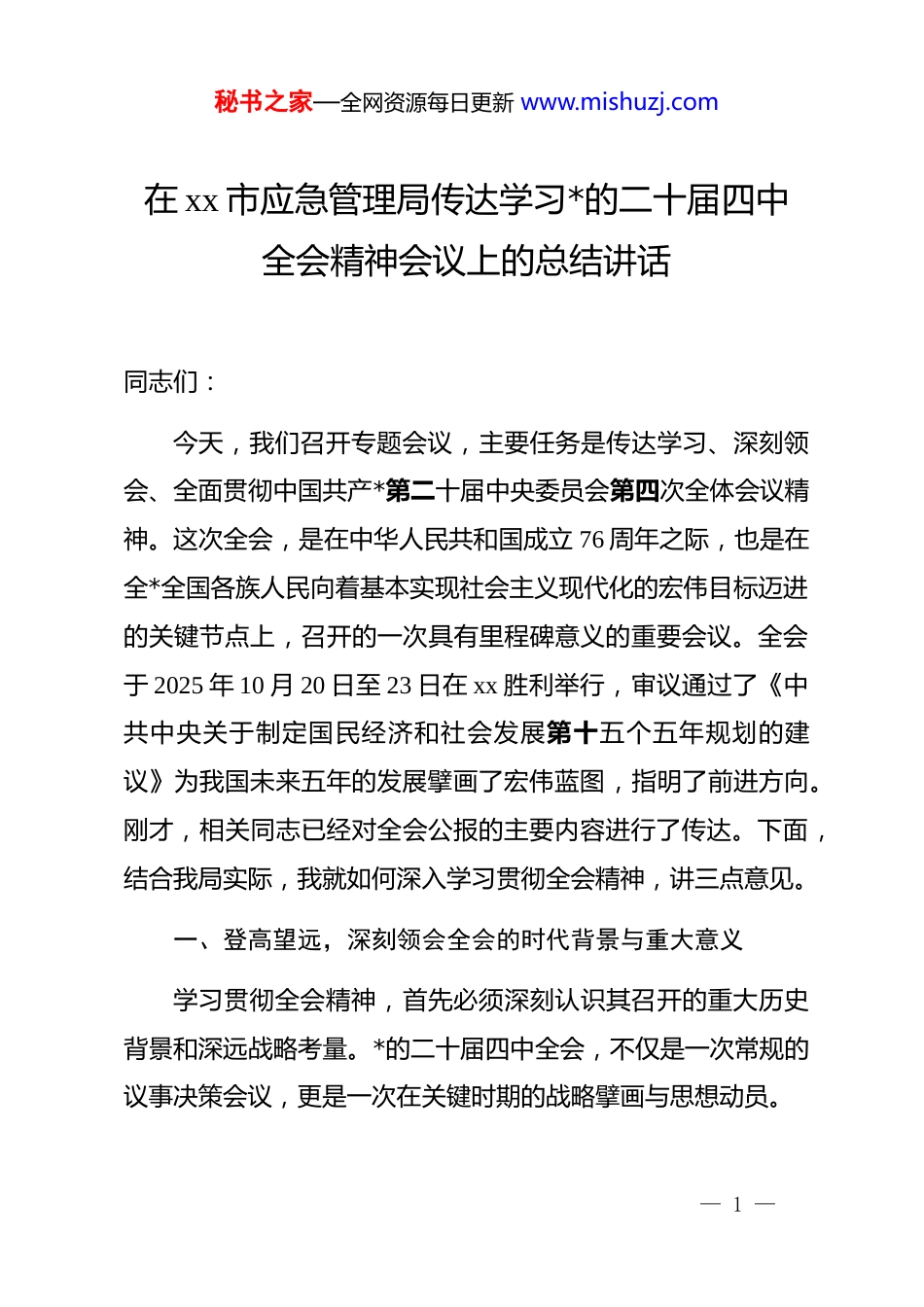 秘书之家—全网资源每日更新 www.mishuzj.com在 xx 市应急管理局传达学习*的二十届四中全会精神会议上的总结讲话同志们:今天,我们召开专题会议,主要任务是传达学习、深刻领会、全面贯彻中国共产*第二十届中央委员会第四次全体会议精神。这次全会,是在中华人民共和国成立 76 周年之际,也是在全*全国各族人民向着基本实现社会主义现代化的宏伟目标迈进的关键节点上,召开的一次具有里程碑意义的重要会议。全会于 2025 年 10 月 20 日至 23 日在 xx 胜利举行,审议通过了《中共中央关于制定国民经济和社会发展第十五个五年规划的建议》为我国未来五年的发展擘画了宏伟蓝图,指明了前进方向。刚才,相关同志已经对全会公报的主要内容进行了传达。下面,结合我局实际,我就如何深入学习贯彻全会精神,讲三点意见。一、登高望远,深刻领会全会的时代背景与重大意义学习贯彻全会精神,首先必须深刻认识其召开的重大历史背景和深远战略考量。*的二十届四中全会,不仅是一次常规的议事决策会议,更是一次在关键时期的战略擘画与思想动员。— 1 —秘书之家—全网资源每日更新 www.mishuzj.com第一,这是在“两个一百年”奋斗目标历史交汇点上的一次精准定向。“十五五”时期,是承接“十四五”全面建成小康社会的坚实基础,开启基本实现社会主义现代化新征程的关键五年。全会公报高度评价了“十四五”时期取得的巨大成就,认为这为“十五五”时期的发展奠定了坚实基础。全会明确指出,“十五五”时期是实现社会主义现代化的关键阶段,是夯实基础、全面发力的关键时期。这次全会通过的规划《建议》,正是确保我国发展航船沿着正确航向、行稳致远,在 2035 年基本实现社会主义现代化取得决定性进展的纲领性文件。全局干部职工要从这一历史高度,深刻理解全会精神的战略性、全局性和前瞻性。第二,这是面对复杂严峻国际环境和艰巨繁重国内改革发展稳定任务的一次科学应策。当前,世界百年未有之大变局加速演进,新一轮科技革命和产业变革深入发展,但单边主义、保护主义明显上升,全球性挑战加剧。国内发展不平衡不充分问题仍然突出。在这样的背景下,如何保持战略定力,增强必胜信心,化危为机,牢牢把握发展主动权,是摆在全*全国面前的重大课题。全会提出的“六个必须坚持”重大原则,即必须坚持*的全面领导、坚持人民至上、坚持高质量发展、坚持全面— 2 —秘书之家—全网资源每日更新 www.mishuzj.com深化改革、坚持有效市场与有为政府相结合、坚持统筹发展和安全就是对这些重大课题的响亮回答。特别是“坚持统筹发展和安全”这一原则,直接关系到我们应急管理工作的根本定位和核心使命。第三,这是推动中国式现代化理论和实践创新的一次集中体现。全会围绕“十五五”规划建议,提出了一系列新概念、新观点、新论断,系统部署了建设现代化产业体系、实现高水平科技自立自强、全面推进乡村振兴、促进区域协调发展、保障和改善民生、推动绿色转型、维护国家安全等十二个方面的重大任务。这些部署,既是对*的二十大精神的深化和具体化,也是对中国式现代化道路的进一步探索和丰富。它告诉我们,应急管理工作必须主动融入国家发展大局,在服务和保障中国式现代化建设的进程中找准定位、展现作为。二、融会贯通,准确把握全会精神的核心要义与实践要求学习领会全会精神,关键在于准确把握其精神实质和核心要义,并以此统一思想、凝聚共识、指导行动。全局上下要原原本本、逐字逐句学习公报全文,深刻领会其中蕴含的丰富内涵。— 3 —秘书之家—全网资源每日更新 www.mishuzj.com一要牢牢把握“高质量发展”这一首要任务。全会公报通篇贯穿着高质量发展这条主线。“十五五”规划建议的核心,就是要在质的有效提升和量的合理增长基础上,推动经济社会持续健康发展。对应到应急管理领域,高质量发展意味着更高水平的安全保障。没有安全,高质量发展就无从谈起。我们的工作不能仅仅满足于“不出事”,更要通过高质量的源头治理、风险防控、应急准备和救援处置,为 xx 市的经济社会高质量发展创造稳定、可预期的安全环境。这要求我们必须摒弃传统、粗放的管理模式,...