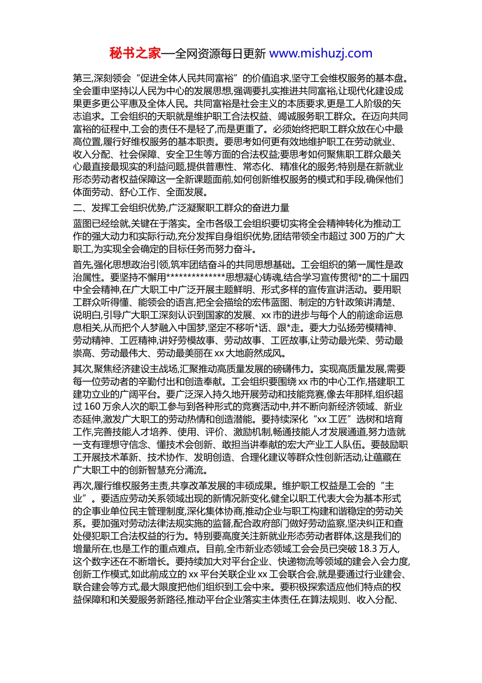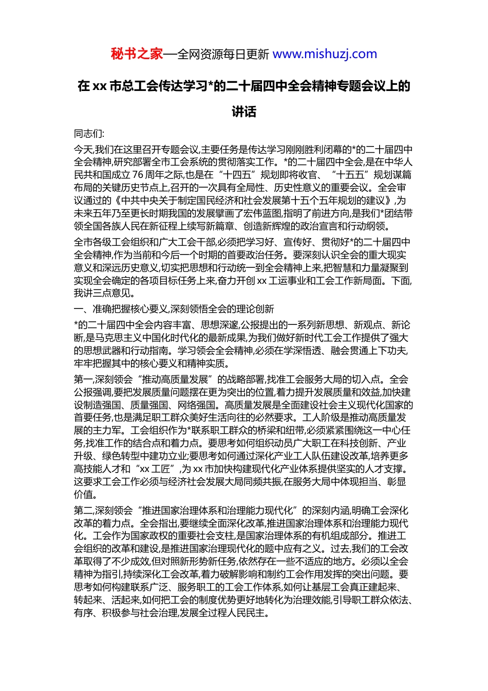 秘书之家—全网资源每日更新 www.mishuzj.com在 xx 市总工会传达学习*的二十届四中全会精神专题会议上的讲话同志们:今天,我们在这里召开专题会议,主要任务是传达学习刚刚胜利闭幕的*的二十届四中全会精神,研究部署全市工会系统的贯彻落实工作。*的二十届四中全会,是在中华人民共和国成立 76 周年之际,也是在“十四五”规划即将收官、“十五五”规划谋篇布局的关键历史节点上,召开的一次具有全局性、历史性意义的重要会议。全会审议通过的《中共中央关于制定国民经济和社会发展第十五个五年规划的建议》,为未来五年乃至更长时期我国的发展擘画了宏伟蓝图,指明了前进方向,是我们*团结带领全国各族人民在新征程上续写新篇章、创造新辉煌的政治宣言和行动纲领。全市各级工会组织和广大工会干部,必须把学习好、宣传好、贯彻好*的二十届四中全会精神,作为当前和今后一个时期的首要政治任务。要深刻认识全会的重大现实意义和深远历史意义,切实把思想和行动统一到全会精神上来,把智慧和力量凝聚到实现全会确定的各项目标任务上来,奋力开创 xx 工运事业和工会工作新局面。下面,我讲三点意见。一、准确把握核心要义,深刻领悟全会的理论创新*的二十届四中全会内容丰富、思想深邃,公报提出的一系列新思想、新观点、新论断,是马克思主义中国化时代化的最新成果,为我们做好新时代工会工作提供了强大的思想武器和行动指南。学习领会全会精神,必须在学深悟透、融会贯通上下功夫,牢牢把握其中的核心要义和精神实质。第一,深刻领会“推动高质量发展”的战略部署,找准工会服务大局的切入点。全会公报强调,要把发展质量问题摆在更为突出的位置,着力提升发展质量和效益,加快建设制造强国、质量强国、网络强国。高质量发展是全面建设社会主义现代化国家的首要任务,也是满足职工群众美好生活向往的必然要求。工人阶级是推动高质量发展的主力军。工会组织作为*联系职工群众的桥梁和纽带,必须紧紧围绕这一中心任务,找准工作的结合点和着力点。要思考如何组织动员广大职工在科技创新、产业升级、绿色转型中建功立业;要思考如何通过深化产业工人队伍建设改革,培养更多高技能人才和“xx 工匠”,为 xx 市加快构建现代化产业体系提供坚实的人才支撑。这要求工会工作必须与经济社会发展大局同频共振,在服务大局中体现担当、彰显价值。第二,深刻领会“推进国家治理体系和治理能力现代化”的深刻内涵,明确工会深化改革的着力点。全会指出,要继续全面深化改革,推进国家治理体系和治理能力现代化。工会作为国家政权的重要社会支柱,是国家治理体系的有机组成部分。推进工会组织的改革和建设,是推进国家治理现代化的题中应有之义。过去,我们的工会改革取得了不少成效,但对照新形势新任务,依然存在一些不适应的地方。必须以全会精神为指引,持续深化工会改革,着力破解影响和制约工会作用发挥的突出问题。要思考如何构建联系广泛、服务职工的工会工作体系,如何让基层工会真正建起来、转起来、活起来,如何把工会的制度优势更好地转化为治理效能,引导职工群众依法、有序、积极参与社会治理,发展全过程人民民主。秘书之家—全网资源每日更新 www.mishuzj.com第三,深刻领会“促进全体人民共同富裕”的价值追求,坚守工会维权服务的基本盘。全会重申坚持以人民为中心的发展思想,强调要扎实推进共同富裕,让现代化建设成果更多更公平惠及全体人民。共同富裕是社会主义的本质要求,更是工人阶级的矢志追求。工会组织的天职就是维护职工合法权益、竭诚服务职工群众。在迈向共同富裕的征程中,工会的责任不是轻了,而是更重了。必须始终把职工群众放在心中最高位置,履行好维权服务的基本职责。要思考如何更有效地维护职工在劳动就业、收入分配、社会保障、安全卫生等方面的合法权益;要思考如何聚焦职工群众最关心最直接最现实的利益问题,提供普惠性、常态化、精准化的服务;特别是在新就业形态劳动者权益保障这一全新课题面前,如何创新维权服务的模式和手段,确保他们体面劳动、舒心工作、全面发展。二、发挥工会组织优势,广泛凝聚职工群众的奋进力量蓝图已经绘就,关键在于落实。全市各级工会组织要切实将全会精神转化为推动工作...