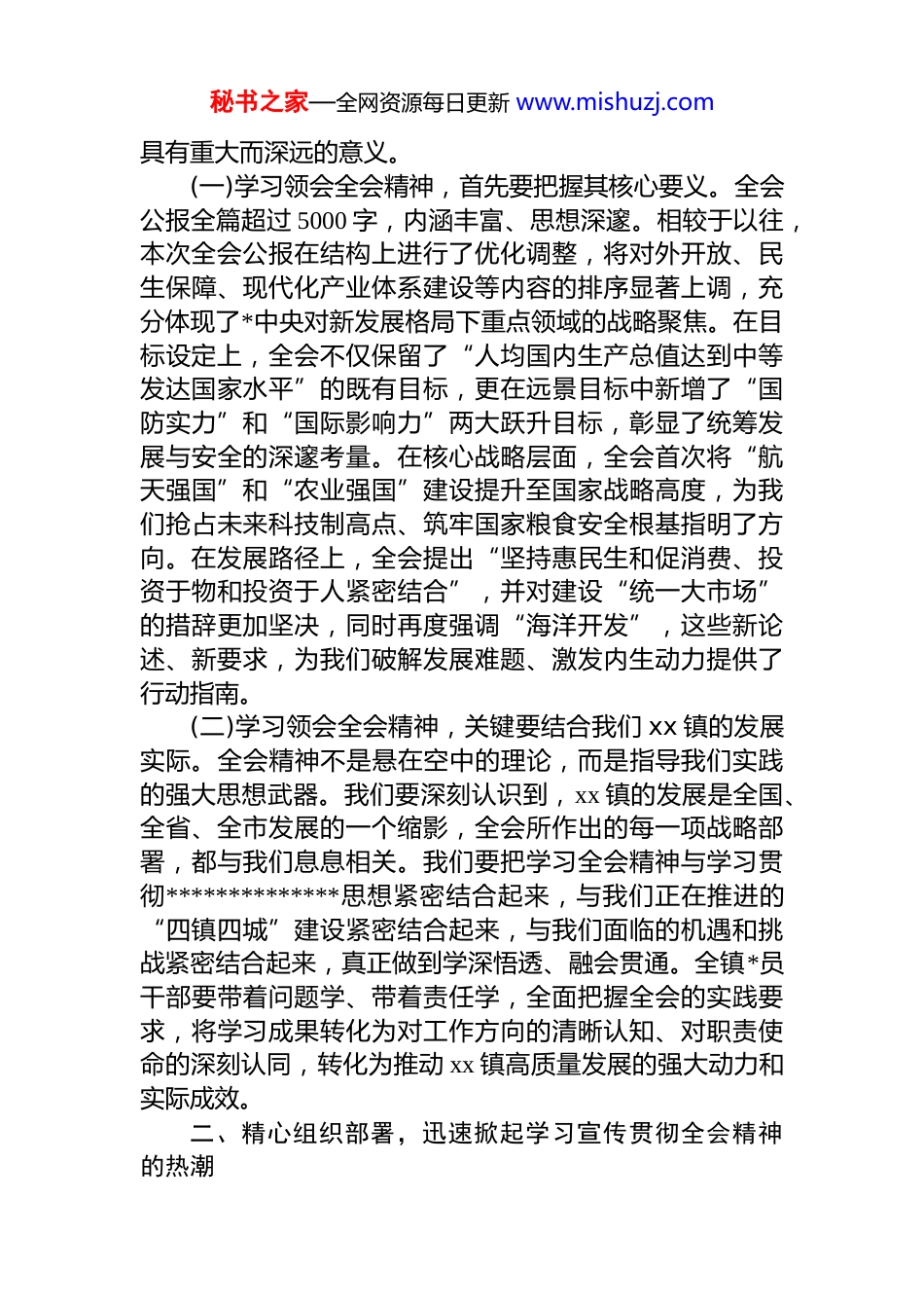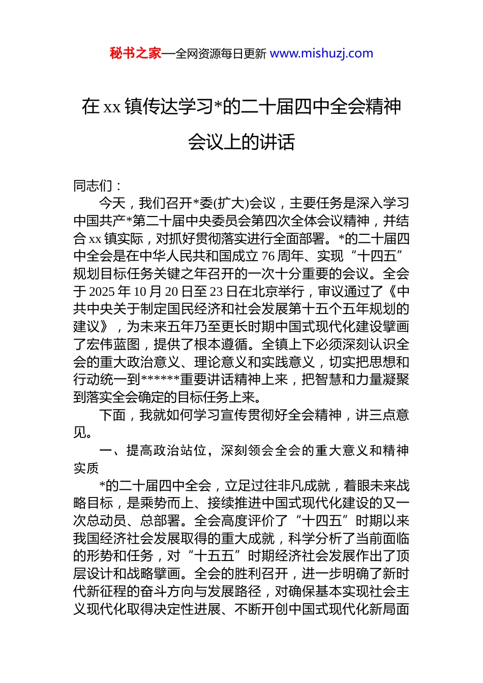 秘书之家—全网资源每日更新 www.mishuzj.com在 xx 镇传达学习*的二十届四中全会精神会议上的讲话同志们:今天,我们召开*委(扩大)会议,主要任务是深入学习中国共产*第二十届中央委员会第四次全体会议精神,并结合 xx 镇实际,对抓好贯彻落实进行全面部署。*的二十届四中全会是在中华人民共和国成立 76 周年、实现“十四五”规划目标任务关键之年召开的一次十分重要的会议。全会于 2025 年 10 月 20 日至 23 日在北京举行,审议通过了《中共中央关于制定国民经济和社会发展第十五个五年规划的建议》,为未来五年乃至更长时期中国式现代化建设擘画了宏伟蓝图,提供了根本遵循。全镇上下必须深刻认识全会的重大政治意义、理论意义和实践意义,切实把思想和行动统一到******重要讲话精神上来,把智慧和力量凝聚到落实全会确定的目标任务上来。下面,我就如何学习宣传贯彻好全会精神,讲三点意见。一、提高政治站位,深刻领会全会的重大意义和精神实质*的二十届四中全会,立足过往非凡成就,着眼未来战略目标,是乘势而上、接续推进中国式现代化建设的又一次总动员、总部署。全会高度评价了“十四五”时期以来我国经济社会发展取得的重大成就,科学分析了当前面临的形势和任务,对“十五五”时期经济社会发展作出了顶层设计和战略擘画。全会的胜利召开,进一步明确了新时代新征程的奋斗方向与发展路径,对确保基本实现社会主义现代化取得决定性进展、不断开创中国式现代化新局面秘书之家—全网资源每日更新 www.mishuzj.com具有重大而深远的意义。(一)学习领会全会精神,首先要把握其核心要义。全会公报全篇超过 5000 字,内涵丰富、思想深邃。相较于以往,本次全会公报在结构上进行了优化调整,将对外开放、民生保障、现代化产业体系建设等内容的排序显著上调,充分体现了*中央对新发展格局下重点领域的战略聚焦。在目标设定上,全会不仅保留了“人均国内生产总值达到中等发达国家水平”的既有目标,更在远景目标中新增了“国防实力”和“国际影响力”两大跃升目标,彰显了统筹发展与安全的深邃考量。在核心战略层面,全会首次将“航天强国”和“农业强国”建设提升至国家战略高度,为我们抢占未来科技制高点、筑牢国家粮食安全根基指明了方向。在发展路径上,全会提出“坚持惠民生和促消费、投资于物和投资于人紧密结合”,并对建设“统一大市场”的措辞更加坚决,同时再度强调“海洋开发”,这些新论述、新要求,为我们破解发展难题、激发内生动力提供了行动指南。(二)学习领会全会精神,关键要结合我们 xx 镇的发展实际。全会精神不是悬在空中的理论,而是指导我们实践的强大思想武器。我们要深刻认识到,xx 镇的发展是全国、全省、全市发展的一个缩影,全会所作出的每一项战略部署,都与我们息息相关。我们要把学习全会精神与学习贯彻**************思想紧密结合起来,与我们正在推进的“四镇四城”建设紧密结合起来,与我们面临的机遇和挑战紧密结合起来,真正做到学深悟透、融会贯通。全镇*员干部要带着问题学、带着责任学,全面把握全会的实践要求,将学习成果转化为对工作方向的清晰认知、对职责使命的深刻认同,转化为推动 xx 镇高质量发展的强大动力和实际成效。二、精心组织部署,迅速掀起学习宣传贯彻全会精神的热潮秘书之家—全网资源每日更新 www.mishuzj.com学习好、宣传好、贯彻好*的二十届四中全会精神,是全镇上下当前和今后一个时期的首要政治任务。各级*组织要高度重视,精心组织,周密安排,迅速在全镇范围内掀起学习宣传热潮,推动全会精神深入人心、家喻户晓。第一,要在“学”的深度上下功夫,做到入脑入心。理论学习中心组要发挥示范引领作用,制定系统学习计划分专题、分阶段开展深入研讨。*政领导干部要率先垂范、以上率下,带头学深学透,带头撰写心得体会,带头到联系点开展宣讲,为全镇*员干部作出表率。要以*支部为单位,依托“三会一课”、主题*日等基本制度,组织广大*员原原本本学、逐字逐句悟,确保学习覆盖到每一个支部每一名*员。要创新学习形式,可以通过知识竞赛、演讲比赛、学习沙龙等*员群众喜闻乐见的方式,增强...