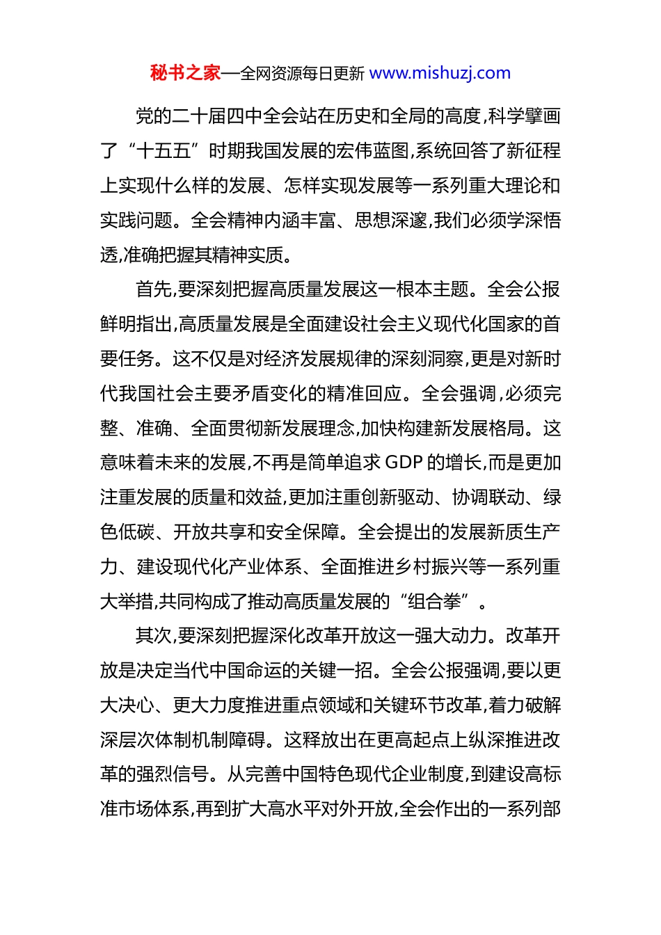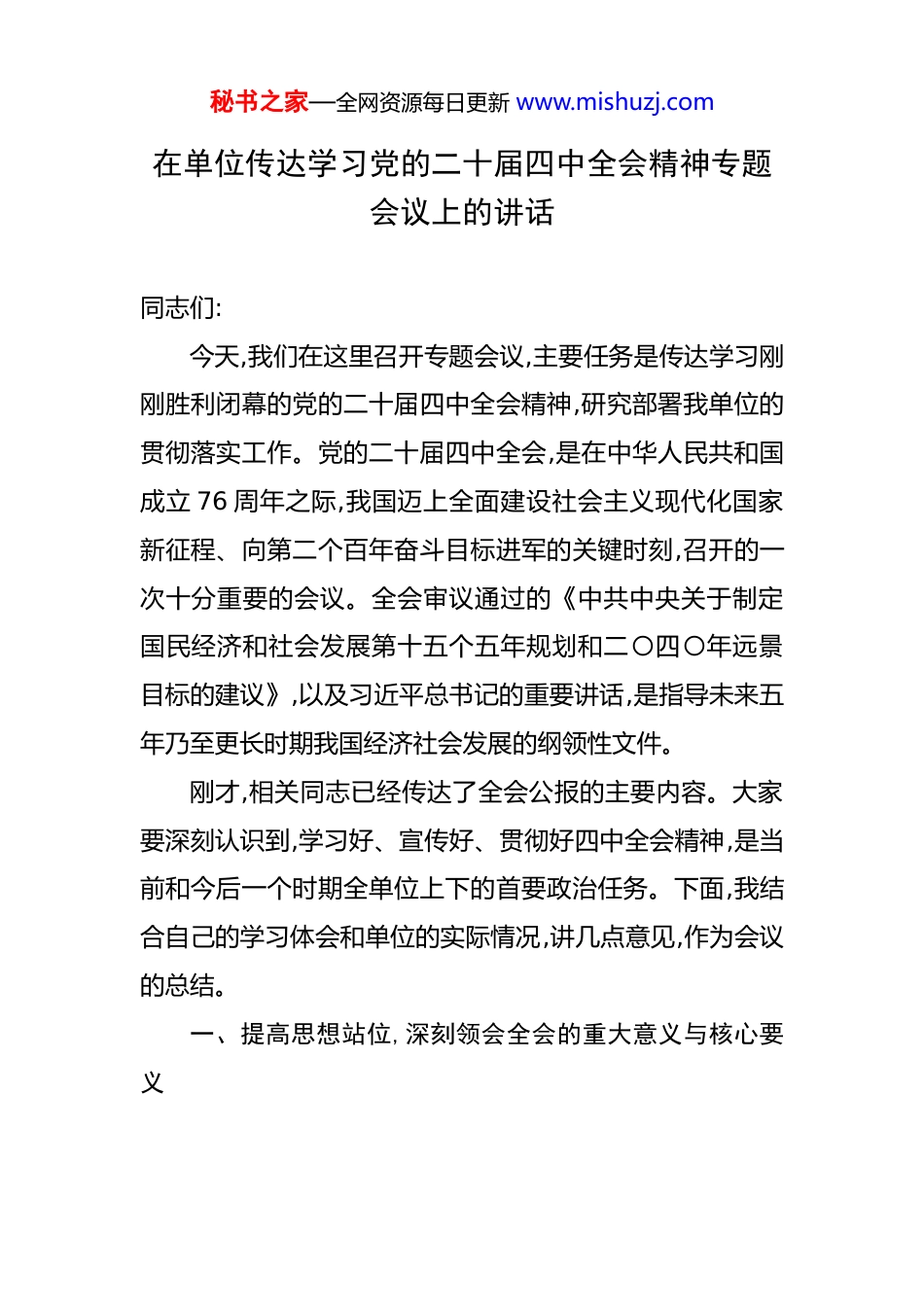 秘书之家—全网资源每日更新 www.mishuzj.com在单位传达学习党的二十届四中全会精神专题会议上的讲话 同志们:今天,我们在这里召开专题会议,主要任务是传达学习刚刚胜利闭幕的党的二十届四中全会精神,研究部署我单位的贯彻落实工作。党的二十届四中全会,是在中华人民共和国成立 76 周年之际,我国迈上全面建设社会主义现代化国家新征程、向第二个百年奋斗目标进军的关键时刻,召开的一次十分重要的会议。全会审议通过的《中共中央关于制定国民经济和社会发展第十五个五年规划和二〇四〇年远景目标的建议》,以及习近平总书记的重要讲话,是指导未来五年乃至更长时期我国经济社会发展的纲领性文件。刚才,相关同志已经传达了全会公报的主要内容。大家要深刻认识到,学习好、宣传好、贯彻好四中全会精神,是当前和今后一个时期全单位上下的首要政治任务。下面,我结合自己的学习体会和单位的实际情况,讲几点意见,作为会议的总结。一、提高思想站位,深刻领会全会的重大意义与核心要义秘书之家—全网资源每日更新 www.mishuzj.com党的二十届四中全会站在历史和全局的高度,科学擘画了“十五五”时期我国发展的宏伟蓝图,系统回答了新征程上实现什么样的发展、怎样实现发展等一系列重大理论和实践问题。全会精神内涵丰富、思想深邃,我们必须学深悟透,准确把握其精神实质。首先,要深刻把握高质量发展这一根本主题。全会公报鲜明指出,高质量发展是全面建设社会主义现代化国家的首要任务。这不仅是对经济发展规律的深刻洞察,更是对新时代我国社会主要矛盾变化的精准回应。全会强调,必须完整、准确、全面贯彻新发展理念,加快构建新发展格局。这意味着未来的发展,不再是简单追求 GDP 的增长,而是更加注重发展的质量和效益,更加注重创新驱动、协调联动、绿色低碳、开放共享和安全保障。全会提出的发展新质生产力、建设现代化产业体系、全面推进乡村振兴等一系列重大举措,共同构成了推动高质量发展的“组合拳”。其次,要深刻把握深化改革开放这一强大动力。改革开放是决定当代中国命运的关键一招。全会公报强调,要以更大决心、更大力度推进重点领域和关键环节改革,着力破解深层次体制机制障碍。这释放出在更高起点上纵深推进改革的强烈信号。从完善中国特色现代企业制度,到建设高标准市场体系,再到扩大高水平对外开放,全会作出的一系列部秘书之家—全网资源每日更新 www.mishuzj.com署,旨在为高质量发展注入源源不断的制度活力和外部动力,进一步推进国家治理体系和治理能力现代化。再次,要深刻把握以人民为中心这一根本立场。全会公报通篇贯穿着坚持以人民为中心的发展思想。从扎实推进共同富裕,到强化就业优先政策,再到健全社会保障体系、推进健康中国建设,每一项部署都紧扣人民群众最关心最直接最现实的利益问题。这充分彰显了我们党“江山就是人民、人民就是江山”的执政理念。发展的最终目的,是让全体人民过上更加幸福美好的生活,发展的成果必须由人民共享。这是我们一切工作的出发点和落脚点。最后,要深刻把握统筹发展和安全这一重要原则。安全是发展的前提,发展是安全的保障。当前,世界百年未有之大变局加速演进,我国发展进入战略机遇和风险挑战并存、不确定难预料因素增多的时期。全会公明晰确提出,必须坚定不移贯彻总体国家安全观,把维护国家安全贯穿党和国家工作各方面全过程。从保障国家粮食和能源资源安全,到维护产业链供应链安全稳定,再到防范化解重大金融风险,全会着眼于“安”与“兴”的辩证统一,为我们在复杂严峻的内外环境中行稳致远筑牢了坚实屏障。二、聚焦主责主业,以全会精神指引单位工作开创新局面秘书之家—全网资源每日更新 www.mishuzj.com学习的目的全在于运用。将全会精神转化为推动 XX 单位事业发展的强大动力和生动实践,是衡量学习成效的唯一标准。各部门、各团队必须紧密结合自身职责和年度任务,找准贯彻落实的切入点和着力点,用实际工作成果来检验学习成效。第一,要在推动区域高质量发展上展现新作为。全会擘画的“十五五”蓝图,为我们指明了主攻方向。本单位作为区域发展的关键一环,必须主动作为、奋发有为。以我们正在全力推进的“XX 高新技术产业园区”项目...