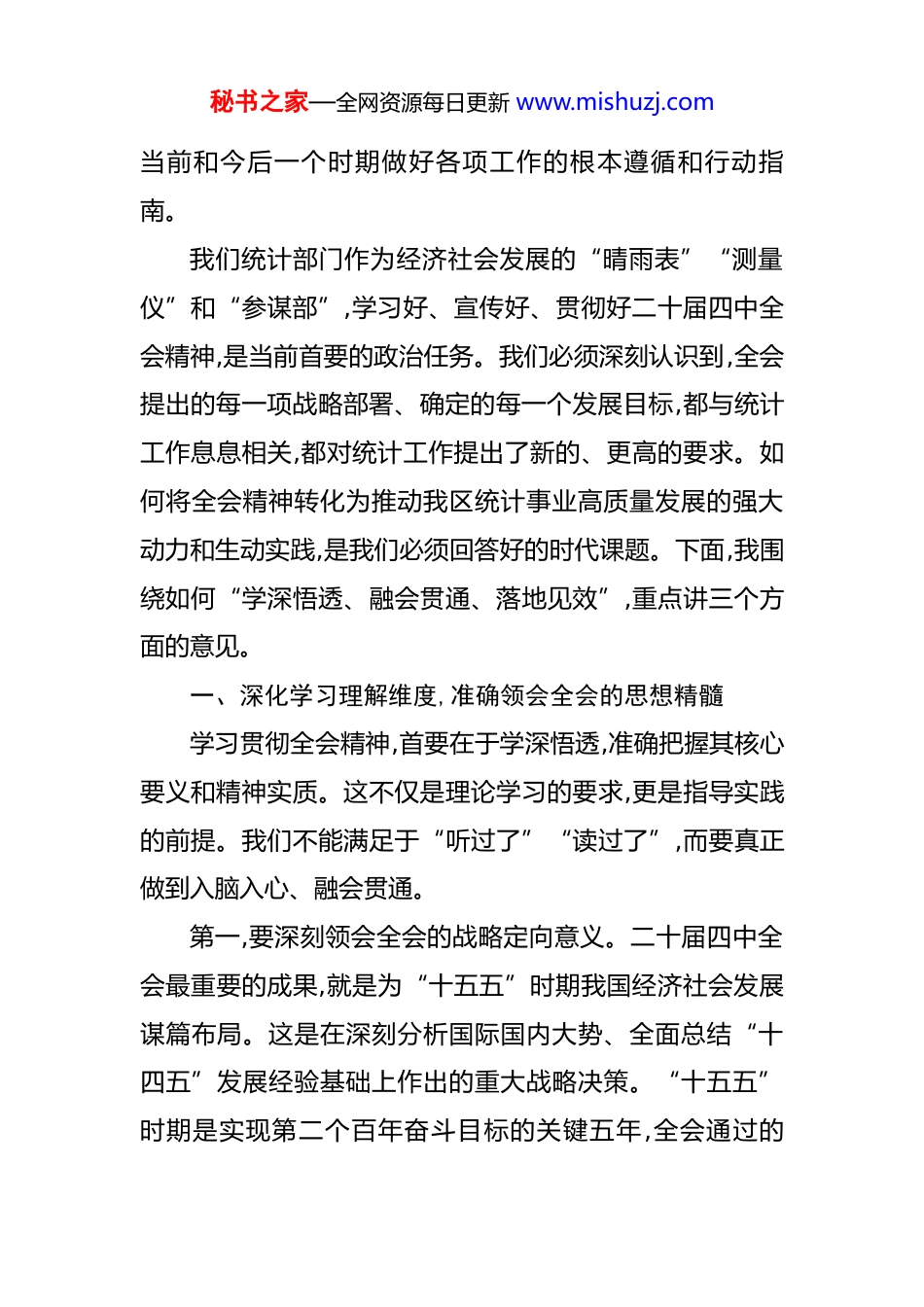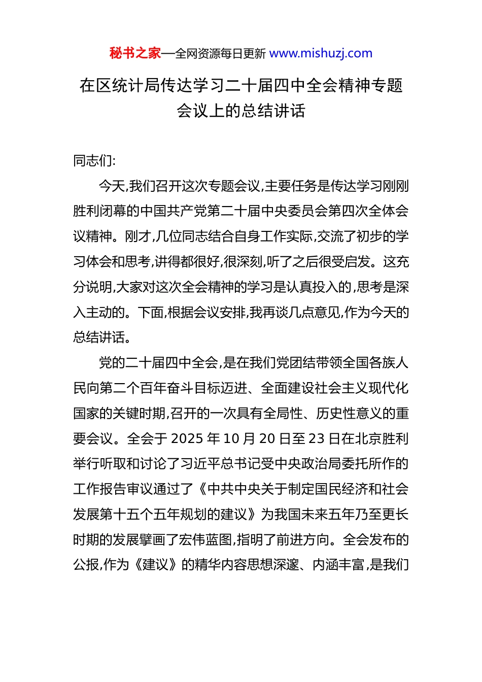 秘书之家—全网资源每日更新 www.mishuzj.com在区统计局传达学习二十届四中全会精神专题会议上的总结讲话 同志们:今天,我们召开这次专题会议,主要任务是传达学习刚刚胜利闭幕的中国共产党第二十届中央委员会第四次全体会议精神。刚才,几位同志结合自身工作实际,交流了初步的学习体会和思考,讲得都很好,很深刻,听了之后很受启发。这充分说明,大家对这次全会精神的学习是认真投入的,思考是深入主动的。下面,根据会议安排,我再谈几点意见,作为今天的总结讲话。党的二十届四中全会,是在我们党团结带领全国各族人民向第二个百年奋斗目标迈进、全面建设社会主义现代化国家的关键时期,召开的一次具有全局性、历史性意义的重要会议。全会于 2025 年 10 月 20 日至 23 日在北京胜利举行听取和讨论了习近平总书记受中央政治局委托所作的工作报告审议通过了《中共中央关于制定国民经济和社会发展第十五个五年规划的建议》为我国未来五年乃至更长时期的发展擘画了宏伟蓝图,指明了前进方向。全会发布的公报,作为《建议》的精华内容思想深邃、内涵丰富,是我们秘书之家—全网资源每日更新 www.mishuzj.com当前和今后一个时期做好各项工作的根本遵循和行动指南。我们统计部门作为经济社会发展的“晴雨表”“测量仪”和“参谋部”,学习好、宣传好、贯彻好二十届四中全会精神,是当前首要的政治任务。我们必须深刻认识到,全会提出的每一项战略部署、确定的每一个发展目标,都与统计工作息息相关,都对统计工作提出了新的、更高的要求。如何将全会精神转化为推动我区统计事业高质量发展的强大动力和生动实践,是我们必须回答好的时代课题。下面,我围绕如何“学深悟透、融会贯通、落地见效”,重点讲三个方面的意见。一、深化学习理解维度,准确领会全会的思想精髓学习贯彻全会精神,首要在于学深悟透,准确把握其核心要义和精神实质。这不仅是理论学习的要求,更是指导实践的前提。我们不能满足于“听过了”“读过了”,而要真正做到入脑入心、融会贯通。第一,要深刻领会全会的战略定向意义。二十届四中全会最重要的成果,就是为“十五五”时期我国经济社会发展谋篇布局。这是在深刻分析国际国内大势、全面总结“十四五”发展经验基础上作出的重大战略决策。“十五五”时期是实现第二个百年奋斗目标的关键五年,全会通过的秘书之家—全网资源每日更新 www.mishuzj.com《建议》为我们描绘了未来发展的宏伟画卷,明确了指导思想、基本原则和主要目标。这不仅是对未来五年的具体部署,更是对中国式现代化宏伟蓝图的阶段性深化和具体化。我们统计工作者必须站在这样的战略高度,去理解全会精神的重大意义,清醒认识到自己肩负的责任,把思想和行动统一到党中央的决策部署上来,确保统计工作始终沿着正确的政治方向前进。第二,要精准把握高质量发展的核心要求。全会公报再次强调,推动高质量发展是“十五五”时期的主题主线。这一要求贯穿于经济、政治、文化、社会、生态文明建设的各领域和全过程。从公报提及的建设现代化产业体系到切实抓好民生保障再到统筹发展和安全,无一不体现着对“质”的更高追求。这就要求我们的统计工作必须实现从“重量”到“重质”的深刻转变。过去我们可能更关注GDP 增速、工业产值等总量指标,今后则必须更加聚焦全要素生产率、科技创新贡献率、居民收入增长、单位 GDP 能耗等体现发展质量和效益的指标。这种转变,是对我们统计理念、统计制度、统计能力的全面考验。第三,要深入理解推进国家治理现代化的深刻内涵。历次四中全会往往聚焦重大理论和实践问题。十九届四中全会首次将统计监督纳入党和国家监督体系,极大提升了统计秘书之家—全网资源每日更新 www.mishuzj.com工作的政治地位和法定职责。二十届四中全会继续聚焦深化改革和完善制度,强调推进国家治理体系和治理能力现代化。公报中关于完善党和国家监督体系的论述预示着对监督执纪执法规范化、制度化建设的更高要求。作为监督体系的重要组成部分,统计监督的责任不是轻了,而是更重了;要求不是松了,而是更严了。我们必须从推进国家治理现代化的高度,来重新审视和定位统计监督的职能作用,使其真正成为推动党中央决策部署落地见...