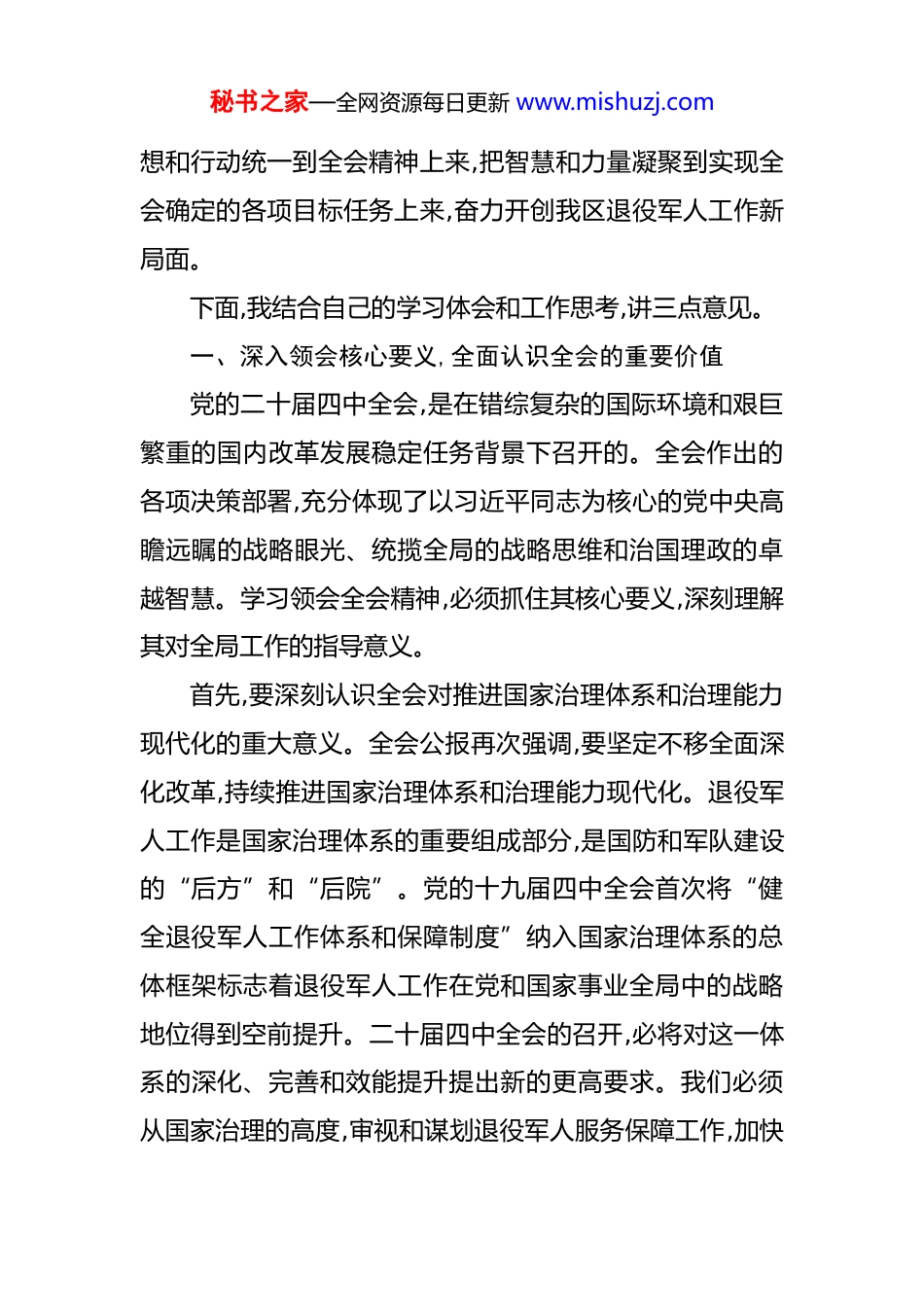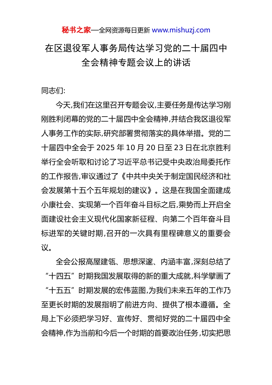 秘书之家—全网资源每日更新 www.mishuzj.com在区退役军人事务局传达学习党的二十届四中全会精神专题会议上的讲话 同志们:今天,我们在这里召开专题会议,主要任务是传达学习刚刚胜利闭幕的党的二十届四中全会精神,并结合我区退役军人事务工作的实际,研究部署贯彻落实的具体举措。党的二十届四中全会于 2025 年 10 月 20 日至 23 日在北京胜利举行全会听取和讨论了习近平总书记受中央政治局委托作的工作报告,审议通过了《中共中央关于制定国民经济和社会发展第十五个五年规划的建议》。这是在我国全面建成小康社会、实现第一个百年奋斗目标之后,乘势而上开启全面建设社会主义现代化国家新征程、向第二个百年奋斗目标进军的关键时期,召开的一次具有里程碑意义的重要会议。全会公报高屋建瓴、思想深邃、内涵丰富,深刻总结了“十四五”时期我国发展取得的新的重大成就,科学擘画了“十五五”时期发展的宏伟蓝图,为我们未来五年的工作乃至更长时期的发展指明了前进方向、提供了根本遵循。全局上下必须把学习好、宣传好、贯彻好党的二十届四中全会精神,作为当前和今后一个时期的首要政治任务,切实把思秘书之家—全网资源每日更新 www.mishuzj.com想和行动统一到全会精神上来,把智慧和力量凝聚到实现全会确定的各项目标任务上来,奋力开创我区退役军人工作新局面。下面,我结合自己的学习体会和工作思考,讲三点意见。一、深入领会核心要义,全面认识全会的重要价值党的二十届四中全会,是在错综复杂的国际环境和艰巨繁重的国内改革发展稳定任务背景下召开的。全会作出的各项决策部署,充分体现了以习近平同志为核心的党中央高瞻远瞩的战略眼光、统揽全局的战略思维和治国理政的卓越智慧。学习领会全会精神,必须抓住其核心要义,深刻理解其对全局工作的指导意义。首先,要深刻认识全会对推进国家治理体系和治理能力现代化的重大意义。全会公报再次强调,要坚定不移全面深化改革,持续推进国家治理体系和治理能力现代化。退役军人工作是国家治理体系的重要组成部分,是国防和军队建设的“后方”和“后院”。党的十九届四中全会首次将“健全退役军人工作体系和保障制度”纳入国家治理体系的总体框架标志着退役军人工作在党和国家事业全局中的战略地位得到空前提升。二十届四中全会的召开,必将对这一体系的深化、完善和效能提升提出新的更高要求。我们必须从国家治理的高度,审视和谋划退役军人服务保障工作,加快秘书之家—全网资源每日更新 www.mishuzj.com构建系统完备、科学规范、运行高效的退役军人工作制度体系,推动治理理念、治理方式、治理手段的现代化,确保党中央的决策部署在退役军人事务领域落地生根、开花结果。其次,要深刻把握全会对“十五五”时期发展作出的战略部署。“十五五”时期是我国在基本实现社会主义现代化进程中至关重要的五年。全会审议通过的规划《建议》,是指导未来五年我国经济社会发展的纲领性文件。虽然公报内容宏观,未直接提及退役军人工作的具体细节,但我们必须清醒地认识到,推动经济社会高质量发展、维护国家安全和社会稳定、实现建军一百年奋斗目标,每一项都与我们的工作息息相关。巩固国防和强大军队,离不开高质量的兵员,更离不开坚实的退役军人服务保障。做好退役军人安置、就业、优抚、褒扬等工作,就是服务国防大局,就是为“十五五”规划的顺利实施贡献力量。我们要主动将退役军人工作融入全区经济社会发展大局中去思考、去定位、去推进,使之成为推动区域发展、促进社会和谐的积极力量。最后,要深刻领会全会精神与退役军人工作的内在逻辑联系。全会强调坚持党的全面领导,坚持以人民为中心的发展思想,坚持稳中求进工作总基调。这些重要原则,同样是做好退役军人工作的根本指针。退役军人是党和国家的宝贵秘书之家—全网资源每日更新 www.mishuzj.com财富,他们为国防事业作出了牺牲和奉献,是社会主义现代化建设的重要力量。为他们服务,就是践行以人民为中心的具体体现。我们要始终把退役军人对美好生活的向往作为奋斗目标,用心用情用力解决他们的急难愁盼问题,不断增强他们的获得感、幸福感、荣誉感。这不仅是道义所在,更是巩固党的执政根基、维护社会长治久...