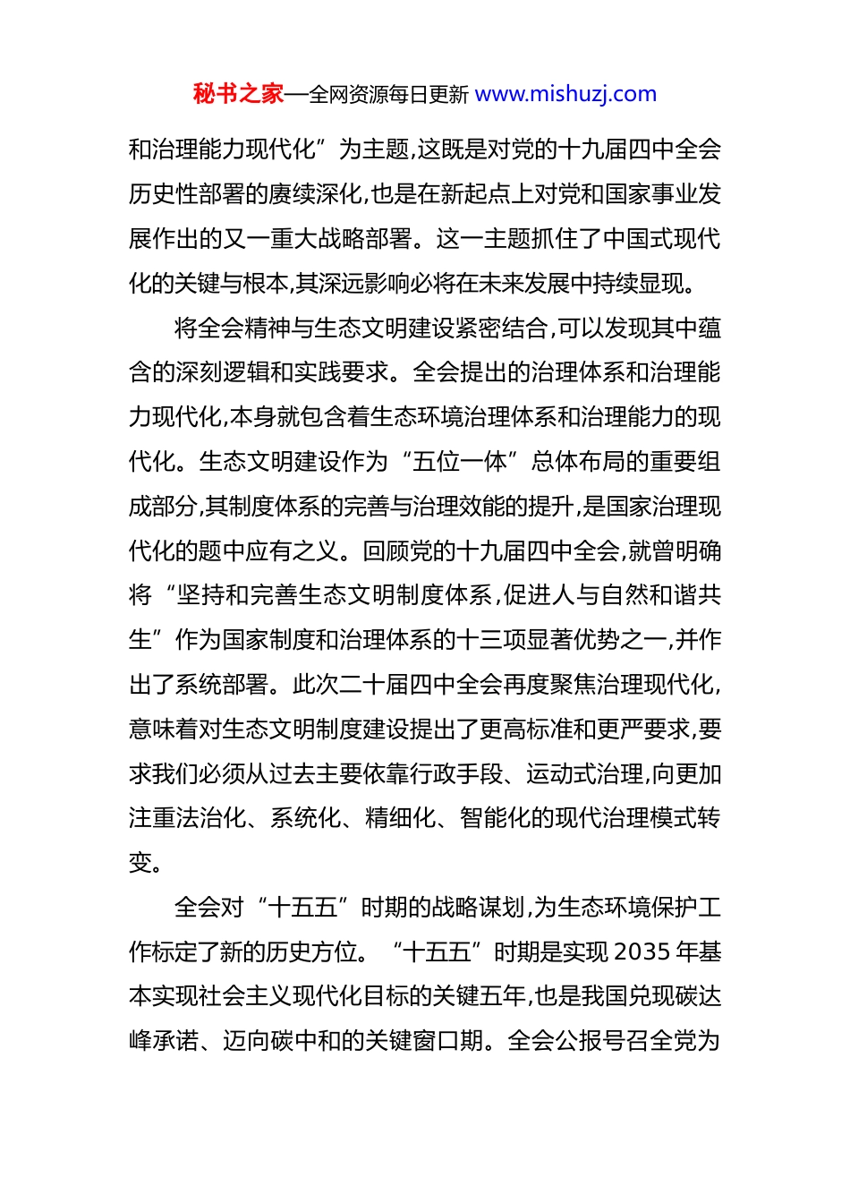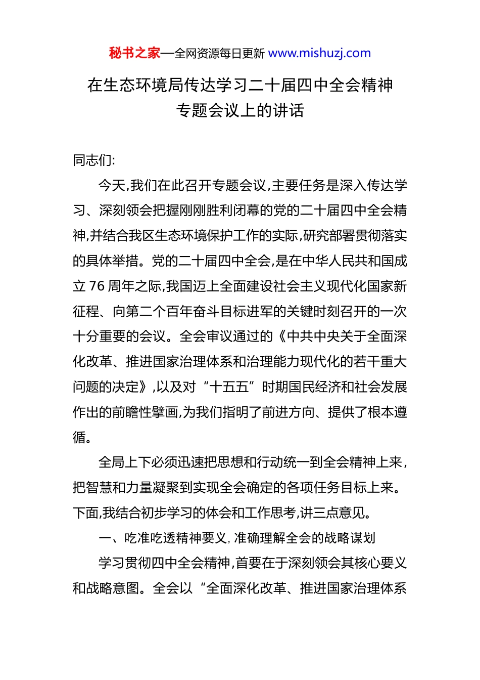 秘书之家—全网资源每日更新 www.mishuzj.com在生态环境局传达学习二十届四中全会精神专题会议上的讲话 同志们:今天,我们在此召开专题会议,主要任务是深入传达学习、深刻领会把握刚刚胜利闭幕的党的二十届四中全会精神,并结合我区生态环境保护工作的实际,研究部署贯彻落实的具体举措。党的二十届四中全会,是在中华人民共和国成立 76 周年之际,我国迈上全面建设社会主义现代化国家新征程、向第二个百年奋斗目标进军的关键时刻召开的一次十分重要的会议。全会审议通过的《中共中央关于全面深化改革、推进国家治理体系和治理能力现代化的若干重大问题的决定》,以及对“十五五”时期国民经济和社会发展作出的前瞻性擘画,为我们指明了前进方向、提供了根本遵循。全局上下必须迅速把思想和行动统一到全会精神上来,把智慧和力量凝聚到实现全会确定的各项任务目标上来。下面,我结合初步学习的体会和工作思考,讲三点意见。一、吃准吃透精神要义,准确理解全会的战略谋划学习贯彻四中全会精神,首要在于深刻领会其核心要义和战略意图。全会以“全面深化改革、推进国家治理体系秘书之家—全网资源每日更新 www.mishuzj.com和治理能力现代化”为主题,这既是对党的十九届四中全会历史性部署的赓续深化,也是在新起点上对党和国家事业发展作出的又一重大战略部署。这一主题抓住了中国式现代化的关键与根本,其深远影响必将在未来发展中持续显现。将全会精神与生态文明建设紧密结合,可以发现其中蕴含的深刻逻辑和实践要求。全会提出的治理体系和治理能力现代化,本身就包含着生态环境治理体系和治理能力的现代化。生态文明建设作为“五位一体”总体布局的重要组成部分,其制度体系的完善与治理效能的提升,是国家治理现代化的题中应有之义。回顾党的十九届四中全会,就曾明确将“坚持和完善生态文明制度体系,促进人与自然和谐共生”作为国家制度和治理体系的十三项显著优势之一,并作出了系统部署。此次二十届四中全会再度聚焦治理现代化,意味着对生态文明制度建设提出了更高标准和更严要求,要求我们必须从过去主要依靠行政手段、运动式治理,向更加注重法治化、系统化、精细化、智能化的现代治理模式转变。全会对“十五五”时期的战略谋划,为生态环境保护工作标定了新的历史方位。“十五五”时期是实现 2035 年基本实现社会主义现代化目标的关键五年,也是我国兑现碳达峰承诺、迈向碳中和的关键窗口期。全会公报号召全党为秘书之家—全网资源每日更新 www.mishuzj.com实现社会主义现代化而团结奋斗其中高质量发展是首要任务,而没有高水平的生态环境保护,就没有真正意义上的高质量发展。因此,可以预见,“十五五”规划必将贯穿着一条鲜明的绿色主线,对能源结构调整、产业转型升级、污染物排放总量控制、生态系统服务功能提升等方面,将设定更具雄心和约束力的目标。这对我区这样一个经济活跃、产业集聚的区域而言,既是巨大的挑战,更是实现发展模式迭代升级的重大机遇。我们必须提前研判、主动布局,将全会精神转化为推动我区绿色低碳发展的具体行动方案。全会强调的以人民为中心的发展思想,是生态环境工作的根本价值取向。优美的生态环境是最普惠的民生福祉。人民群众对“蓝天白云、繁星闪烁、清水绿岸、鱼翔浅底”的期盼,就是我们奋斗的目标。推进生态环境治理现代化,最终目的就是为了不断满足人民日益增长的优美生态环境需要。因此,贯彻全会精神,就必须始终站稳人民立场,聚焦解决群众身边的突出环境问题,让人民群众在生态环境改善中有实实在在的获得感、幸福感和安全感。二、践行绿色发展理念,坚决打好污染防治攻坚战学习的成效最终要体现在实践的成果上。贯彻落实四中全会精神,最直接、最现实的任务,就是以更高标准、更大力度、更实作风,坚决打好污染防治攻坚战,持续改善区域生秘书之家—全网资源每日更新 www.mishuzj.com态环境质量。当前已是 2025 年 10 月下旬,距离“十四五”规划收官仅剩两个多月时间。必须发起最后冲刺,确保各项目标任务圆满完成,为“十五五”开好局、起好步奠定坚实基础。第一,要以决战决胜之姿,坚决打赢蓝天保卫战。空气质量事关群众切身感受,是环境治理的“晴雨表”。今...