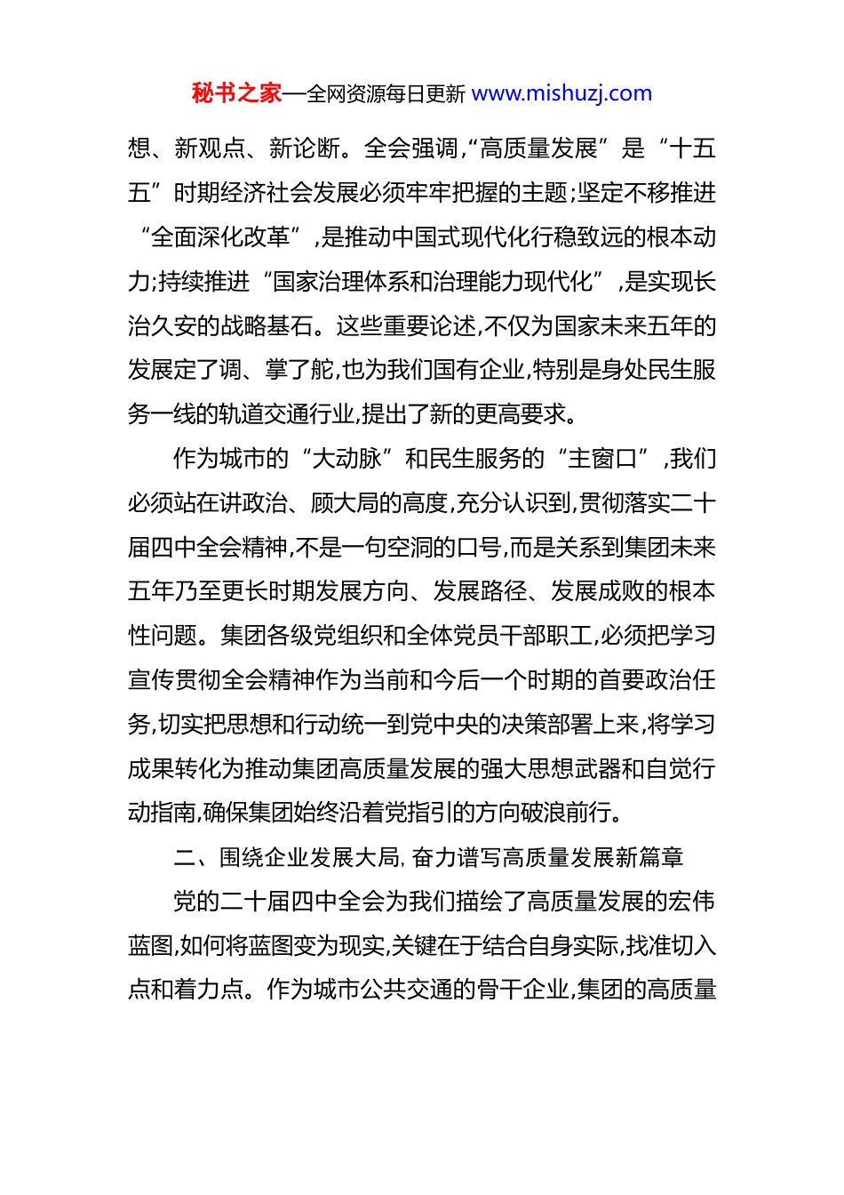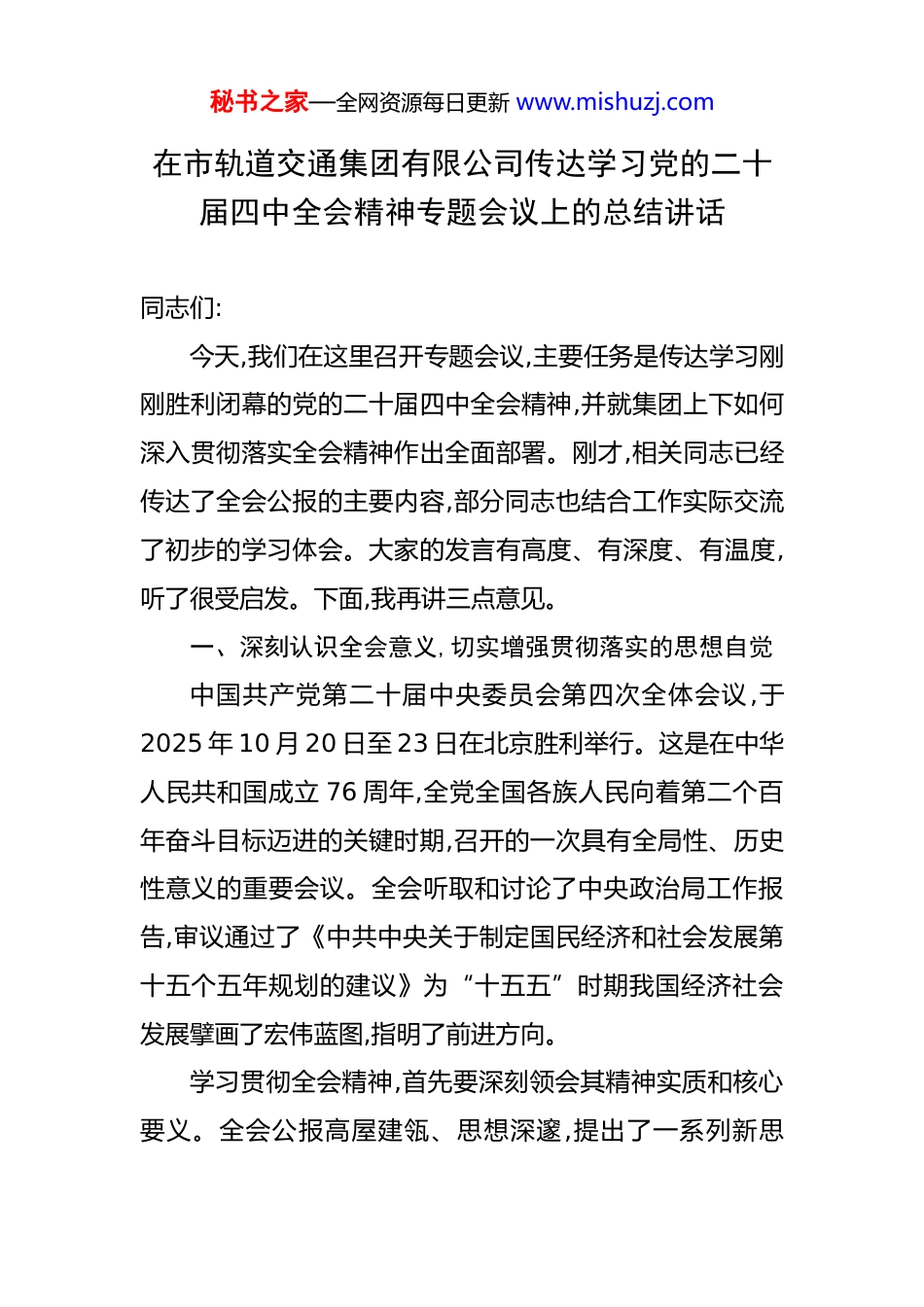 秘书之家—全网资源每日更新 www.mishuzj.com在市轨道交通集团有限公司传达学习党的二十届四中全会精神专题会议上的总结讲话 同志们:今天,我们在这里召开专题会议,主要任务是传达学习刚刚胜利闭幕的党的二十届四中全会精神,并就集团上下如何深入贯彻落实全会精神作出全面部署。刚才,相关同志已经传达了全会公报的主要内容,部分同志也结合工作实际交流了初步的学习体会。大家的发言有高度、有深度、有温度,听了很受启发。下面,我再讲三点意见。一、深刻认识全会意义,切实增强贯彻落实的思想自觉中国共产党第二十届中央委员会第四次全体会议,于2025 年 10 月 20 日至 23 日在北京胜利举行。这是在中华人民共和国成立 76 周年,全党全国各族人民向着第二个百年奋斗目标迈进的关键时期,召开的一次具有全局性、历史性意义的重要会议。全会听取和讨论了中央政治局工作报告,审议通过了《中共中央关于制定国民经济和社会发展第十五个五年规划的建议》为“十五五”时期我国经济社会发展擘画了宏伟蓝图,指明了前进方向。学习贯彻全会精神,首先要深刻领会其精神实质和核心要义。全会公报高屋建瓴、思想深邃,提出了一系列新思秘书之家—全网资源每日更新 www.mishuzj.com想、新观点、新论断。全会强调,“高质量发展”是“十五五”时期经济社会发展必须牢牢把握的主题;坚定不移推进“全面深化改革”,是推动中国式现代化行稳致远的根本动力;持续推进“国家治理体系和治理能力现代化”,是实现长治久安的战略基石。这些重要论述,不仅为国家未来五年的发展定了调、掌了舵,也为我们国有企业,特别是身处民生服务一线的轨道交通行业,提出了新的更高要求。作为城市的“大动脉”和民生服务的“主窗口”,我们必须站在讲政治、顾大局的高度,充分认识到,贯彻落实二十届四中全会精神,不是一句空洞的口号,而是关系到集团未来五年乃至更长时期发展方向、发展路径、发展成败的根本性问题。集团各级党组织和全体党员干部职工,必须把学习宣传贯彻全会精神作为当前和今后一个时期的首要政治任务,切实把思想和行动统一到党中央的决策部署上来,将学习成果转化为推动集团高质量发展的强大思想武器和自觉行动指南,确保集团始终沿着党指引的方向破浪前行。二、围绕企业发展大局,奋力谱写高质量发展新篇章党的二十届四中全会为我们描绘了高质量发展的宏伟蓝图,如何将蓝图变为现实,关键在于结合自身实际,找准切入点和着力点。作为城市公共交通的骨干企业,集团的高质量秘书之家—全网资源每日更新 www.mishuzj.com发展,就是要以全会精神为指引,在服务城市发展、服务人民群众中展现新作为、创造新业绩。 第一,以新质生产力赋能,驱动轨道交通智慧转型。全会强调要大力发展新质生产力,建设现代化产业体系。对轨道交通行业而言,新质生产力就是通过科技创新、数字赋能,实现从“规模扩张”向“质效提升”的根本性转变。要加快推进“智慧地铁”建设,深度应用大数据、人工智能、物联网等前沿技术,构建全时域、全场景的智慧运营和智能维保体系。要通过数据分析精准预测客流变化,动态优化行车组织,提升运能与需求的匹配度。要探索基于状态监测的预测性维护,降低设备故障率,提升资产全生命周期管理水平,让科技创新成为集团发展的最大增量。第二,以人民为中心服务,铸就城市交通金字招牌。全会再次强调要加大保障和改善民生力度,扎实推进共同富裕。轨道交通作为重要的民生工程,其发展的最终目的就是为了让市民出行更安全、更便捷、更舒适、更温暖。今年 5 月 1日,集团所辖线路单日客运量达到了 407.7 万人次,再次刷新历史记录,这既是市民对我们的信赖,更是沉甸甸的责任。要持续深化“我为群众办实事”实践活动,聚焦乘客的“急难愁盼”问题,从优化换乘引导标识、增加便民服务设施、提升车站环境品质等细微之处着手,不断提升服务质量。要始秘书之家—全网资源每日更新 www.mishuzj.com终把安全运营放在首位,以“时时放心不下”的责任感,抓好安全生产的每一个环节,坚决守住不发生重特大安全事故的底线,用我们的辛苦指数换取市民的幸福指数。第三,以重大项目建设,筑牢城市发展战略支撑。全会提出要促进区域协调发展和推进...