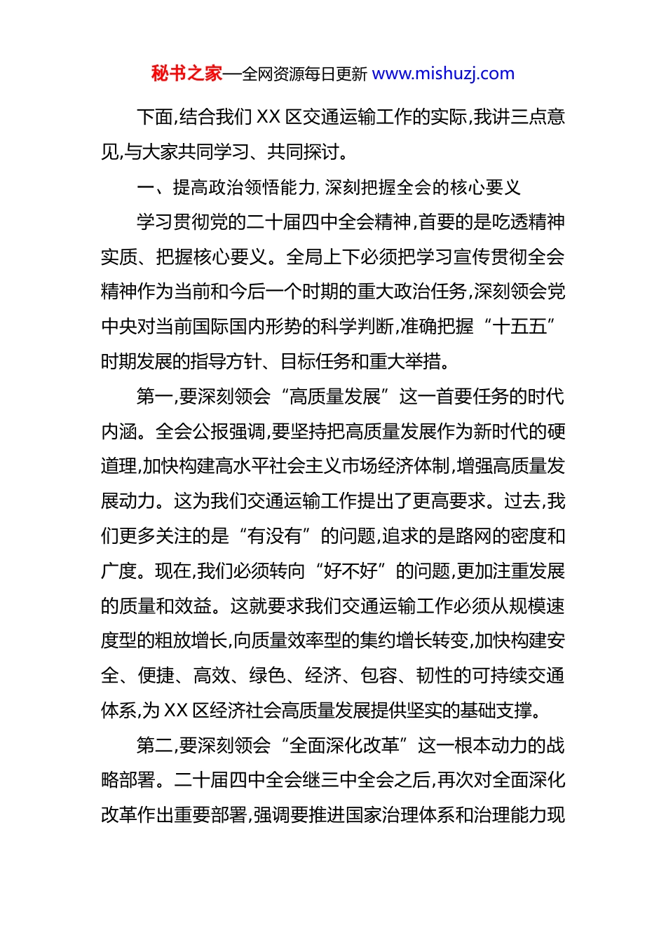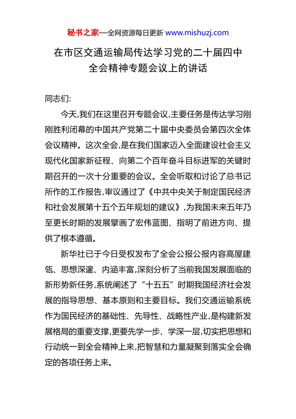 秘书之家—全网资源每日更新 www.mishuzj.com在市区交通运输局传达学习党的二十届四中全会精神专题会议上的讲话 同志们:今天,我们在这里召开专题会议,主要任务是传达学习刚刚胜利闭幕的中国共产党第二十届中央委员会第四次全体会议精神。这次全会,是在我们国家迈入全面建设社会主义现代化国家新征程、向第二个百年奋斗目标进军的关键时期召开的一次十分重要的会议。全会听取和讨论了总书记所作的工作报告,审议通过了《中共中央关于制定国民经济和社会发展第十五个五年规划的建议》,为我国未来五年乃至更长时期的发展擘画了宏伟蓝图、指明了前进方向、提供了根本遵循。新华社已于今日受权发布了全会公报公报内容高屋建瓴、思想深邃、内涵丰富,深刻分析了当前我国发展面临的新形势新任务,系统阐述了“十五五”时期我国经济社会发展的指导思想、基本原则和主要目标。我们交通运输系统作为国民经济的基础性、先导性、战略性产业,是构建新发展格局的重要支撑,更要先学一步、学深一层,切实把思想和行动统一到全会精神上来,把智慧和力量凝聚到落实全会确定的各项任务上来。秘书之家—全网资源每日更新 www.mishuzj.com下面,结合我们 XX 区交通运输工作的实际,我讲三点意见,与大家共同学习、共同探讨。一、提高政治领悟能力,深刻把握全会的核心要义学习贯彻党的二十届四中全会精神,首要的是吃透精神实质、把握核心要义。全局上下必须把学习宣传贯彻全会精神作为当前和今后一个时期的重大政治任务,深刻领会党中央对当前国际国内形势的科学判断,准确把握“十五五”时期发展的指导方针、目标任务和重大举措。第一,要深刻领会“高质量发展”这一首要任务的时代内涵。全会公报强调,要坚持把高质量发展作为新时代的硬道理,加快构建高水平社会主义市场经济体制,增强高质量发展动力。这为我们交通运输工作提出了更高要求。过去,我们更多关注的是“有没有”的问题,追求的是路网的密度和广度。现在,我们必须转向“好不好”的问题,更加注重发展的质量和效益。这就要求我们交通运输工作必须从规模速度型的粗放增长,向质量效率型的集约增长转变,加快构建安全、便捷、高效、绿色、经济、包容、韧性的可持续交通体系,为 XX 区经济社会高质量发展提供坚实的基础支撑。第二,要深刻领会“全面深化改革”这一根本动力的战略部署。二十届四中全会继三中全会之后,再次对全面深化改革作出重要部署,强调要推进国家治理体系和治理能力现秘书之家—全网资源每日更新 www.mishuzj.com代化。这为我们破解交通发展难题提供了“金钥匙”。当前,我区交通运输领域仍面临诸多挑战,比如跨区域交通衔接不畅、多种运输方式融合不够、交通拥堵治理难度大、智慧化水平有待提升等。解决这些问题,不能再走老路,必须依靠改革创新的办法。我们要对标全会精神,聚焦交通运输治理的关键环节和深层次问题,在管理体制、运营机制、投融资模式、法规政策等方面大胆探索、勇于突破,破除制约交通运输高质量发展的体制机制障碍,不断提升交通运输治理能力和水平。第三,要深刻领会“以人民为中心”这一根本立场的发展思想。全会强调,要坚持以人民为中心的发展思想,在发展中保障和改善民生。交通运输是重要的民生工程、民心工程。我们所有的规划、建设和管理工作,最终的落脚点都是为了让人民群众出行更安全、更便捷、更舒适、更经济。我们要始终把人民群众的“急难愁盼”作为我们工作的出发点和落脚点,聚焦群众反映强烈的“出行难”“停车难”“拥堵”等问题,拿出实招硬招,办好一件件民生实事,让交通发展的成果更多更公平地惠及全区人民,不断增强人民群众的获得感、幸福感、安全感。第四,要深刻领会“统筹发展和安全”这一重大原则的底线思维。全会分析了当前我国发展面临的复杂严峻形势,秘书之家—全网资源每日更新 www.mishuzj.com强调要增强忧患意识,坚持底线思维。交通运输是安全生产的重点行业领域,安全是交通运输的生命线,是不可逾越的红线。我们要始终绷紧安全生产这根弦,以“时时放心不下”的责任感,全面排查整治道路交通、工程建设、运输服务等各领域的安全隐患,完善应急预案体系,提升应急处置能力,坚决防范和遏制重特大安全事故...