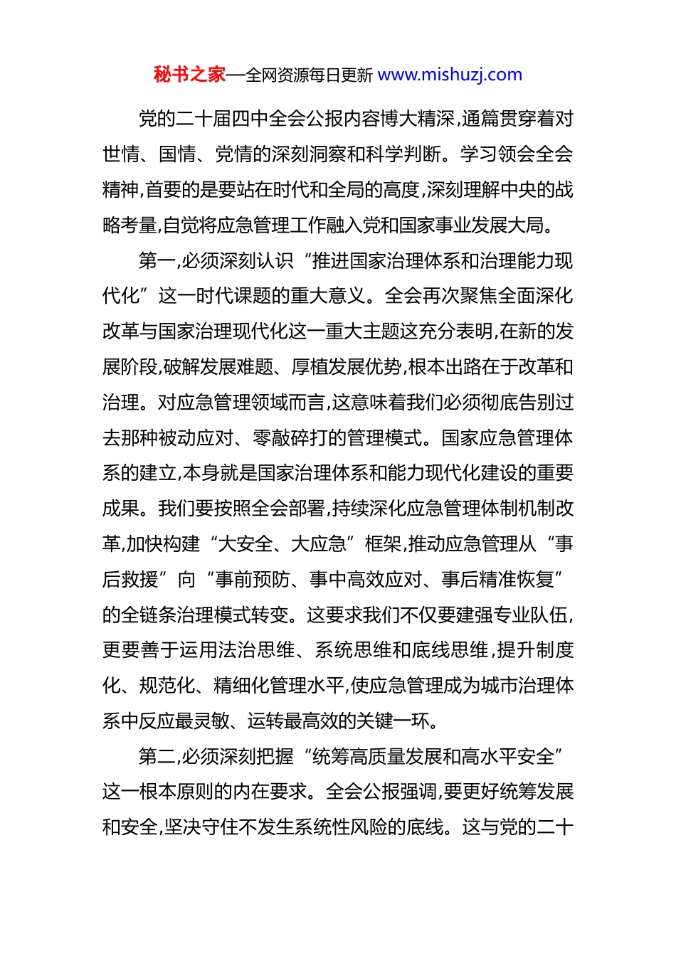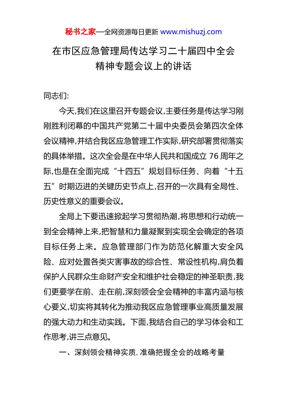 秘书之家—全网资源每日更新 www.mishuzj.com在市区应急管理局传达学习二十届四中全会精神专题会议上的讲话 同志们:今天,我们在这里召开专题会议,主要任务是传达学习刚刚胜利闭幕的中国共产党第二十届中央委员会第四次全体会议精神,并结合我区应急管理工作实际,研究部署贯彻落实的具体举措。这次全会是在中华人民共和国成立 76 周年之际,也是在全面完成“十四五”规划目标任务、向着“十五五”时期迈进的关键历史节点上,召开的一次具有全局性、历史性意义的重要会议。全局上下要迅速掀起学习贯彻热潮,将思想和行动统一到全会精神上来,把智慧和力量凝聚到实现全会确定的各项目标任务上来。应急管理部门作为防范化解重大安全风险、应对处置各类灾害事故的综合性、常设性机构,肩负着保护人民群众生命财产安全和维护社会稳定的神圣职责,我们更要学在前、走在前,深刻领会全会精神的丰富内涵与核心要义,切实将其转化为推动我区应急管理事业高质量发展的强大动力和生动实践。下面,我结合自己的学习体会和工作思考,讲三点意见。一、深刻领会精神实质,准确把握全会的战略考量秘书之家—全网资源每日更新 www.mishuzj.com党的二十届四中全会公报内容博大精深,通篇贯穿着对世情、国情、党情的深刻洞察和科学判断。学习领会全会精神,首要的是要站在时代和全局的高度,深刻理解中央的战略考量,自觉将应急管理工作融入党和国家事业发展大局。第一,必须深刻认识“推进国家治理体系和治理能力现代化”这一时代课题的重大意义。全会再次聚焦全面深化改革与国家治理现代化这一重大主题这充分表明,在新的发展阶段,破解发展难题、厚植发展优势,根本出路在于改革和治理。对应急管理领域而言,这意味着我们必须彻底告别过去那种被动应对、零敲碎打的管理模式。国家应急管理体系的建立,本身就是国家治理体系和能力现代化建设的重要成果。我们要按照全会部署,持续深化应急管理体制机制改革,加快构建“大安全、大应急”框架,推动应急管理从“事后救援”向“事前预防、事中高效应对、事后精准恢复”的全链条治理模式转变。这要求我们不仅要建强专业队伍,更要善于运用法治思维、系统思维和底线思维,提升制度化、规范化、精细化管理水平,使应急管理成为城市治理体系中反应最灵敏、运转最高效的关键一环。第二,必须深刻把握“统筹高质量发展和高水平安全”这一根本原则的内在要求。全会公报强调,要更好统筹发展和安全,坚决守住不发生系统性风险的底线。这与党的二十秘书之家—全网资源每日更新 www.mishuzj.com大报告中“安全是发展的前提,发展是安全的保障”的重要论述一脉相承。当前,我区正处在转型升级、动能转换的关键时期,各类新产业、新业态、新模式不断涌现,城市建设日新月异。越是这样,安全生产的“压舱石”作用就越发凸显。我们必须清醒地认识到,任何时候都不能以牺牲安全为代价换取一时的经济增长。每一次安全事故,都是对发展成果的巨大侵蚀,是对政府公信力的严重损害。因此,全区应急管理系统必须牢固树立“没有安全就没有一切”的理念,坚持把安全发展贯穿于经济社会发展的各领域和全过程。在项目审批、城市规划、产业布局等工作中,要主动作为,强化安全风险评估和论证,从源头上把好安全关,努力实现高质量发展与高水平安全的良性互动。第三,必须深刻领会“以人民为中心”这一发展思想的价值旨归。全会擘画的“十五五”规划蓝图,根本出发点和落脚点都是为了让人民群众过上更加美好的生活。应急管理工作,直接关系到人民群众的生命权、健康权和财产权,是最现实、最直接的民生。全会精神要求我们,必须始终把保护人民生命安全放在首位。这意味着我们的工作标准要更高,工作措施要更实,工作作风要更硬。要时刻把群众的安危冷暖放在心上,想群众之所想、急群众之所急,不仅要在灾害事故发生时冲得上去、救得下来,更要在平时把服务送到基秘书之家—全网资源每日更新 www.mishuzj.com层、把知识送到群众身边,切实提升全社会抵御风险的整体能力,用我们的“辛苦指数”换取人民群众的“安全指数”和“幸福指数”。二、筑牢安全发展根基,全面提升应急管理综合能力贯彻落实二十届四中全会精神,关键在行动,落脚在实效...