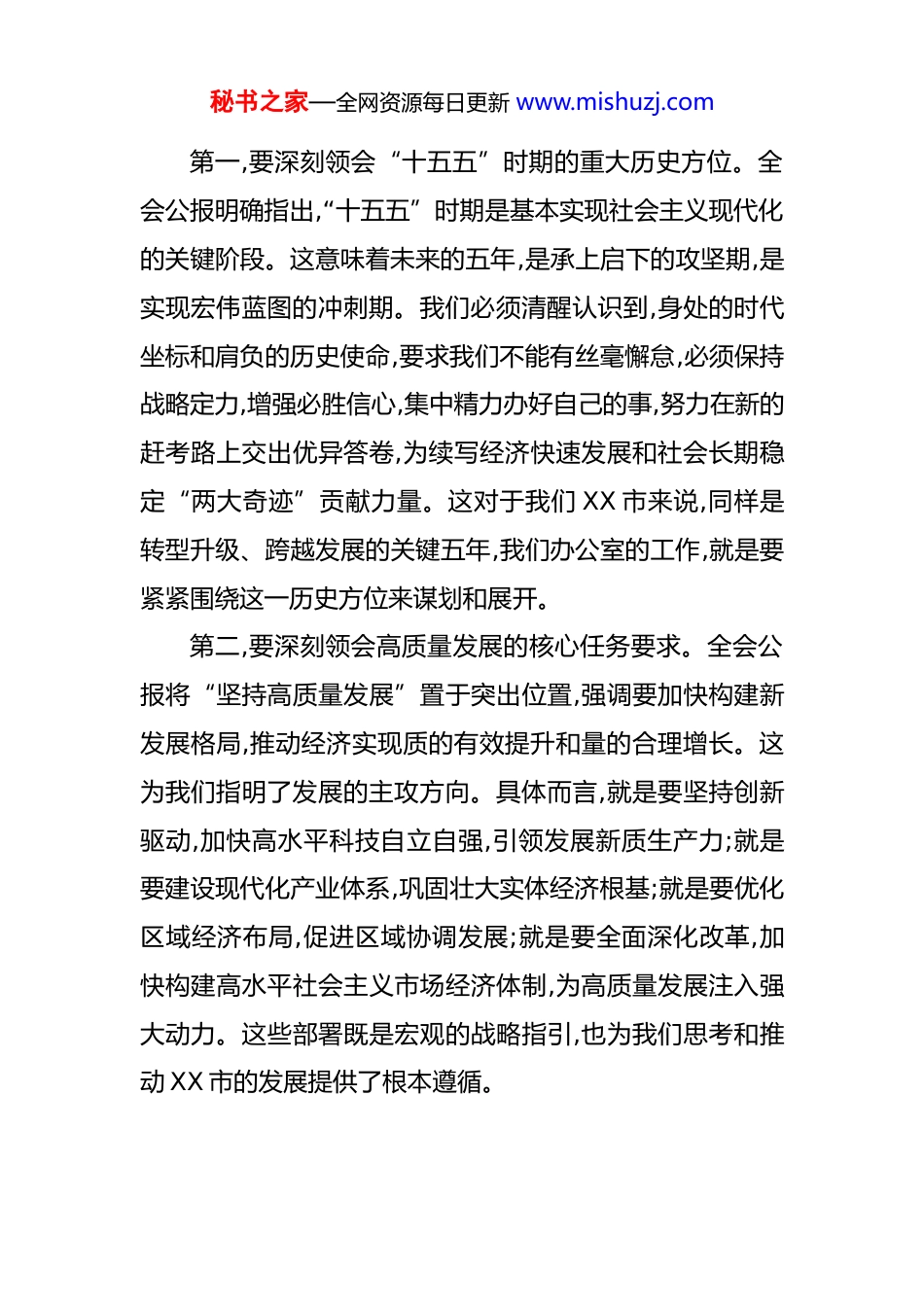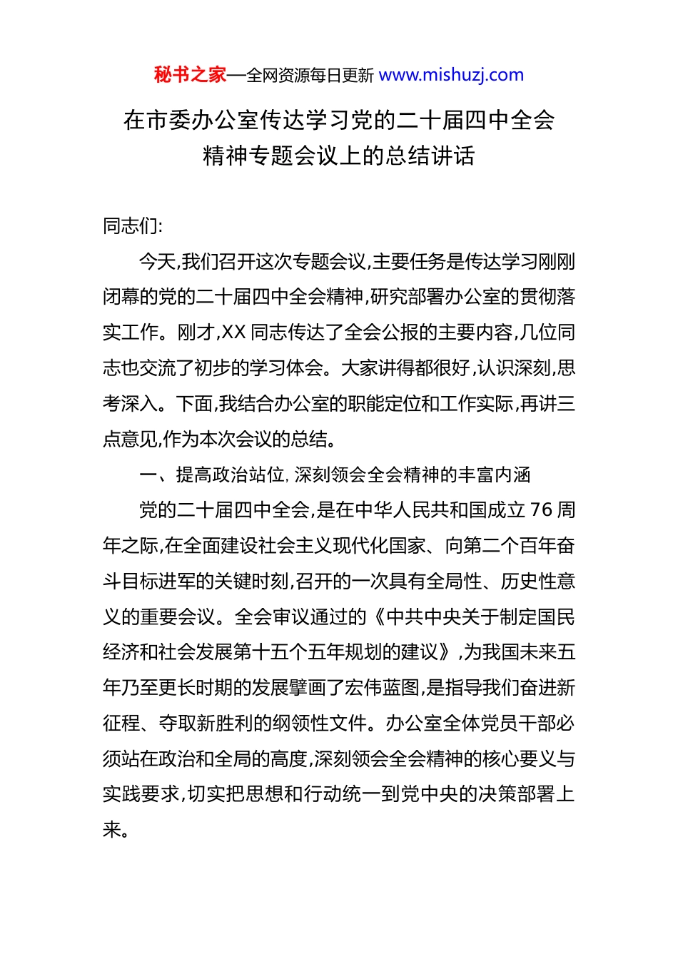 秘书之家—全网资源每日更新 www.mishuzj.com在市委办公室传达学习党的二十届四中全会精神专题会议上的总结讲话 同志们:今天,我们召开这次专题会议,主要任务是传达学习刚刚闭幕的党的二十届四中全会精神,研究部署办公室的贯彻落实工作。刚才,XX 同志传达了全会公报的主要内容,几位同志也交流了初步的学习体会。大家讲得都很好,认识深刻,思考深入。下面,我结合办公室的职能定位和工作实际,再讲三点意见,作为本次会议的总结。 一、提高政治站位,深刻领会全会精神的丰富内涵党的二十届四中全会,是在中华人民共和国成立 76 周年之际,在全面建设社会主义现代化国家、向第二个百年奋斗目标进军的关键时刻,召开的一次具有全局性、历史性意义的重要会议。全会审议通过的《中共中央关于制定国民经济和社会发展第十五个五年规划的建议》,为我国未来五年乃至更长时期的发展擘画了宏伟蓝图,是指导我们奋进新征程、夺取新胜利的纲领性文件。办公室全体党员干部必须站在政治和全局的高度,深刻领会全会精神的核心要义与实践要求,切实把思想和行动统一到党中央的决策部署上来。秘书之家—全网资源每日更新 www.mishuzj.com第一,要深刻领会“十五五”时期的重大历史方位。全会公报明确指出,“十五五”时期是基本实现社会主义现代化的关键阶段。这意味着未来的五年,是承上启下的攻坚期,是实现宏伟蓝图的冲刺期。我们必须清醒认识到,身处的时代坐标和肩负的历史使命,要求我们不能有丝毫懈怠,必须保持战略定力,增强必胜信心,集中精力办好自己的事,努力在新的赶考路上交出优异答卷,为续写经济快速发展和社会长期稳定“两大奇迹”贡献力量。这对于我们 XX 市来说,同样是转型升级、跨越发展的关键五年,我们办公室的工作,就是要紧紧围绕这一历史方位来谋划和展开。第二,要深刻领会高质量发展的核心任务要求。全会公报将“坚持高质量发展”置于突出位置,强调要加快构建新发展格局,推动经济实现质的有效提升和量的合理增长。这为我们指明了发展的主攻方向。具体而言,就是要坚持创新驱动,加快高水平科技自立自强,引领发展新质生产力;就是要建设现代化产业体系,巩固壮大实体经济根基;就是要优化区域经济布局,促进区域协调发展;就是要全面深化改革,加快构建高水平社会主义市场经济体制,为高质量发展注入强大动力。这些部署既是宏观的战略指引,也为我们思考和推动 XX 市的发展提供了根本遵循。秘书之家—全网资源每日更新 www.mishuzj.com第三,要深刻领会以人民为中心的发展思想。全会再次彰显了我们党一以贯之的为民情怀,强调要加大保障和改善民生力度,扎实推进全体人民共同富裕,不断提高人民生活品质。无论是促进高质量充分就业,还是办好人民满意的教育、健全社会保障体系、推进健康中国建设,都体现了发展为了人民、发展依靠人民、发展成果由人民共享的价值追求。市委办公室作为离市委最近、服务群众最直接的部门之一,必须将这种思想融入血脉、见诸行动,始终把人民群众的安危冷暖放在心上。第四,要深刻领会统筹发展和安全的重大原则。安全是发展的前提,发展是安全的保障。全会强调要更好统筹发展和安全,推进国家安全体系和能力现代化。这要求我们在谋划工作、推进发展时,必须增强忧患意识,坚持底线思维,下好先手棋、打好主动仗,有效防范化解政治、经济、社会、生态等各领域风险挑战,确保 XX 市在现代化建设的道路上行稳致远。二、聚焦职责使命,全力做好服务保障的各项工作学习贯彻全会精神,关键在于结合实际、推动工作。市委办公室作为市委的“坚强前哨”和“巩固后院”,承担着参谋辅政、统筹协调、督查督办、服务保障的重要职责。我们必须把全会精神转化为做好“三服务”工作的具体思秘书之家—全网资源每日更新 www.mishuzj.com路、务实举措和实际行动,在服务 XX 市高质量发展大局中展现新担当、新作为。第一,围绕“高质量发展”这一首要任务,当好参谋助手。全会为“十五五”时期的经济工作定下了基调。对照全会要求,我们必须清醒地看到 XX 市当前发展面临的挑战。2024 年,我市地区生产总值增长 3.0%,虽然总量保持领先,但增速有所放缓。特别是第二产业增加值占比仅为19.3%工业基础相对薄...