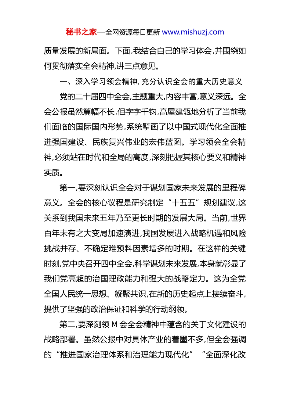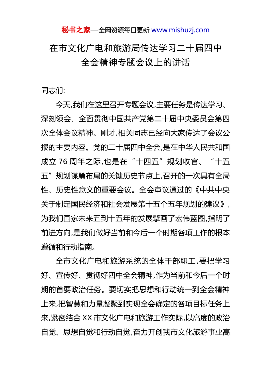 秘书之家—全网资源每日更新 www.mishuzj.com在市文化广电和旅游局传达学习二十届四中全会精神专题会议上的讲话 同志们:今天,我们在这里召开专题会议,主要任务是传达学习、深刻领会、全面贯彻中国共产党第二十届中央委员会第四次全体会议精神。刚才,相关同志已经向大家传达了会议公报的主要内容。党的二十届四中全会,是在中华人民共和国成立 76 周年之际,也是在“十四五”规划收官、“十五五”规划谋篇布局的关键历史节点上,召开的一次具有全局性、历史性意义的重要会议。全会审议通过的《中共中央关于制定国民经济和社会发展第十五个五年规划的建议》,为我们国家未来五到十五年的发展擘画了宏伟蓝图,指明了前进方向,是我们做好当前和今后一个时期各项工作的根本遵循和行动指南。全市文化广电和旅游系统的全体干部职工,要把学习好、宣传好、贯彻好四中全会精神,作为当前和今后一个时期的首要政治任务。要切实把思想和行动统一到全会精神上来,把智慧和力量凝聚到实现全会确定的各项目标任务上来,紧密结合 XX 市文化广电和旅游工作实际,以高度的政治自觉、思想自觉和行动自觉,奋力开创我市文化旅游事业高秘书之家—全网资源每日更新 www.mishuzj.com质量发展的新局面。下面,我结合自己的学习体会,并围绕如何贯彻落实全会精神,讲三点意见。一、深入学习领会精神,充分认识全会的重大历史意义党的二十届四中全会,主题重大,内容丰富,意义深远。全会公报虽然篇幅不长,但字字千钧,高屋建瓴地分析了当前我们面临的国际国内形势,系统擘画了以中国式现代化全面推进强国建设、民族复兴伟业的宏伟蓝图。学习领会全会精神,必须站在时代和全局的高度,深刻把握其核心要义和精神实质。第一,要深刻认识全会对于谋划国家未来发展的里程碑意义。全会的核心议程是研究制定“十五五”规划建议,这关系到我国未来五年乃至更长时期的发展大局。当前,世界百年未有之大变局加速演进,我国发展进入战略机遇和风险挑战并存、不确定难预料因素增多的时期。在这样的关键时刻,党中央召开四中全会,科学谋划未来发展,本身就彰显了我们党高超的治国理政能力和强大的战略定力。这为全党全国人民统一思想、凝聚共识,在新的历史起点上接续奋斗,提供了坚强的政治保证和科学的行动纲领。第二,要深刻领 M 会全会精神中蕴含的关于文化建设的战略部署。虽然公报中对具体产业的着墨不多,但全会强调的“推进国家治理体系和治理能力现代化”“全面深化改秘书之家—全网资源每日更新 www.mishuzj.com革”“推动高质量发展”等重大论断,无不与文化建设和旅游发展息息相关。文化是国家软实力的核心,是民族精神的根脉。推进国家治理现代化,离不开文化自信的强大支撑;构建新发展格局,离不开文旅产业作为重要引擎的驱动作用。党的二十大报告明确提出“推进文化自信自强,铸就社会主义文化新辉煌”,而“十五五”时期正是将这一宏伟目标落到实处的关键五年。因此,全会精神实质上为文化建设和旅游发展提出了更高要求,赋予了更重大的使命。我们必须从党和国家事业发展全局的战略高度,深刻认识到,繁荣发展文化事业和文化产业,是“国之大者”的重要组成部分。第三,要深刻认识全会为我市建设文化旅游强市提供的根本遵循。XX 市作为享誉世界的旅游名城,文旅产业是我市的战略性支柱产业。市委、市政府坚定不移推进世界级旅游城市建设,这是我们肩负的重大政治责任和历史使命。当前,我市正处于爬坡过坎、转型升级的关键阶段。今年上半年,全市接待游客总数达到 8421.39 万人次,实现旅游总收入 1036.24 亿元,产业复苏态势强劲,但对照世界级标准和高质量发展要求,我们在产业结构、产品供给、服务品质、品牌影响等方面仍存在短板和不足。二十届四中全会为我们破解这些难题、实现跨越发展指明了方向。我们必须把全会精神转化为推动 XX 文旅产业高质量发展的强大动力,秘书之家—全网资源每日更新 www.mishuzj.com转化为建设世界级旅游城市的具体思路和务实举措,确保中央决策部署在 XX 落地生根、开花结果。二、坚持守正创新发展,奋力推动文旅产业转型升级学习贯彻全会精神,关键在于结合实际,推动工作。对XX 文旅系统而言,最重要的实际...
