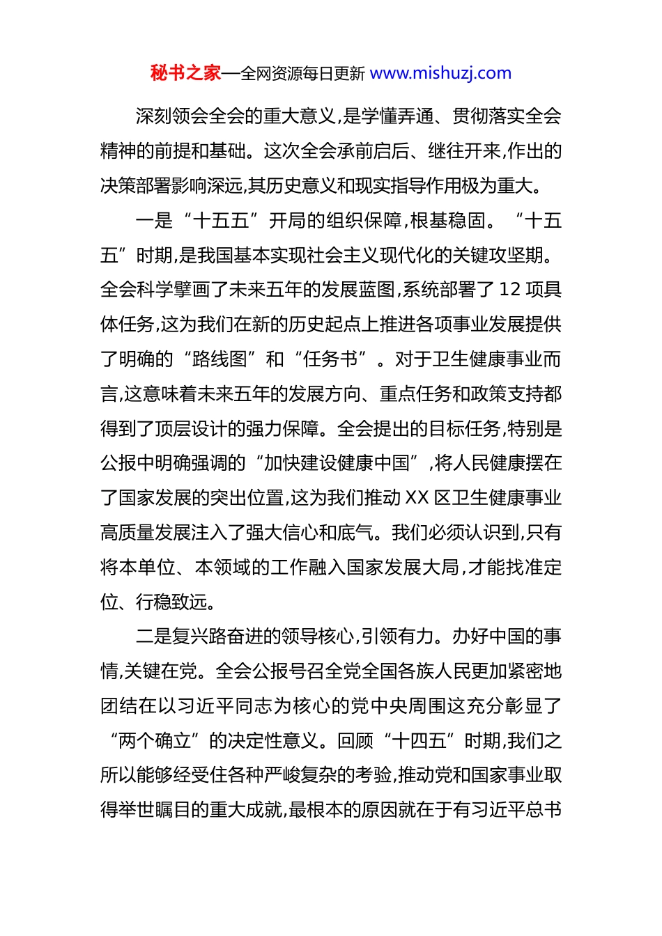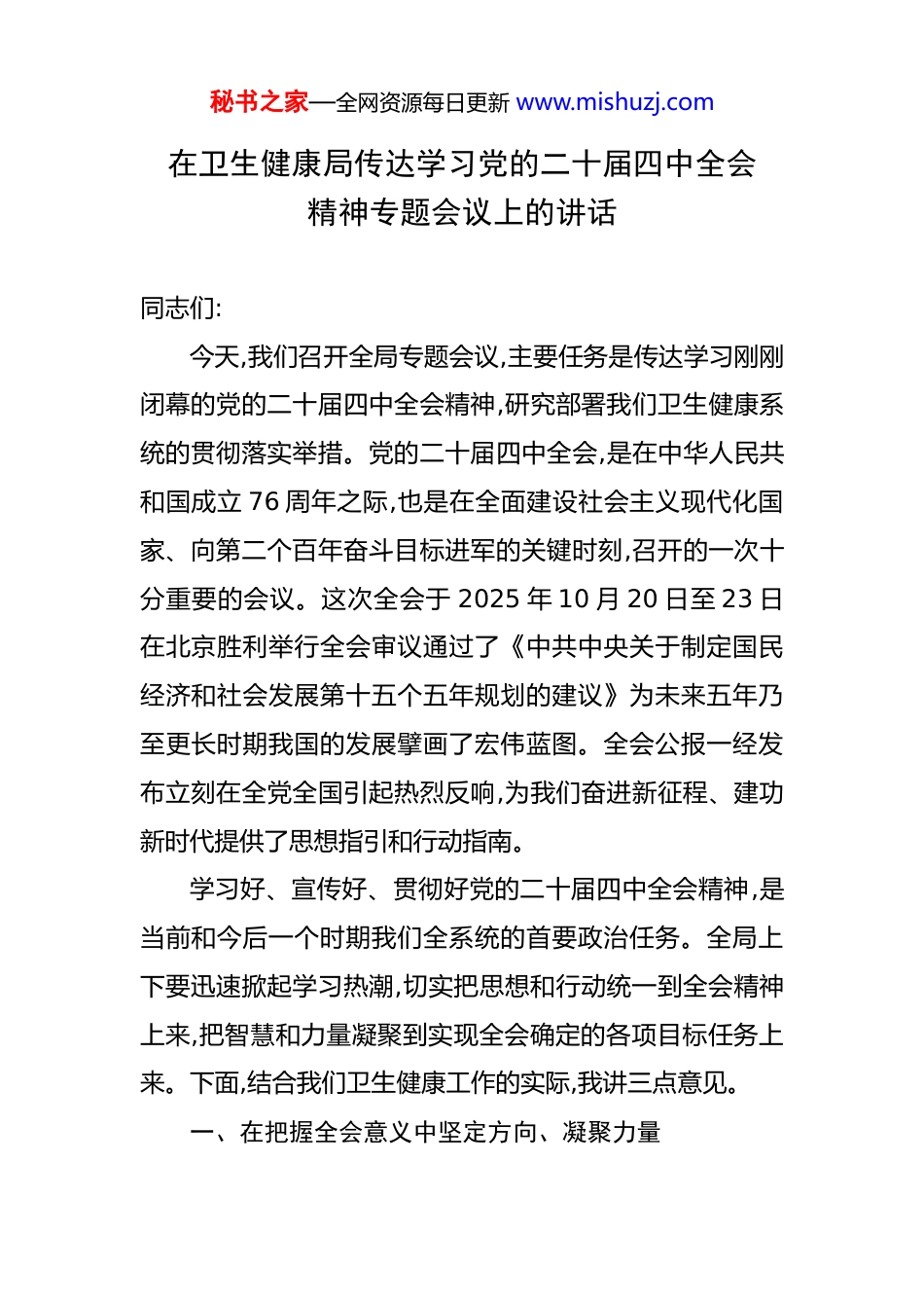 秘书之家—全网资源每日更新 www.mishuzj.com在卫生健康局传达学习党的二十届四中全会精神专题会议上的讲话 同志们:今天,我们召开全局专题会议,主要任务是传达学习刚刚闭幕的党的二十届四中全会精神,研究部署我们卫生健康系统的贯彻落实举措。党的二十届四中全会,是在中华人民共和国成立 76 周年之际,也是在全面建设社会主义现代化国家、向第二个百年奋斗目标进军的关键时刻,召开的一次十分重要的会议。这次全会于 2025 年 10 月 20 日至 23 日在北京胜利举行全会审议通过了《中共中央关于制定国民经济和社会发展第十五个五年规划的建议》为未来五年乃至更长时期我国的发展擘画了宏伟蓝图。全会公报一经发布立刻在全党全国引起热烈反响,为我们奋进新征程、建功新时代提供了思想指引和行动指南。学习好、宣传好、贯彻好党的二十届四中全会精神,是当前和今后一个时期我们全系统的首要政治任务。全局上下要迅速掀起学习热潮,切实把思想和行动统一到全会精神上来,把智慧和力量凝聚到实现全会确定的各项目标任务上来。下面,结合我们卫生健康工作的实际,我讲三点意见。一、在把握全会意义中坚定方向、凝聚力量秘书之家—全网资源每日更新 www.mishuzj.com深刻领会全会的重大意义,是学懂弄通、贯彻落实全会精神的前提和基础。这次全会承前启后、继往开来,作出的决策部署影响深远,其历史意义和现实指导作用极为重大。一是“十五五”开局的组织保障,根基稳固。“十五五”时期,是我国基本实现社会主义现代化的关键攻坚期。全会科学擘画了未来五年的发展蓝图,系统部署了 12 项具体任务,这为我们在新的历史起点上推进各项事业发展提供了明确的“路线图”和“任务书”。对于卫生健康事业而言,这意味着未来五年的发展方向、重点任务和政策支持都得到了顶层设计的强力保障。全会提出的目标任务,特别是公报中明确强调的“加快建设健康中国”,将人民健康摆在了国家发展的突出位置,这为我们推动 XX 区卫生健康事业高质量发展注入了强大信心和底气。我们必须认识到,只有将本单位、本领域的工作融入国家发展大局,才能找准定位、行稳致远。二是复兴路奋进的领导核心,引领有力。办好中国的事情,关键在党。全会公报号召全党全国各族人民更加紧密地团结在以习近平同志为核心的党中央周围这充分彰显了“两个确立”的决定性意义。回顾“十四五”时期,我们之所以能够经受住各种严峻复杂的考验,推动党和国家事业取得举世瞩目的重大成就,最根本的原因就在于有习近平总书秘书之家—全网资源每日更新 www.mishuzj.com记作为党中央的核心、全党的核心掌舵领航,有习近平新时代中国特色社会主义思想科学指引。全会取得的丰硕成果,再一次雄辩地证明了党中央的判断力、决策力和行动力。我们卫生健康系统的全体党员干部,必须深刻领悟“两个确立”的决定性意义,增强“四个意识”、坚定“四个自信”、做到“两个维护”,始终在思想上政治上行动上同以习近平同志为核心的党中央保持高度一致。三是民心向背的集中体现,共识深厚。全会公报字里行间贯穿着以人民为中心的发展思想,强调要“扎实推进全体人民共同富裕”、“解决好人民群众急难愁盼问题”、“办好人民满意的教育”,并把“人民生活品质得到新提高”作为“十五五”时期的主要目标之一。健康是人民幸福之基、社会发展之本。全会把“加快建设健康中国”作为重要任务进行部署,正是对人民群众健康福祉的高度关切,是对“人民至上、生命至上”理念的生动践行。这不仅凝聚了全党共识,更反映了亿万人民的共同心声。作为直接服务于人民群众健康的职能部门,我们肩负的责任无比重大,使命无上光荣。我们必须把满足人民群众日益增长的健康需求作为工作的出发点和落脚点,用实实在在的工作成效回应人民期盼。二、在领会讲话精神中汲取养分、明确使命秘书之家—全网资源每日更新 www.mishuzj.com学习全会精神,重在领会其精神实质和核心要义。全会提出了一系列新思想、新观点、新论断内容博大精深,为我们提供了强大的思想武器。(一)准确把握“十四五”时期的伟大变革。全会高度评价了“十四五”时期我国发展取得的新的重大成就。回望过去几年,我们共同经历了世纪疫情...