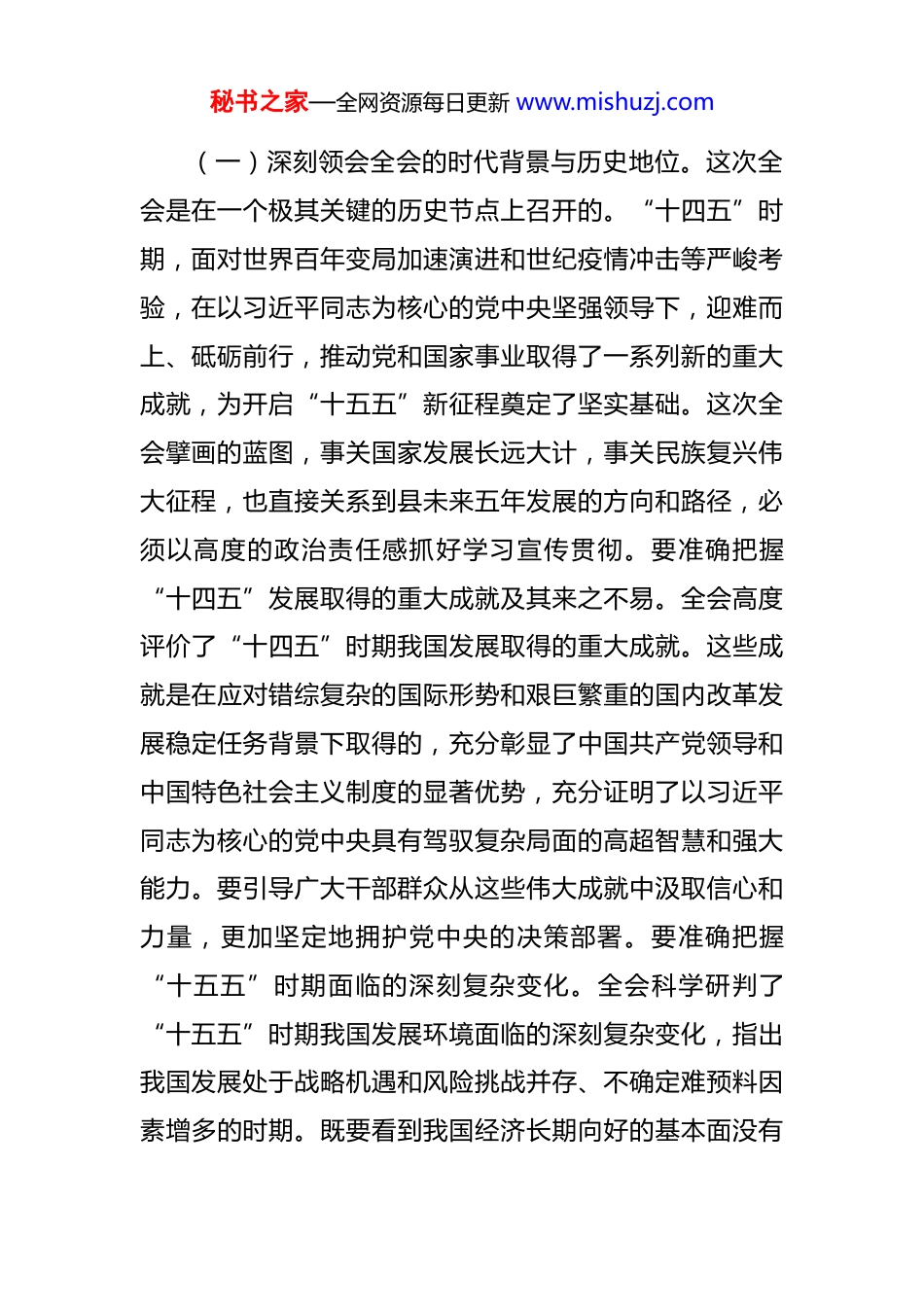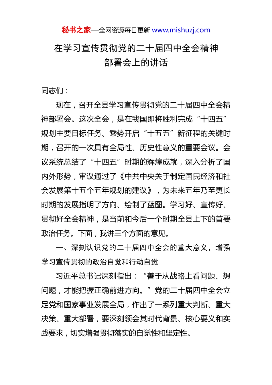 秘书之家—全网资源每日更新 www.mishuzj.com在学习宣传贯彻党的二十届四中全会精神部署会上的讲话 同志们:现在,召开全县学习宣传贯彻党的二十届四中全会精神部署会。这次全会,是在我国即将胜利完成“十四五”规划主要目标任务、乘势开启“十五五”新征程的关键时期,召开的一次具有全局性、历史性意义的重要会议。会议系统总结了“十四五”时期的辉煌成就,深入分析了国内外形势,审议通过了《中共中央关于制定国民经济和社会发展第十五个五年规划的建议》,为未来五年乃至更长时期的发展指明了方向、绘制了蓝图。学习好、宣传好、贯彻好全会精神,是当前和今后一个时期全县上下的首要政治任务。下面,我讲三个方面的意见。一、深刻认识党的二十届四中全会的重大意义,增强学习宣传贯彻的政治自觉和行动自觉习近平总书记深刻指出:“善于从战略上看问题、想问题,才能把握正确前进方向。”党的二十届四中全会立足党和国家事业发展全局,作出了一系列重大判断、重大决策、重大部署,要深刻领会其时代背景、核心要义和实践要求,切实增强贯彻落实的自觉性和坚定性。秘书之家—全网资源每日更新 www.mishuzj.com(一)深刻领会全会的时代背景与历史地位。这次全会是在一个极其关键的历史节点上召开的。“十四五”时期,面对世界百年变局加速演进和世纪疫情冲击等严峻考验,在以习近平同志为核心的党中央坚强领导下,迎难而上、砥砺前行,推动党和国家事业取得了一系列新的重大成就,为开启“十五五”新征程奠定了坚实基础。这次全会擘画的蓝图,事关国家发展长远大计,事关民族复兴伟大征程,也直接关系到县未来五年发展的方向和路径,必须以高度的政治责任感抓好学习宣传贯彻。要准确把握“十四五”发展取得的重大成就及其来之不易。全会高度评价了“十四五”时期我国发展取得的重大成就。这些成就是在应对错综复杂的国际形势和艰巨繁重的国内改革发展稳定任务背景下取得的,充分彰显了中国共产党领导和中国特色社会主义制度的显著优势,充分证明了以习近平同志为核心的党中央具有驾驭复杂局面的高超智慧和强大能力。要引导广大干部群众从这些伟大成就中汲取信心和力量,更加坚定地拥护党中央的决策部署。要准确把握“十五五”时期面临的深刻复杂变化。全会科学研判了“十五五”时期我国发展环境面临的深刻复杂变化,指出我国发展处于战略机遇和风险挑战并存、不确定难预料因素增多的时期。既要看到我国经济长期向好的基本面没有秘书之家—全网资源每日更新 www.mishuzj.com变,制度优势、市场优势、产业体系优势、人才资源优势更加彰显;也要增强忧患意识,树立底线思维,做好应对各种风险挑战的充分准备。要准确把握全会在党和国家事业发展进程中的里程碑意义。这次全会对未来五年发展作出的顶层设计和战略擘画,是指导全面建设社会主义现代化国家的纲领性文件。它标志着在全面建成小康社会、实现第一个百年奋斗目标之后,意气风发地踏上了迈向基本实现社会主义现代化的新征程。深刻理解其历史地位,有助于更好地认清肩上的责任和使命。(二)准确把握全会的核心要义与精神实质。全会精神内涵丰富、思想深邃,必须抓住关键、学深悟透。习近平总书记的重要讲话,是全会精神的集中体现和核心内容。《建议》通篇贯穿着习近平新时代中国特色社会主义思想,是指导“十五五”发展的行动指南。要深刻理解“中国式现代化”这个中心任务。全会紧紧围绕“以中国式现代化全面推进中华民族伟大复兴”这一中心任务进行部署。要深刻把握中国式现代化的中国特色、本质要求和重大原则,理解其与“十五五”规划的内在联系,明确未来五年推进中国式现代化的战略重点和主攻方向。要深刻理解高质量发展这个首要任务。全会强调“十五五”时期经济社会发展要以推动高质量发展为主题。要准确把握秘书之家—全网资源每日更新 www.mishuzj.com《建议》中关于建设现代化产业体系、加快高水平科技自立自强、建设强大国内市场、促进区域协调发展等一系列推动高质量发展的重大举措。要深刻理解全面深化改革这个根本动力。全会强调“十五五”时期要坚持全面深化改革,为高质量发展注入强大动力。要理解进...