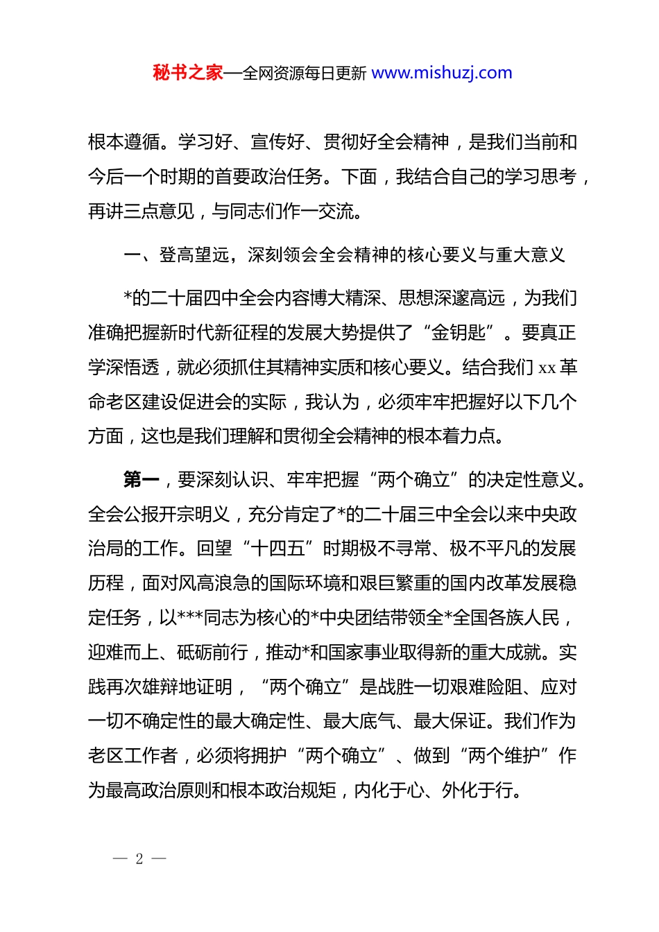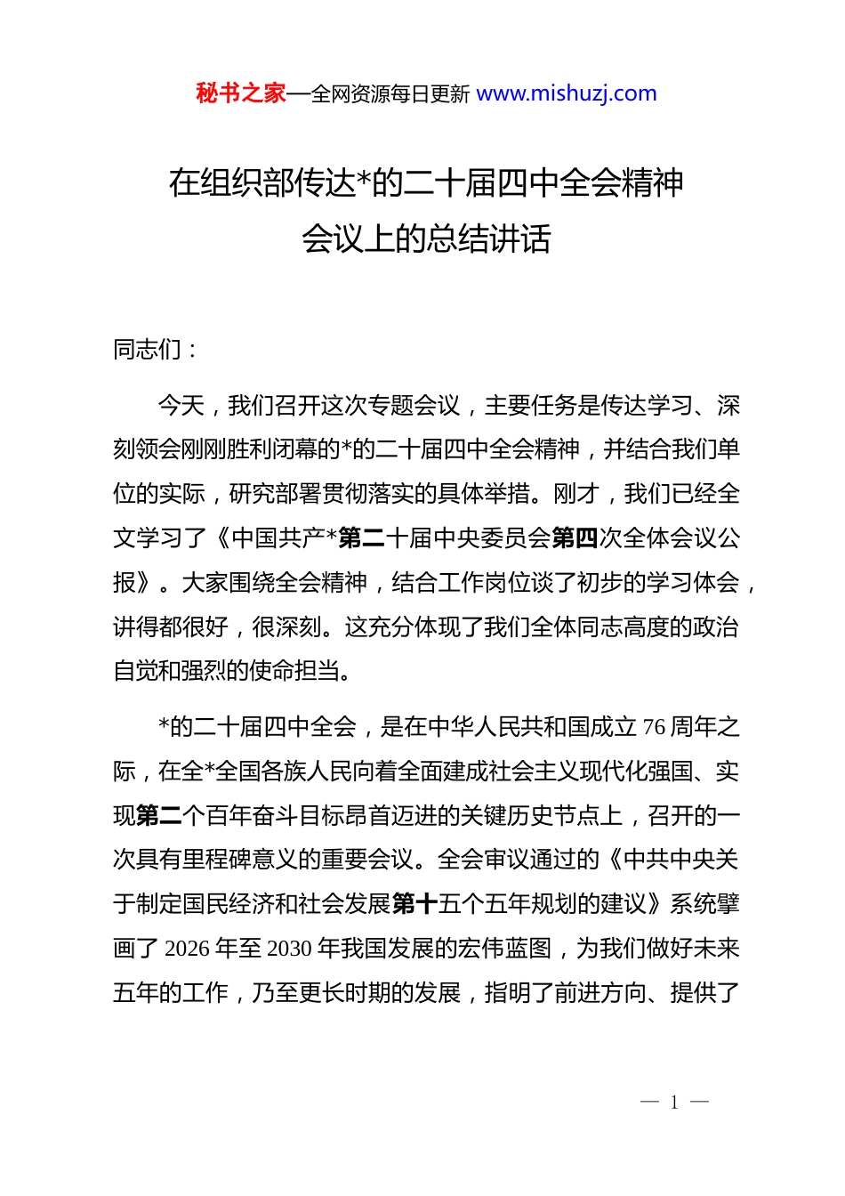 秘书之家—全网资源每日更新 www.mishuzj.com在组织部传达*的二十届四中全会精神会议上的总结讲话同志们:今天,我们召开这次专题会议,主要任务是传达学习、深刻领会刚刚胜利闭幕的*的二十届四中全会精神,并结合我们单位的实际,研究部署贯彻落实的具体举措。刚才,我们已经全文学习了《中国共产*第二十届中央委员会第四次全体会议公报》。大家围绕全会精神,结合工作岗位谈了初步的学习体会,讲得都很好,很深刻。这充分体现了我们全体同志高度的政治自觉和强烈的使命担当。*的二十届四中全会,是在中华人民共和国成立 76 周年之际,在全*全国各族人民向着全面建成社会主义现代化强国、实现第二个百年奋斗目标昂首迈进的关键历史节点上,召开的一次具有里程碑意义的重要会议。全会审议通过的《中共中央关于制定国民经济和社会发展第十五个五年规划的建议》系统擘画了 2026 年至 2030 年我国发展的宏伟蓝图,为我们做好未来五年的工作,乃至更长时期的发展,指明了前进方向、提供了— 1 —秘书之家—全网资源每日更新 www.mishuzj.com根本遵循。学习好、宣传好、贯彻好全会精神,是我们当前和今后一个时期的首要政治任务。下面,我结合自己的学习思考,再讲三点意见,与同志们作一交流。一、登高望远,深刻领会全会精神的核心要义与重大意义*的二十届四中全会内容博大精深、思想深邃高远,为我们准确把握新时代新征程的发展大势提供了“金钥匙”。要真正学深悟透,就必须抓住其精神实质和核心要义。结合我们 xx 革命老区建设促进会的实际,我认为,必须牢牢把握好以下几个方面,这也是我们理解和贯彻全会精神的根本着力点。第一,要深刻认识、牢牢把握“两个确立”的决定性意义。全会公报开宗明义,充分肯定了*的二十届三中全会以来中央政治局的工作。回望“十四五”时期极不寻常、极不平凡的发展历程,面对风高浪急的国际环境和艰巨繁重的国内改革发展稳定任务,以***同志为核心的*中央团结带领全*全国各族人民,迎难而上、砥砺前行,推动*和国家事业取得新的重大成就。实践再次雄辩地证明,“两个确立”是战胜一切艰难险阻、应对一切不确定性的最大确定性、最大底气、最大保证。我们作为老区工作者,必须将拥护“两个确立”、做到“两个维护”作为最高政治原则和根本政治规矩,内化于心、外化于行。— 2 —秘书之家—全网资源每日更新 www.mishuzj.com第二,要深刻认识、牢牢把握新时代以来特别是“十四五”时期我国发展取得的辉煌成就。全会高度评价,“十四五”时期我国发展取得重大成就,中国式现代化迈出坚实步伐。从科技创新实现新突破,到区域协调发展呈现新格局;从民生保障达到新水平,到绿色发展迈出新步伐,这些成就的取得殊为不易。这不仅为开启“十五五”新征程奠定了坚实基础,更极大地增强了我们的信心和底气。我们要善于从这些成就中汲取智慧和力量,坚定历史自信,增强历史主动。第三,要深刻认识、牢牢把握我国发展面临的战略机遇和风险挑战。全会科学分析了当前和今后一个时期的国际国内形势,明确指出我国发展仍然处于重要战略机遇期,但机遇和挑战都有新的发展变化。全会强调,我国经济基础稳、优势多、韧性强、潜能大,长期向好的支撑条件和基本趋势没有变。同时,也必须清醒看到前进道路上依然存在的困难和挑战。这种清醒和坚定,体现了*中央对发展规律的深刻洞察和对复杂局面的精准驾驭。第四,要深刻认识、牢牢把握“十五五”时期经济社会发展的指导思想和基本原则。全会明确,“十五五”时期要高举中国特色社会主义伟大旗帜,坚持以**************思想为指— 3 —秘书之家—全网资源每日更新 www.mishuzj.com导,全面贯彻落实*的二十大和二十届历次全会精神。同时,全会提出了必须坚持的六个基本原则,即坚持*的全面领导、坚持以人民为中心、坚持新发展理念、坚持深化改革开放、坚持系统观念、坚持发扬斗争精神。这“一个指导思想”和“六个基本原则”是“十五五”规划建议的灵魂,是我们一切工作的总纲领。第五,要深刻认识、牢牢把握“十五五”时期经济社会发展的主要目标。全会提出了七个方面的主要目标。其中,特别新增了“高...