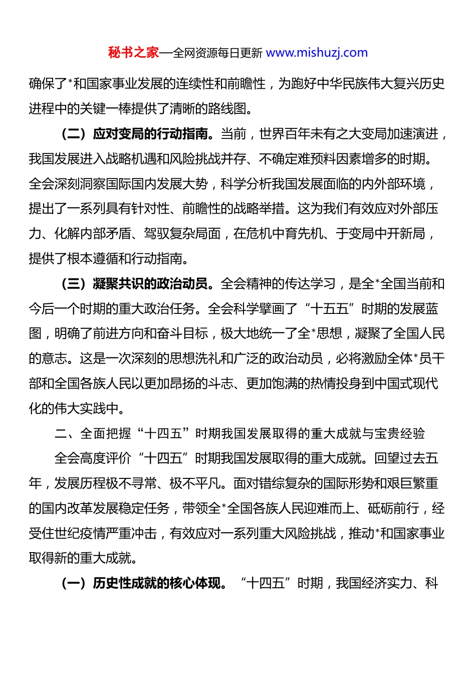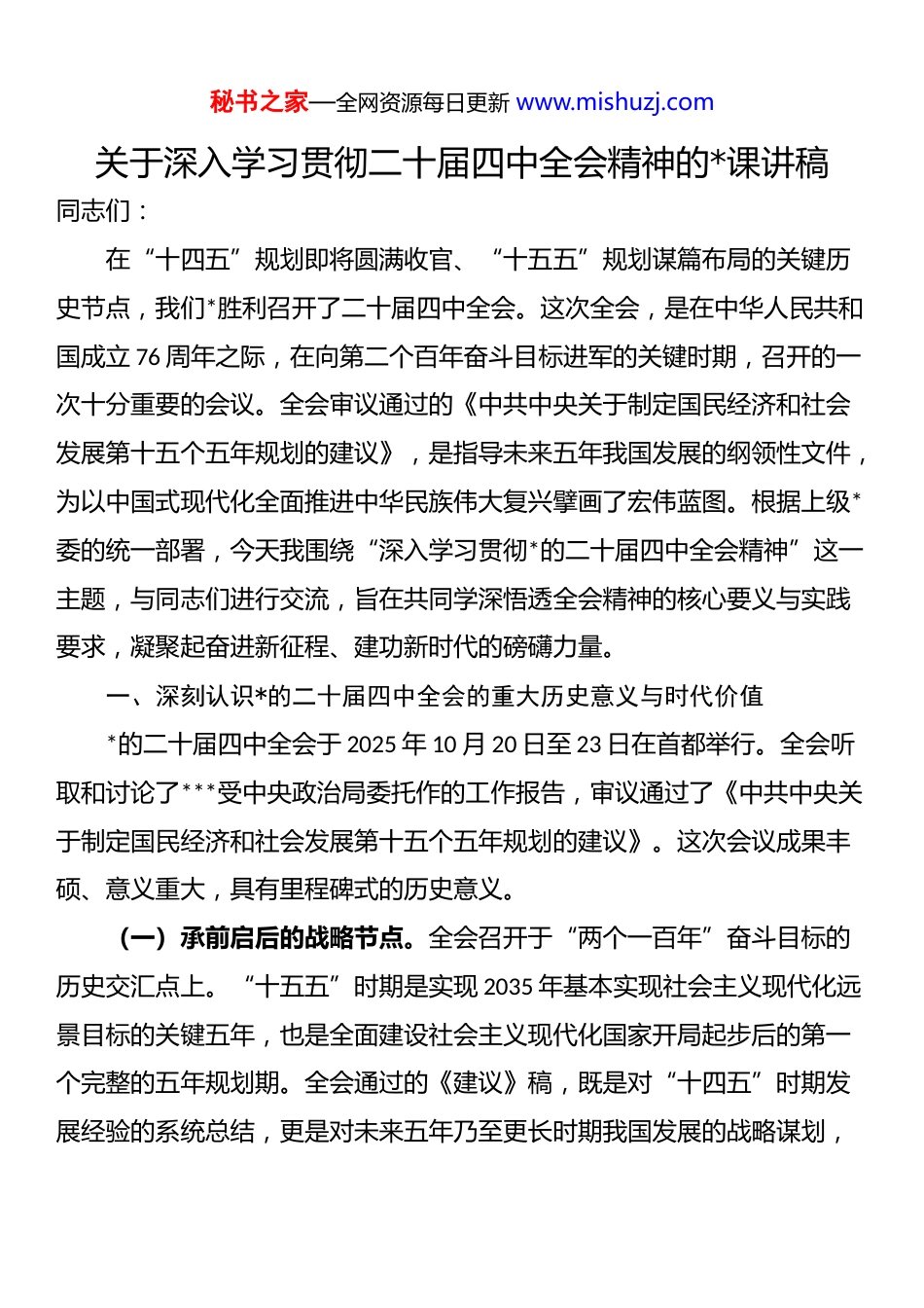 秘书之家—全网资源每日更新 www.mishuzj.com关于深入学习贯彻二十届四中全会精神的*课讲稿同志们:在“十四五”规划即将圆满收官、“十五五”规划谋篇布局的关键历史节点,我们*胜利召开了二十届四中全会。这次全会,是在中华人民共和国成立 76 周年之际,在向第二个百年奋斗目标进军的关键时期,召开的一次十分重要的会议。全会审议通过的《中共中央关于制定国民经济和社会发展第十五个五年规划的建议》,是指导未来五年我国发展的纲领性文件,为以中国式现代化全面推进中华民族伟大复兴擘画了宏伟蓝图。根据上级*委的统一部署,今天我围绕“深入学习贯彻*的二十届四中全会精神”这一主题,与同志们进行交流,旨在共同学深悟透全会精神的核心要义与实践要求,凝聚起奋进新征程、建功新时代的磅礴力量。一、深刻认识*的二十届四中全会的重大历史意义与时代价值*的二十届四中全会于 2025 年 10 月 20 日至 23 日在首都举行。全会听取和讨论了***受中央政治局委托作的工作报告,审议通过了《中共中央关于制定国民经济和社会发展第十五个五年规划的建议》。这次会议成果丰硕、意义重大,具有里程碑式的历史意义。(一)承前启后的战略节点。全会召开于“两个一百年”奋斗目标的历史交汇点上。“十五五”时期是实现 2035 年基本实现社会主义现代化远景目标的关键五年,也是全面建设社会主义现代化国家开局起步后的第一个完整的五年规划期。全会通过的《建议》稿,既是对“十四五”时期发展经验的系统总结,更是对未来五年乃至更长时期我国发展的战略谋划,秘书之家—全网资源每日更新 www.mishuzj.com确保了*和国家事业发展的连续性和前瞻性,为跑好中华民族伟大复兴历史进程中的关键一棒提供了清晰的路线图。(二)应对变局的行动指南。当前,世界百年未有之大变局加速演进,我国发展进入战略机遇和风险挑战并存、不确定难预料因素增多的时期。全会深刻洞察国际国内发展大势,科学分析我国发展面临的内外部环境,提出了一系列具有针对性、前瞻性的战略举措。这为我们有效应对外部压力、化解内部矛盾、驾驭复杂局面,在危机中育先机、于变局中开新局,提供了根本遵循和行动指南。(三)凝聚共识的政治动员。全会精神的传达学习,是全*全国当前和今后一个时期的重大政治任务。全会科学擘画了“十五五”时期的发展蓝图,明确了前进方向和奋斗目标,极大地统一了全*思想,凝聚了全国人民的意志。这是一次深刻的思想洗礼和广泛的政治动员,必将激励全体*员干部和全国各族人民以更加昂扬的斗志、更加饱满的热情投身到中国式现代化的伟大实践中。二、全面把握“十四五”时期我国发展取得的重大成就与宝贵经验全会高度评价“十四五”时期我国发展取得的重大成就。回望过去五年,发展历程极不寻常、极不平凡。面对错综复杂的国际形势和艰巨繁重的国内改革发展稳定任务,带领全*全国各族人民迎难而上、砥砺前行,经受住世纪疫情严重冲击,有效应对一系列重大风险挑战,推动*和国家事业取得新的重大成就。(一)历史性成就的核心体现。“十四五”时期,我国经济实力、科秘书之家—全网资源每日更新 www.mishuzj.com技实力、综合国力跃上新台阶。经济总量历史性突破 140 万亿元大关,人均国内生产总值稳步提升,在全球主要经济体中保持领先增长。科技创新实现新突破,我国在全球创新指数中的排名跃升至世界前十,在载人航天、量子信息、人工智能等前沿领域取得一批重大原创性成果。民生福祉持续改善,城乡居民收入差距逐步缩小,覆盖全民的社会保障体系更加健全,人民群众的获得感、幸福感、安全感显著增强。特别是在 2025 年隆重纪念中国人民抗日战争暨世界反法西斯战争胜利 80 周年,极大振奋了民族精神、激发了爱国热情、凝聚了全*全国人民的奋斗力量。这些成就充分证明,中国式现代化迈出了新的坚实步伐,第二个百年奋斗目标新征程实现了良好开局。(二)成就背后的宝贵经验。这些成就的取得,根本在于*中央的坚强领导,在于***********思想的科学指引。在实践中,我们积累了宝贵的经验。一是在于坚持*的全面领导。这是我们战胜一切艰难险阻的“定海神针”。我们深刻领...