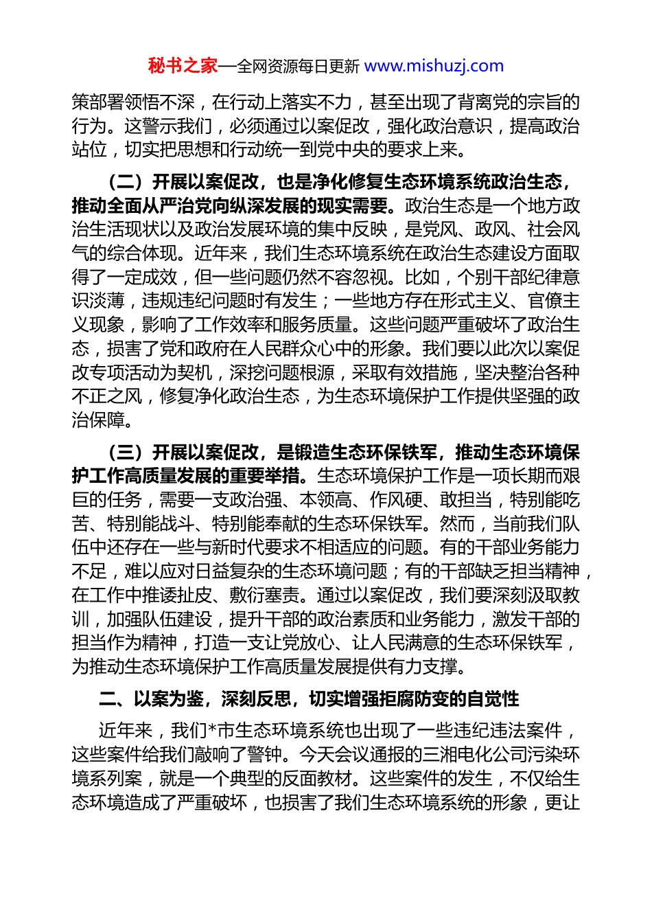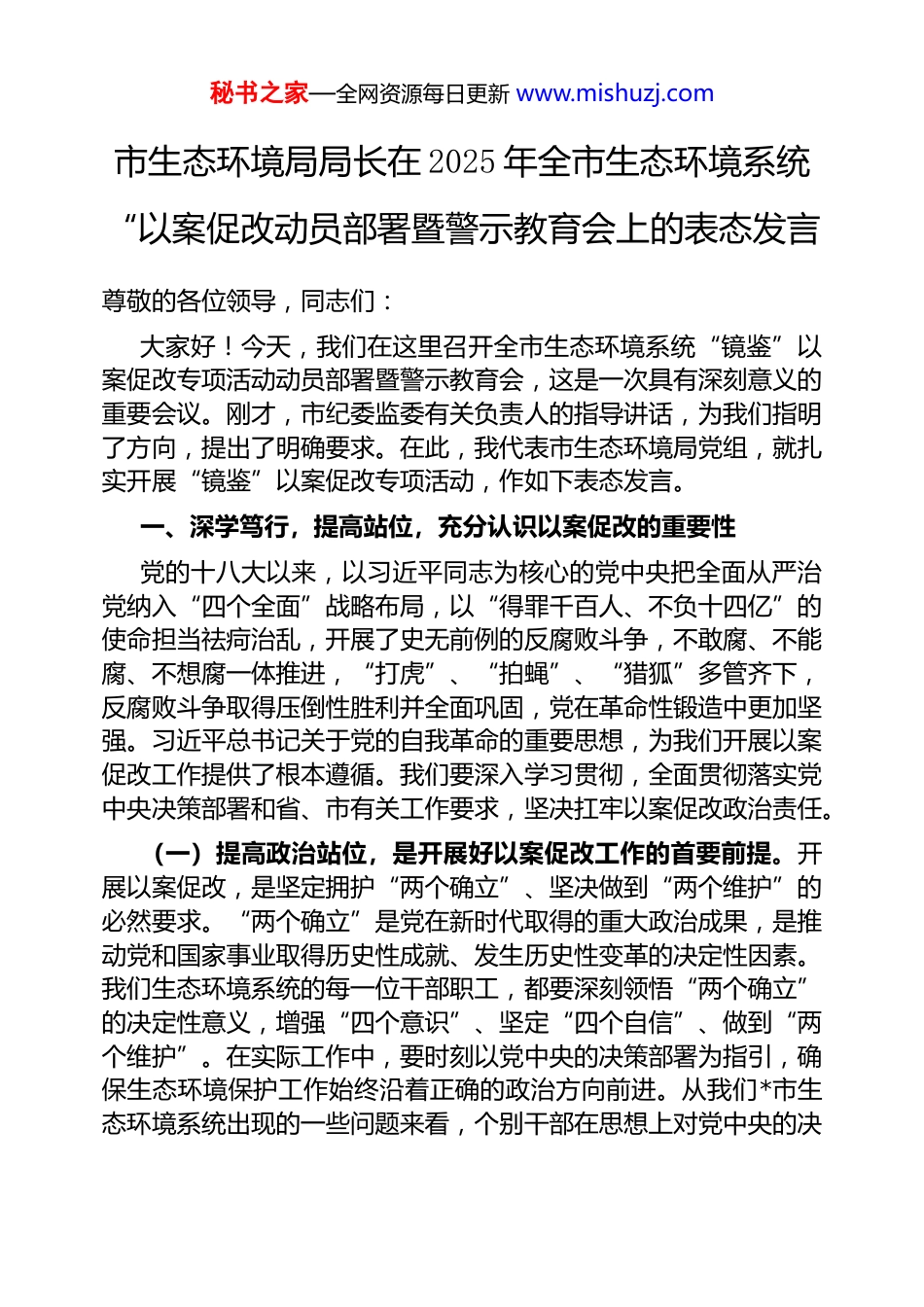 秘书之家—全网资源每日更新 www.mishuzj.com市生态环境局局长在 2025 年全市生态环境系统“以案促改动员部署暨警示教育会上的表态发言尊敬的各位领导,同志们:大家好!今天,我们在这里召开全市生态环境系统“镜鉴”以案促改专项活动动员部署暨警示教育会,这是一次具有深刻意义的重要会议。刚才,市纪委监委有关负责人的指导讲话,为我们指明了方向,提出了明确要求。在此,我代表市生态环境局党组,就扎实开展“镜鉴”以案促改专项活动,作如下表态发言。一、深学笃行,提高站位,充分认识以案促改的重要性党的十八大以来,以习近平同志为核心的党中央把全面从严治党纳入“四个全面”战略布局,以“得罪千百人、不负十四亿”的使命担当祛疴治乱,开展了史无前例的反腐败斗争,不敢腐、不能腐、不想腐一体推进,“打虎”、“拍蝇”、“猎狐”多管齐下,反腐败斗争取得压倒性胜利并全面巩固,党在革命性锻造中更加坚强。习近平总书记关于党的自我革命的重要思想,为我们开展以案促改工作提供了根本遵循。我们要深入学习贯彻,全面贯彻落实党中央决策部署和省、市有关工作要求,坚决扛牢以案促改政治责任。(一)提高政治站位,是开展好以案促改工作的首要前提。开展以案促改,是坚定拥护“两个确立”、坚决做到“两个维护”的必然要求。“两个确立”是党在新时代取得的重大政治成果,是推动党和国家事业取得历史性成就、发生历史性变革的决定性因素。我们生态环境系统的每一位干部职工,都要深刻领悟“两个确立”的决定性意义,增强“四个意识”、坚定“四个自信”、做到“两个维护”。在实际工作中,要时刻以党中央的决策部署为指引,确保生态环境保护工作始终沿着正确的政治方向前进。从我们*市生态环境系统出现的一些问题来看,个别干部在思想上对党中央的决秘书之家—全网资源每日更新 www.mishuzj.com策部署领悟不深,在行动上落实不力,甚至出现了背离党的宗旨的行为。这警示我们,必须通过以案促改,强化政治意识,提高政治站位,切实把思想和行动统一到党中央的要求上来。(二)开展以案促改,也是净化修复生态环境系统政治生态,推动全面从严治党向纵深发展的现实需要。政治生态是一个地方政治生活现状以及政治发展环境的集中反映,是党风、政风、社会风气的综合体现。近年来,我们生态环境系统在政治生态建设方面取得了一定成效,但一些问题仍然不容忽视。比如,个别干部纪律意识淡薄,违规违纪问题时有发生;一些地方存在形式主义、官僚主义现象,影响了工作效率和服务质量。这些问题严重破坏了政治生态,损害了党和政府在人民群众心中的形象。我们要以此次以案促改专项活动为契机,深挖问题根源,采取有效措施,坚决整治各种不正之风,修复净化政治生态,为生态环境保护工作提供坚强的政治保障。(三)开展以案促改,是锻造生态环保铁军,推动生态环境保护工作高质量发展的重要举措。生态环境保护工作是一项长期而艰巨的任务,需要一支政治强、本领高、作风硬、敢担当,特别能吃苦、特别能战斗、特别能奉献的生态环保铁军。然而,当前我们队伍中还存在一些与新时代要求不相适应的问题。有的干部业务能力不足,难以应对日益复杂的生态环境问题;有的干部缺乏担当精神,在工作中推诿扯皮、敷衍塞责。通过以案促改,我们要深刻汲取教训,加强队伍建设,提升干部的政治素质和业务能力,激发干部的担当作为精神,打造一支让党放心、让人民满意的生态环保铁军,为推动生态环境保护工作高质量发展提供有力支撑。二、以案为鉴,深刻反思,切实增强拒腐防变的自觉性近年来,我们*市生态环境系统也出现了一些违纪违法案件,这些案件给我们敲响了警钟。今天会议通报的三湘电化公司污染环境系列案,就是一个典型的反面教材。这些案件的发生,不仅给生态环境造成了严重破坏,也损害了我们生态环境系统的形象,更让秘书之家—全网资源每日更新 www.mishuzj.com我们痛心的是,一些干部因此走上了违法犯罪的道路,失去了自由和尊严。从这些案件中,我们要深刻反思,引以为戒。要牢记“守护好一江碧水”的政治责任,切不可丧失政治立场,忘记初心使命。*地处湘江上游,“守护好一...