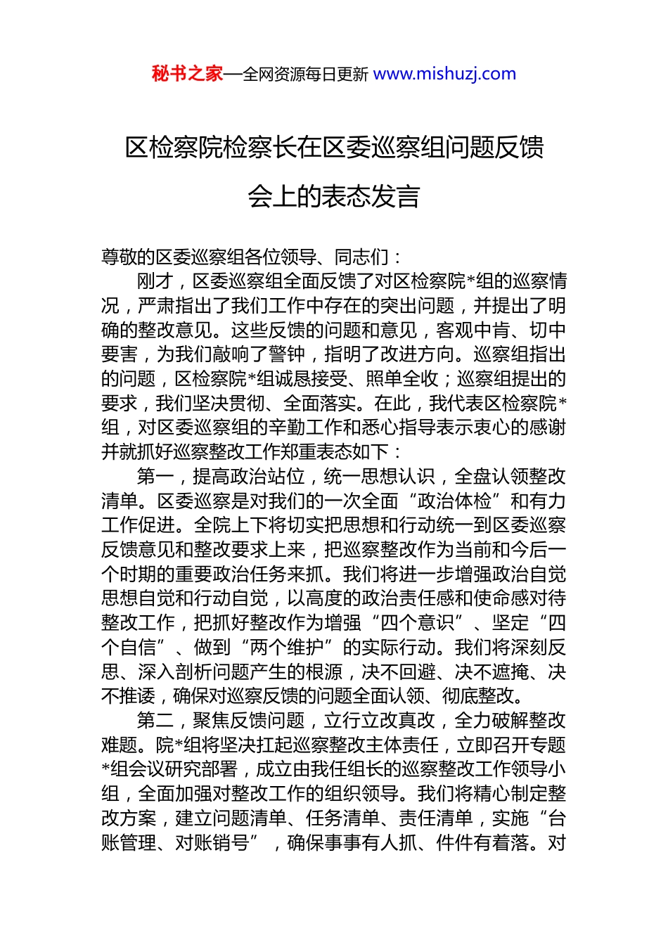 秘书之家—全网资源每日更新 www.mishuzj.com区检察院检察长在区委巡察组问题反馈会上的表态发言尊敬的区委巡察组各位领导、同志们:刚才,区委巡察组全面反馈了对区检察院*组的巡察情况,严肃指出了我们工作中存在的突出问题,并提出了明确的整改意见。这些反馈的问题和意见,客观中肯、切中要害,为我们敲响了警钟,指明了改进方向。巡察组指出的问题,区检察院*组诚恳接受、照单全收;巡察组提出的要求,我们坚决贯彻、全面落实。在此,我代表区检察院*组,对区委巡察组的辛勤工作和悉心指导表示衷心的感谢并就抓好巡察整改工作郑重表态如下:第一,提高政治站位,统一思想认识,全盘认领整改清单。区委巡察是对我们的一次全面“政治体检”和有力工作促进。全院上下将切实把思想和行动统一到区委巡察反馈意见和整改要求上来,把巡察整改作为当前和今后一个时期的重要政治任务来抓。我们将进一步增强政治自觉思想自觉和行动自觉,以高度的政治责任感和使命感对待整改工作,把抓好整改作为增强“四个意识”、坚定“四个自信”、做到“两个维护”的实际行动。我们将深刻反思、深入剖析问题产生的根源,决不回避、决不遮掩、决不推诿,确保对巡察反馈的问题全面认领、彻底整改。第二,聚焦反馈问题,立行立改真改,全力破解整改难题。院*组将坚决扛起巡察整改主体责任,立即召开专题*组会议研究部署,成立由我任组长的巡察整改工作领导小组,全面加强对整改工作的组织领导。我们将精心制定整改方案,建立问题清单、任务清单、责任清单,实施“台账管理、对账销号”,确保事事有人抓、件件有着落。对秘书之家—全网资源每日更新 www.mishuzj.com指出的具体问题,将明确责任主体和完成时限,立行立改限期办结;对普遍性、倾向性问题,将深刻剖析根源,举一反三,开展专项治理,注重从体制机制上堵塞漏洞、强化监管,着力构建长效管理机制,做到解决一个问题、完善一套制度、堵塞一批漏洞,确保整改工作见底见效、落到实处。第三,注重结合转化,强化成果运用,全面助推检察工作。坚持把抓好巡察整改与深入贯彻落实*中央、市委、区委各项决策部署结合起来,与全面落实*组主体责任、加强*风廉政建设结合起来,与持续深化作风建设、锻造过硬检察铁军结合起来,与当前正在推进的政治建设、业务建设、队伍建设等各项具体工作紧密结合起来。我们将以此次巡察整改为契机,把整改成效转化为加强*对检察工作绝对领导的强大动力,转化为提升法律监督能力和水平的实际举措,转化为司法为民、公正司法的生动实践,切实把巡察整改的成果体现在推动新时代检察工作高质量发展上努力向区委和全区人民交上一份满意的整改答卷。总之,区检察院*组将以最坚决的态度、最扎实的作风、最严格的要求、最有力的举措,全力以赴抓好巡察反馈意见的整改落实,确保整改任务按期完成、取得实效,以实际行动维护巡察工作的严肃性和权威性,推动我院各项工作再上新台阶。再次感谢区委巡察组各位领导的指导和帮助!