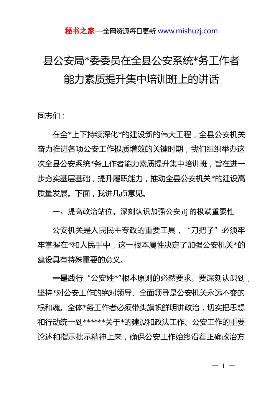 秘书之家—全网资源每日更新 www.mishuzj.com县公安局*委委员在全县公安系统*务工作者能力素质提升集中培训班上的讲话同志们:在全*上下持续深化*的建设新的伟大工程,全县公安机关奋力推进各项公安工作提质增效的关键时期,我们组织举办这次全县公安系统*务工作者能力素质提升集中培训班,旨在进一步夯实基层基础,提升履职能力,推动全县公安机关*的建设高质量发展。下面,我讲几点意见。一、提高政治站位,深刻认识加强公安 dj 的极端重要性公安机关是人民民主专政的重要工具,“刀把子”必须牢牢掌握在*和人民手中,这一根本属性决定了加强公安机关*的建设具有特殊重要的意义。一是践行“公安姓*”根本原则的必然要求。要深刻认识到,坚持*对公安工作的绝对领导、全面领导是公安机关永远不变的根和魂。全体*务工作者必须带头旗帜鲜明讲政治,切实把思想和行动统一到******关于*的建设和政法工作、公安工作的重要论述和指示批示精神上来,确保公安工作始终沿着正确政治方— 1 —秘书之家—全网资源每日更新 www.mishuzj.com向前进。二是应对风险挑战、履行新时代使命任务的现实需要。当前我们面临的形势复杂严峻,肩负的维护国家政治安全和社会稳定的任务艰巨繁重。只有把 dj 设得更加坚强有力,才能有效凝聚警心、鼓舞斗志,使基层*组织成为攻无不克、战无不胜的坚强战斗堡垒,为圆满完成各项使命任务提供强大政治保证和组织保证。三是锻造高素质过硬公安铁军的内在要求。*的建设是队伍建设的关键。必须通过加强*的建设,强化政治淬炼、思想洗礼、作风锤炼、纪律整肃,教育引导全警永葆对*忠诚的政治本色,着力锻造一支有铁一般的理想信念、铁一般的责任担当、铁一般的过硬本领、铁一般的纪律作风的公安队伍。二、聚焦能力提升,争做精通*务的行家里手*务工作者是*的活动的组织者、实践者、推动者,其能力素质直接关系到 dj 工作的质量和水平。大家必须以此次培训为新的起点,着力提升以下几方面能力:一要提升政治理论素养。要带头深入学习*的创新理论,特别是关于*的建设的重要论述,深刻领悟“两个确立”的决定性— 2 —秘书之家—全网资源每日更新 www.mishuzj.com意义,增强“四个意识”、坚定“四个自信”、做到“两个维护”。要不断提高政治判断力、政治领悟力、政治执行力,善于从政治上观察、分析和处理问题。二要精通 dj 业务知识。要熟练掌握*章*规 dj,熟悉发展*员、组织生活、“三会一课”、民主评议*员、谈心谈话、*费收缴使用管理等基本制度和流程。要成为 dj 工作的“政策通”“活字典”,确保各项*务工作规范、有序、高效开展。三要掌握科学工作方法。要善于运用法治思维、改革精神、创新办法来谋划和推进 dj 工作。要探索符合公安特点、贴近*员实际的 dj 工作新模式、新载体,增强组织生活的吸引力、感染力和实效性,避免“两张皮”和形式主义。三、围绕中心大局,推动 dj 与业务深度融合dj 工作只有围绕中心、服务大局,与公安业务工作同频共振、深度融合,才能有生命力、有战斗力。一要坚持在大局下谋划。要自觉将公安 dj 工作置于全县改革发展稳定大局和公安中心工作中去思考、去定位、去摆布。要紧扣维护安全稳定、打击违法犯罪、服务人民群众、深化公安改革等重点工作,找准 dj 工作的切入点和着力点,使 dj 工作— 3 —秘书之家—全网资源每日更新 www.mishuzj.com目标与业务工作目标同向聚合。二要坚持在融合上发力。要积极探索 dj 与业务深度融合的有效路径。把业务工作的难点作为 dj 工作的重点,通过发挥*组织的战斗堡垒作用和*员的先锋模范作用,来破解工作瓶颈、推动任务落实。要坚决防止就 dj 抓 dj,搞“体内循环”。三要坚持以实效来检验。要把推动公安工作发展、提升队伍战斗力、提高人民群众安全感满意度作为衡量 dj 工作成效的根本标准。通过扎实有效的 dj 工作,激发队伍内生动力,提升履职能力,以高质量 dj 引领和保障 xx 公安工作高质量发展,为维护 xx 县社会稳定和长治久安做出更大贡献。四、强化责任担当,确保培训取得扎实成效组织此次培训投入了大量精力,希望大家珍惜机会...