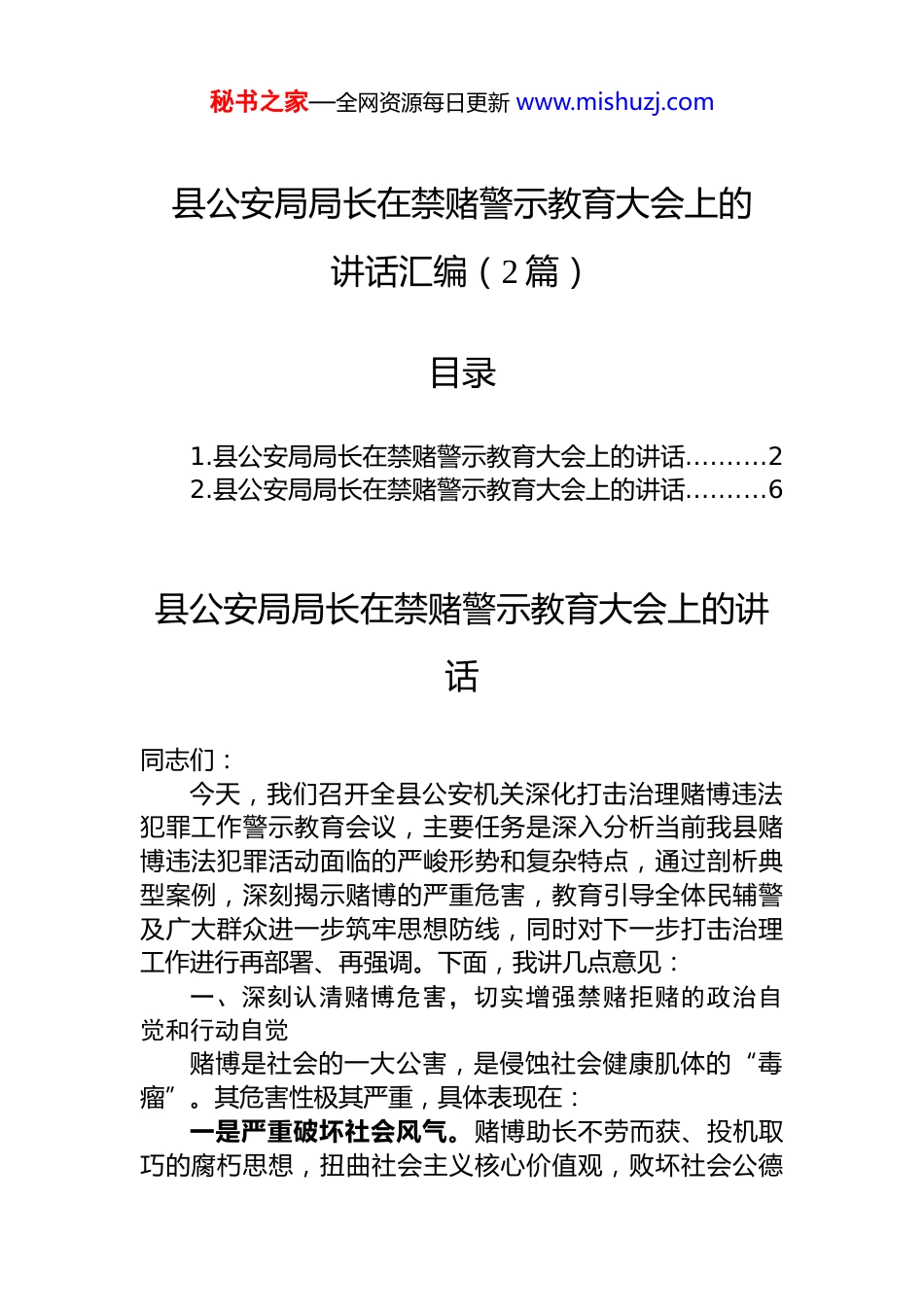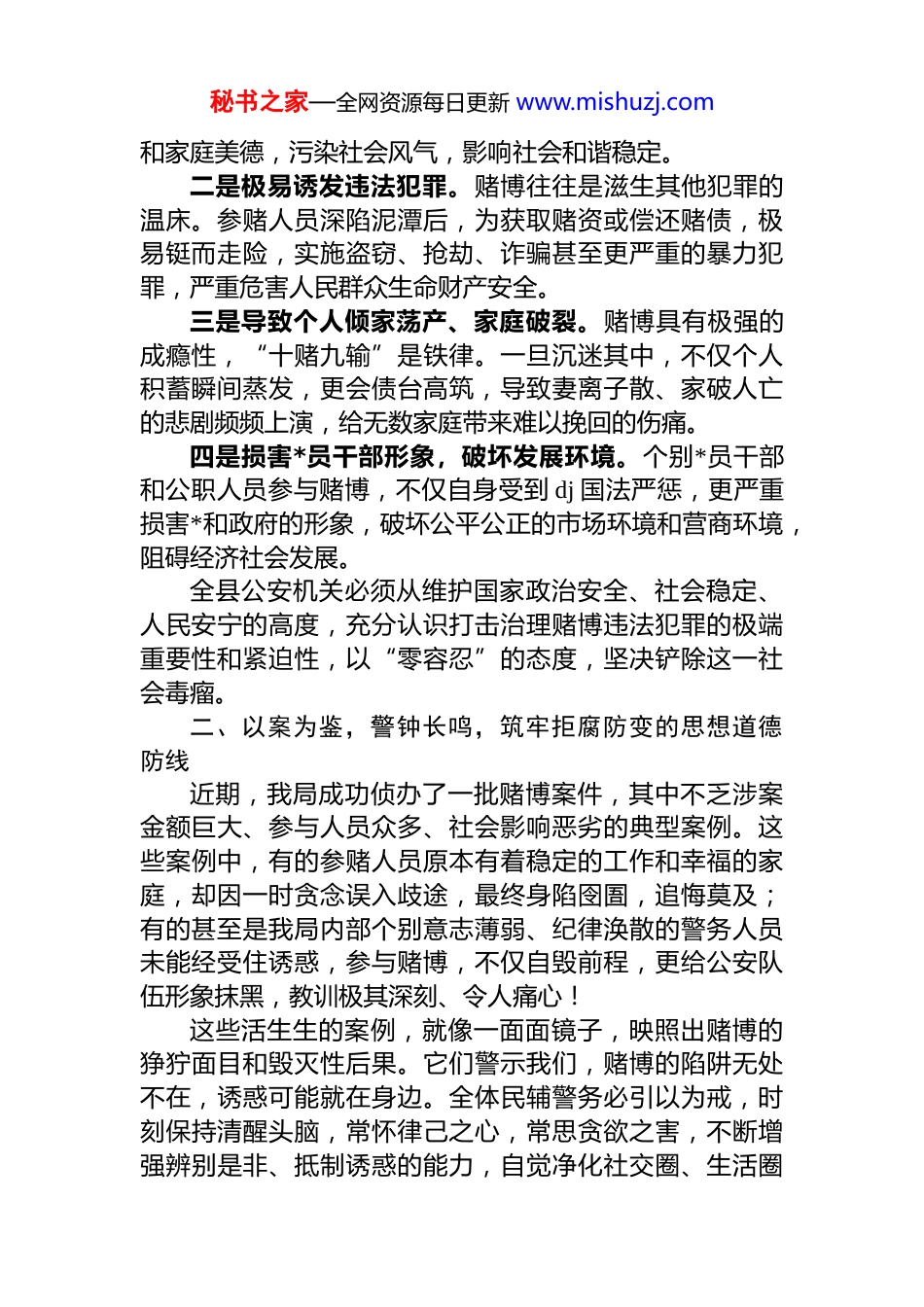 秘书之家—全网资源每日更新 www.mishuzj.com县公安局局长在禁赌警示教育大会上的讲话汇编(2 篇)目录1.县公安局局长在禁赌警示教育大会上的讲话..........22.县公安局局长在禁赌警示教育大会上的讲话..........6县公安局局长在禁赌警示教育大会上的讲话同志们:今天,我们召开全县公安机关深化打击治理赌博违法犯罪工作警示教育会议,主要任务是深入分析当前我县赌博违法犯罪活动面临的严峻形势和复杂特点,通过剖析典型案例,深刻揭示赌博的严重危害,教育引导全体民辅警及广大群众进一步筑牢思想防线,同时对下一步打击治理工作进行再部署、再强调。下面,我讲几点意见:一、深刻认清赌博危害,切实增强禁赌拒赌的政治自觉和行动自觉赌博是社会的一大公害,是侵蚀社会健康肌体的“毒瘤”。其危害性极其严重,具体表现在:一是严重破坏社会风气。赌博助长不劳而获、投机取巧的腐朽思想,扭曲社会主义核心价值观,败坏社会公德秘书之家—全网资源每日更新 www.mishuzj.com和家庭美德,污染社会风气,影响社会和谐稳定。二是极易诱发违法犯罪。赌博往往是滋生其他犯罪的温床。参赌人员深陷泥潭后,为获取赌资或偿还赌债,极易铤而走险,实施盗窃、抢劫、诈骗甚至更严重的暴力犯罪,严重危害人民群众生命财产安全。三是导致个人倾家荡产、家庭破裂。赌博具有极强的成瘾性,“十赌九输”是铁律。一旦沉迷其中,不仅个人积蓄瞬间蒸发,更会债台高筑,导致妻离子散、家破人亡的悲剧频频上演,给无数家庭带来难以挽回的伤痛。四是损害*员干部形象,破坏发展环境。个别*员干部和公职人员参与赌博,不仅自身受到 dj 国法严惩,更严重损害*和政府的形象,破坏公平公正的市场环境和营商环境,阻碍经济社会发展。全县公安机关必须从维护国家政治安全、社会稳定、人民安宁的高度,充分认识打击治理赌博违法犯罪的极端重要性和紧迫性,以“零容忍”的态度,坚决铲除这一社会毒瘤。二、以案为鉴,警钟长鸣,筑牢拒腐防变的思想道德防线近期,我局成功侦办了一批赌博案件,其中不乏涉案金额巨大、参与人员众多、社会影响恶劣的典型案例。这些案例中,有的参赌人员原本有着稳定的工作和幸福的家庭,却因一时贪念误入歧途,最终身陷囹圄,追悔莫及;有的甚至是我局内部个别意志薄弱、纪律涣散的警务人员未能经受住诱惑,参与赌博,不仅自毁前程,更给公安队伍形象抹黑,教训极其深刻、令人痛心!这些活生生的案例,就像一面面镜子,映照出赌博的狰狞面目和毁灭性后果。它们警示我们,赌博的陷阱无处不在,诱惑可能就在身边。全体民辅警务必引以为戒,时刻保持清醒头脑,常怀律己之心,常思贪欲之害,不断增强辨别是非、抵制诱惑的能力,自觉净化社交圈、生活圈秘书之家—全网资源每日更新 www.mishuzj.com朋友圈,坚决守住法律底线和纪律红线。同时,我们也要通过这些案例,向社会广泛宣传,教育引导广大群众认清赌博危害,自觉远离赌博恶习。三、重拳出击,标本兼治,坚决遏制赌博违法犯罪活动蔓延势头面对依然严峻复杂的赌博违法犯罪形势,全县公安机关必须保持高压态势,采取更加有力、更加精准的措施,深入推进打击治理工作:一要强化线索摸排,提升精准打击能力。要广辟线索来源,充分运用信息化手段和传统走访相结合的方式,深入排查网络赌博、流动赌场、地下赌档等违法犯罪活动线索。要加强情报研判,实施精准打击,确保打准打狠、打出实效。二要突出打击重点,严惩组织者和骨干分子。要坚持“打团伙、端窝点、断链条、摧网络”的工作思路,将打击锋芒对准赌博活动的组织者、经营者、获利者和“保护伞”。对于开设赌场、聚众赌博、暴力护赌等严重犯罪行为,要依法从严从重惩处,形成强大震慑。三要深化源头治理,铲除赌博滋生土壤。要加强与文旅、市场监管、金融监管等部门的协作配合,强化对棋牌室、茶楼、宾馆酒店等重点场所的日常监管,挤压赌博活动空间。要密切关注网络赌博新动态、新手法,加强技术反制,切断网络赌博传播链条和资金通道。四要加强宣传教育,营造全民拒赌浓厚氛围。要充分利用各类媒体平台,以案说法,深刻揭露赌博骗局和危害提高群众防范意识。要推动禁赌宣传...