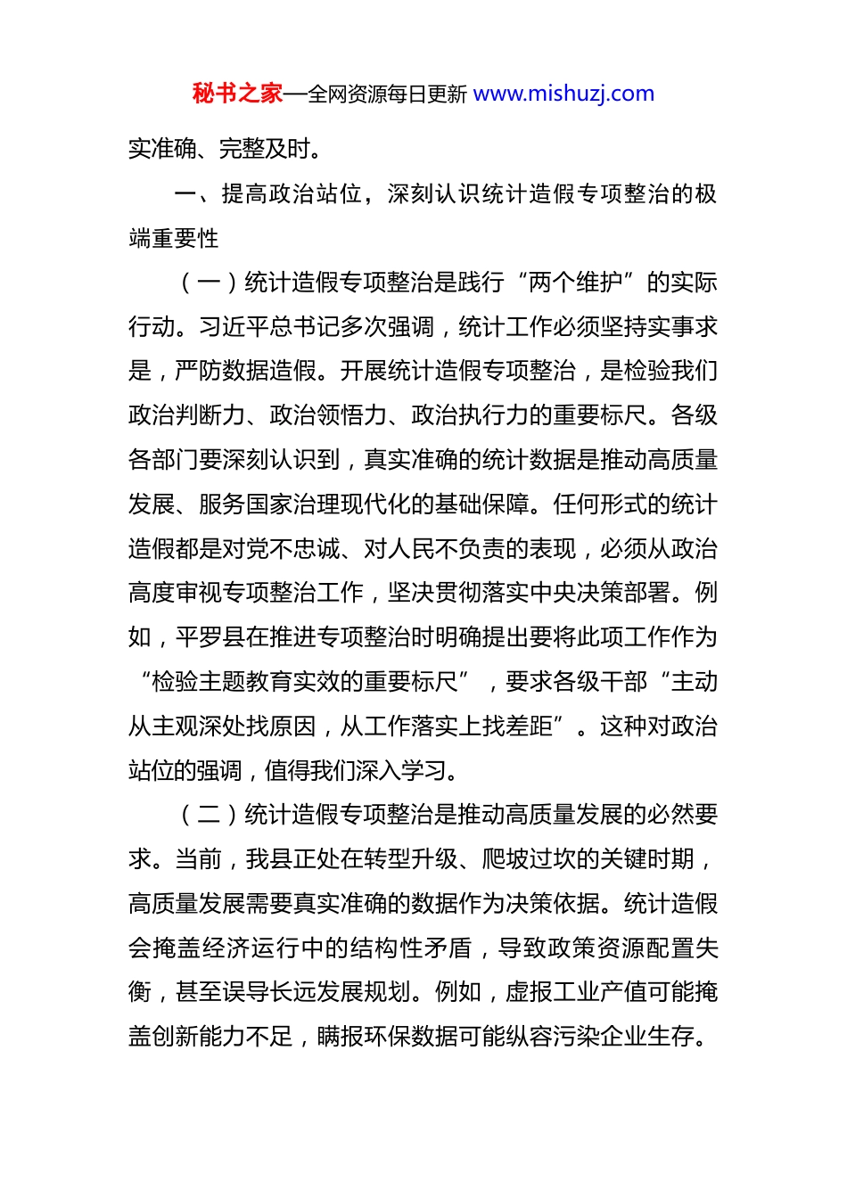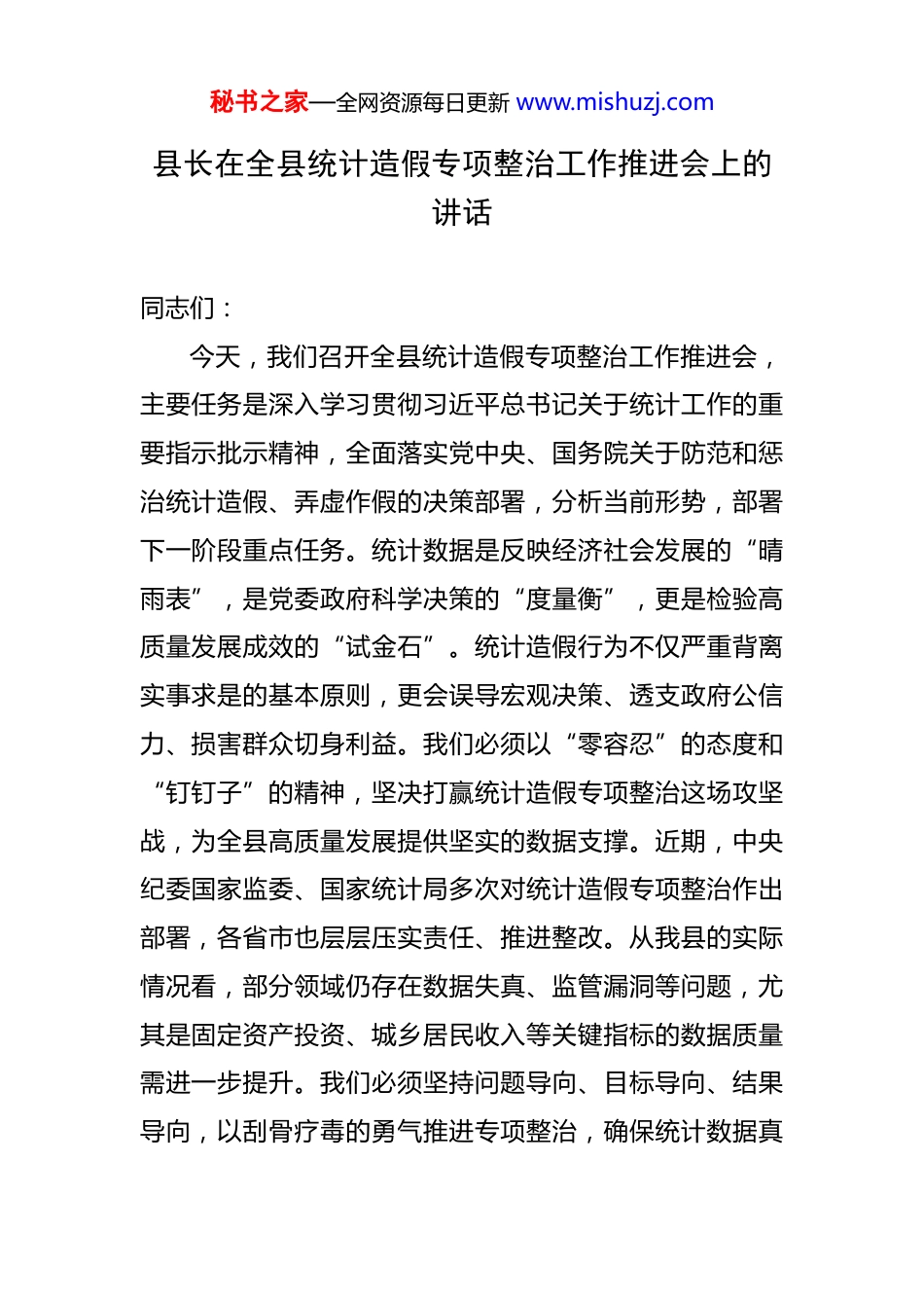 秘书之家—全网资源每日更新 www.mishuzj.com县长在全县统计造假专项整治工作推进会上的讲话 同志们:今天,我们召开全县统计造假专项整治工作推进会,主要任务是深入学习贯彻习近平总书记关于统计工作的重要指示批示精神,全面落实党中央、国务院关于防范和惩治统计造假、弄虚作假的决策部署,分析当前形势,部署下一阶段重点任务。统计数据是反映经济社会发展的“晴雨表”,是党委政府科学决策的“度量衡”,更是检验高质量发展成效的“试金石”。统计造假行为不仅严重背离实事求是的基本原则,更会误导宏观决策、透支政府公信力、损害群众切身利益。我们必须以“零容忍”的态度和“钉钉子”的精神,坚决打赢统计造假专项整治这场攻坚战,为全县高质量发展提供坚实的数据支撑。近期,中央纪委国家监委、国家统计局多次对统计造假专项整治作出部署,各省市也层层压实责任、推进整改。从我县的实际情况看,部分领域仍存在数据失真、监管漏洞等问题,尤其是固定资产投资、城乡居民收入等关键指标的数据质量需进一步提升。我们必须坚持问题导向、目标导向、结果导向,以刮骨疗毒的勇气推进专项整治,确保统计数据真秘书之家—全网资源每日更新 www.mishuzj.com实准确、完整及时。一、提高政治站位,深刻认识统计造假专项整治的极端重要性(一)统计造假专项整治是践行“两个维护”的实际行动。习近平总书记多次强调,统计工作必须坚持实事求是,严防数据造假。开展统计造假专项整治,是检验我们政治判断力、政治领悟力、政治执行力的重要标尺。各级各部门要深刻认识到,真实准确的统计数据是推动高质量发展、服务国家治理现代化的基础保障。任何形式的统计造假都是对党不忠诚、对人民不负责的表现,必须从政治高度审视专项整治工作,坚决贯彻落实中央决策部署。例如,平罗县在推进专项整治时明确提出要将此项工作作为“检验主题教育实效的重要标尺”,要求各级干部“主动从主观深处找原因,从工作落实上找差距”。这种对政治站位的强调,值得我们深入学习。(二)统计造假专项整治是推动高质量发展的必然要求。当前,我县正处在转型升级、爬坡过坎的关键时期,高质量发展需要真实准确的数据作为决策依据。统计造假会掩盖经济运行中的结构性矛盾,导致政策资源配置失衡,甚至误导长远发展规划。例如,虚报工业产值可能掩盖创新能力不足,瞒报环保数据可能纵容污染企业生存。秘书之家—全网资源每日更新 www.mishuzj.com只有挤干数据“水分”,才能精准把握发展态势,优化产业结构,提升经济韧性和竞争力。德安县在部署统计工作时特别强调,要“为全县高质量发展筑牢数据根基”,这一导向与我县实际高度契合。(三)统计造假专项整治是维护群众利益的重要举措。统计数据与就业、收入、教育、医疗等民生领域息息相关。虚假的民生数据可能导致政策制定偏离实际,影响惠民政策落地效果。比如,扶贫数据造假会让真正需要帮助的群众得不到扶持,就业数据注水会掩盖结构性失业风险。我们必须通过专项整治,确保数据真实反映群众诉求,让发展成果更多更公平惠及人民群众。洛扎县在推进专项治理时,将“农牧民人均可支配收入”等直接关系群众生活的指标作为重点监督领域,体现了对群众利益的高度关注。(四)统计造假专项整治是提升政府公信力的核心途径。政府的公信力源于其决策的科学性和行为的公正性,而真实准确的统计数据是政府公信力的重要支撑。一旦统计数据出现造假,会让群众对政府的诚信产生怀疑,损害政府在群众心中的形象。通过专项整治,严肃查处统计造假行为,公开透明地公布真实数据,可以向群众展示政府维护数据真实性的决心,从而重新赢得群众的信任。成安秘书之家—全网资源每日更新 www.mishuzj.com县在会议上专门传达学习了“云南省曲靖市统计造假有关典型案例”,以案为鉴,正是为了警示干部、取信于民。二、坚持问题导向,精准聚焦统计造假专项整治的关键环节(一)全面清查统计数据质量。要围绕固定资产投资、工业产值、农业产量、城乡居民收入等重点领域,开展拉网式排查。借鉴国家统计局“四个必查”“三个一批”经验,重点核查数据来源是否合规、计算口径是否统...
