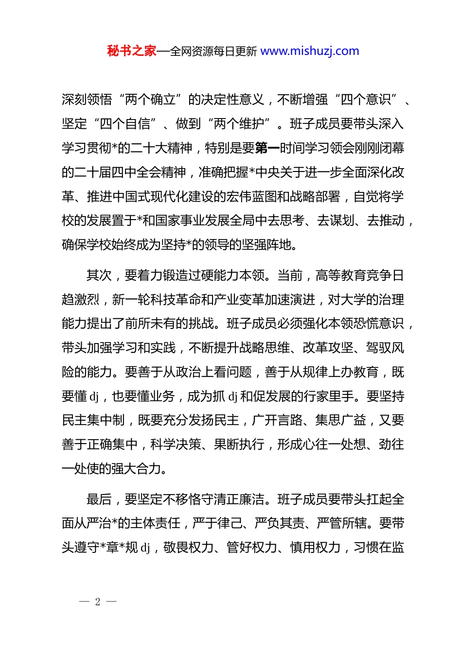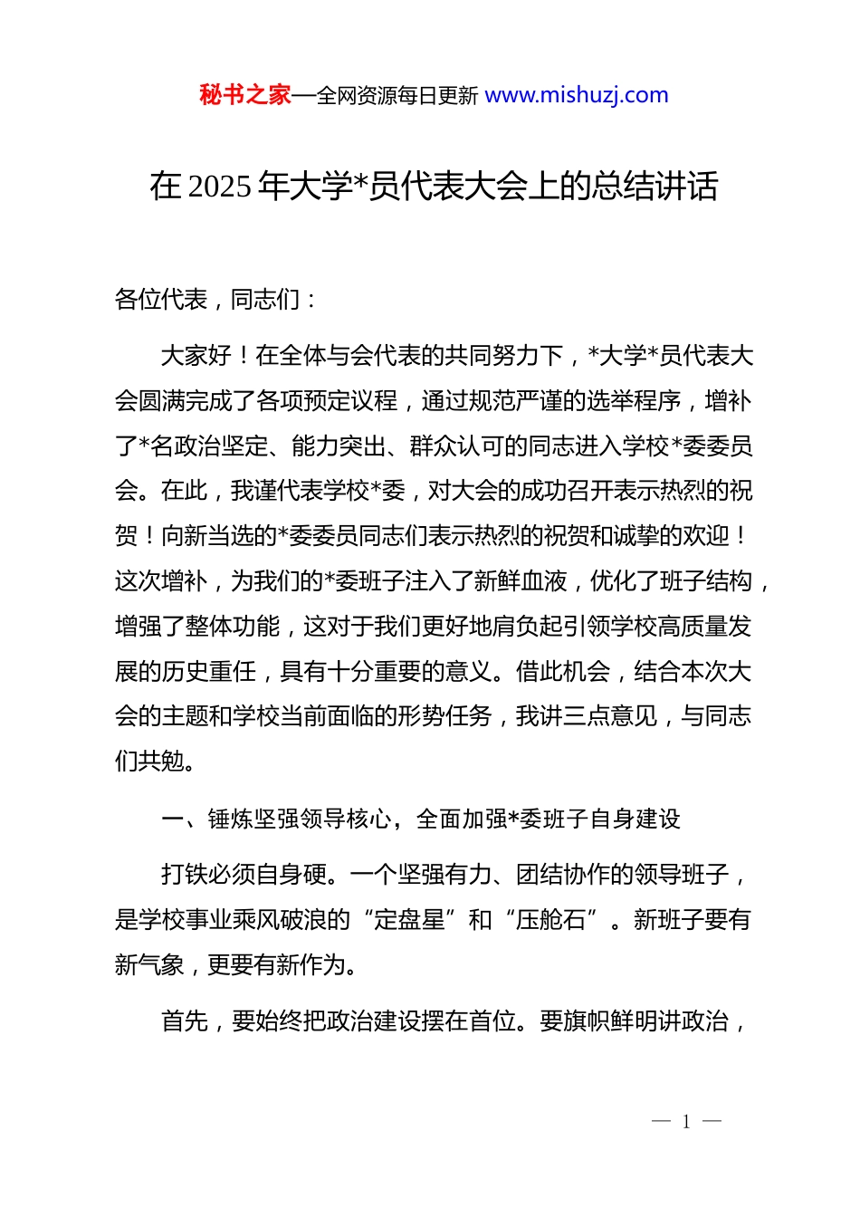 秘书之家—全网资源每日更新 www.mishuzj.com在 2025 年大学*员代表大会上的总结讲话各位代表,同志们:大家好!在全体与会代表的共同努力下,*大学*员代表大会圆满完成了各项预定议程,通过规范严谨的选举程序,增补了*名政治坚定、能力突出、群众认可的同志进入学校*委委员会。在此,我谨代表学校*委,对大会的成功召开表示热烈的祝贺!向新当选的*委委员同志们表示热烈的祝贺和诚挚的欢迎!这次增补,为我们的*委班子注入了新鲜血液,优化了班子结构,增强了整体功能,这对于我们更好地肩负起引领学校高质量发展的历史重任,具有十分重要的意义。借此机会,结合本次大会的主题和学校当前面临的形势任务,我讲三点意见,与同志们共勉。一、锤炼坚强领导核心,全面加强*委班子自身建设打铁必须自身硬。一个坚强有力、团结协作的领导班子,是学校事业乘风破浪的“定盘星”和“压舱石”。新班子要有新气象,更要有新作为。首先,要始终把政治建设摆在首位。要旗帜鲜明讲政治,— 1 —秘书之家—全网资源每日更新 www.mishuzj.com深刻领悟“两个确立”的决定性意义,不断增强“四个意识”、坚定“四个自信”、做到“两个维护”。班子成员要带头深入学习贯彻*的二十大精神,特别是要第一时间学习领会刚刚闭幕的二十届四中全会精神,准确把握*中央关于进一步全面深化改革、推进中国式现代化建设的宏伟蓝图和战略部署,自觉将学校的发展置于*和国家事业发展全局中去思考、去谋划、去推动,确保学校始终成为坚持*的领导的坚强阵地。其次,要着力锻造过硬能力本领。当前,高等教育竞争日趋激烈,新一轮科技革命和产业变革加速演进,对大学的治理能力提出了前所未有的挑战。班子成员必须强化本领恐慌意识,带头加强学习和实践,不断提升战略思维、改革攻坚、驾驭风险的能力。要善于从政治上看问题,善于从规律上办教育,既要懂 dj,也要懂业务,成为抓 dj 和促发展的行家里手。要坚持民主集中制,既要充分发扬民主,广开言路、集思广益,又要善于正确集中,科学决策、果断执行,形成心往一处想、劲往一处使的强大合力。最后,要坚定不移恪守清正廉洁。班子成员要带头扛起全面从严治*的主体责任,严于律己、严负其责、严管所辖。要带头遵守*章*规 dj,敬畏权力、管好权力、慎用权力,习惯在监— 2 —秘书之家—全网资源每日更新 www.mishuzj.com督和约束下工作生活。要大力弘扬求真务实、真抓实干的作风,力戒形式主义、官僚主义,把全部心思和精力用在为师生办实事、为学校谋发展上,以班子的清风正气涵养全校的优良校风、教风和学风。二、夯实坚固战斗堡垒,系统加强学校*的组织建设学校*委的领导力,最终要通过覆盖全校的严密组织体系和坚强战斗堡垒来体现。加强校*委建设,必须在服务学校中心工作、推动事业发展中找到结合点和着力点。一方面,要以高质量 dj 迎接发展大考。回顾过去,在学校*委的坚强领导下,全校上下团结一心,攻坚克难,取得了一系列令人振奋的成绩。特别是在 2024 年度的*省普通高校综合考核中,我们连续第四年荣获“第一等次”的优异成绩,这充分证明了我们 dj 引领发展的路径是正确的、有效的。当前,正值学校“十五五”规划的收官冲刺之年,规划中确立的人才培养质量提升、科研创新能力突破、高水平师资队伍建设等关键指标已进入决胜阶段。我们要以此次高校评估取得的成绩为新起点,全面对标“十五五”规划目标,查缺补漏,精准发力。各级*组织要将规划完成情况作为检验 dj 成效的“试金石”,把*的政治优势、组织优势转化为推动规划目标全面实现的强大发— 3 —秘书之家—全网资源每日更新 www.mishuzj.com展优势。另一方面,要以体系化思维筑牢基层基础。要持续推进基层*组织标准化、规范化建设,巩固拓展“dj 工作示范高校”“标杆院系”“样板支部”的创建成果让每一个支部都成为坚强的战斗堡垒,让每一名*员都成为一面鲜艳的旗帜。要深入实施“青年教师*员发展计划”,不断优化*员队伍结构。要将 dj工作与教学科研、学生管理、社会服务等深度融合,破解“两张皮”问题,推动 dj 工作与中心工作同频共振、同向发力,确保*的路线...