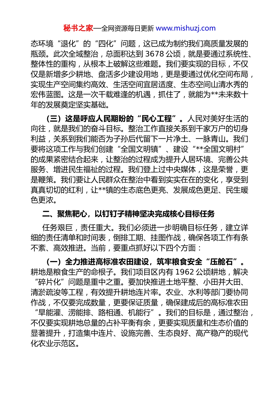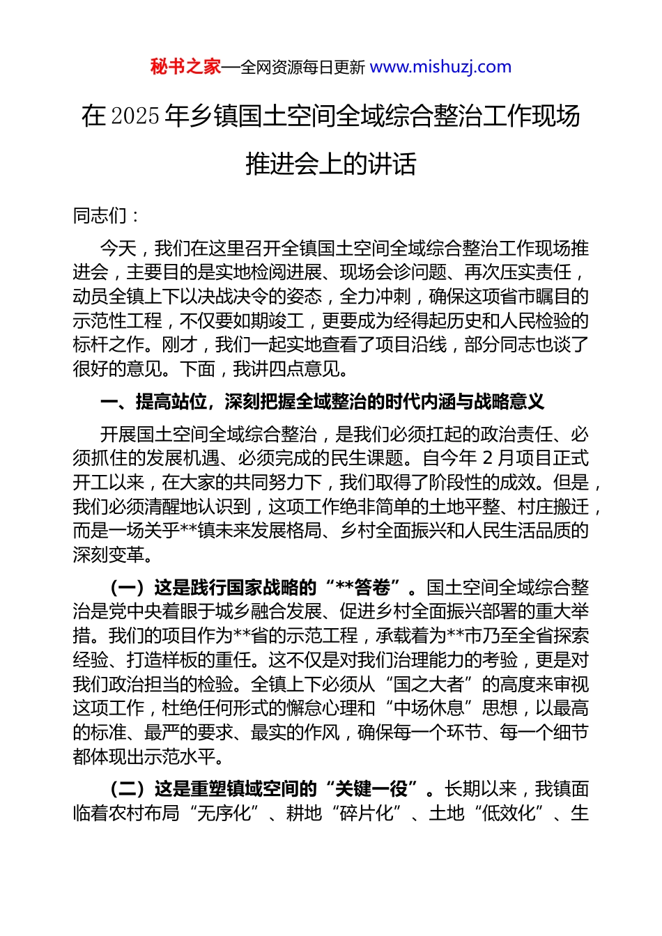 秘书之家—全网资源每日更新 www.mishuzj.com在 2025 年乡镇国土空间全域综合整治工作现场推进会上的讲话同志们:今天,我们在这里召开全镇国土空间全域综合整治工作现场推进会,主要目的是实地检阅进展、现场会诊问题、再次压实责任,动员全镇上下以决战决令的姿态,全力冲刺,确保这项省市瞩目的示范性工程,不仅要如期竣工,更要成为经得起历史和人民检验的标杆之作。刚才,我们一起实地查看了项目沿线,部分同志也谈了很好的意见。下面,我讲四点意见。一、提高站位,深刻把握全域整治的时代内涵与战略意义开展国土空间全域综合整治,是我们必须扛起的政治责任、必须抓住的发展机遇、必须完成的民生课题。自今年 2 月项目正式开工以来,在大家的共同努力下,我们取得了阶段性的成效。但是,我们必须清醒地认识到,这项工作绝非简单的土地平整、村庄搬迁,而是一场关乎**镇未来发展格局、乡村全面振兴和人民生活品质的深刻变革。(一)这是践行国家战略的“**答卷”。国土空间全域综合整治是党中央着眼于城乡融合发展、促进乡村全面振兴部署的重大举措。我们的项目作为**省的示范工程,承载着为**市乃至全省探索经验、打造样板的重任。这不仅是对我们治理能力的考验,更是对我们政治担当的检验。全镇上下必须从“国之大者”的高度来审视这项工作,杜绝任何形式的懈怠心理和“中场休息”思想,以最高的标准、最严的要求、最实的作风,确保每一个环节、每一个细节都体现出示范水平。(二)这是重塑镇域空间的“关键一役”。长期以来,我镇面临着农村布局“无序化”、耕地“碎片化”、土地“低效化”、生秘书之家—全网资源每日更新 www.mishuzj.com态环境“退化”的“四化”问题,这已成为制约我们高质量发展的瓶颈。此次全域整治,总面积达到 3678 公顷,就是要通过系统性、整体性的重构,从根本上破解这些难题。我们要实现的目标,不仅仅是新增多少耕地、盘活多少建设用地,更是要通过优化空间布局,实现生产空间集约高效、生活空间宜居适度、生态空间山清水秀的宏伟蓝图。这是一次千载难逢的机遇,抓住了,就能为**未来数十年的发展奠定坚实基础。(三)这是呼应人民期盼的“民心工程”。人民对美好生活的向往,就是我们的奋斗目标。整治工作直接关系到千家万户的切身利益,关系到我们能否为子孙后代留下一片净土、一脉青山。我们要将这项工作与我们创建“全国文明镇”、建设“**全国文明村”的成果紧密结合起来,让整治的过程成为提升人居环境、完善公共服务、增进民生福祉的过程。我们登上过中央媒体,这是荣誉,更是鞭策。我们要让人民群众在整治中看到实实在在的变化,享受到真真切切的红利,让**镇的生态底色更亮、发展成色更足、民生暖色更浓。二、聚焦靶心,以钉钉子精神坚决完成核心目标任务任务艰巨,责任重大。我们必须进一步明确目标任务,建立详细的责任清单和时间表,倒排工期、挂图作战,确保各项工作有条不紊、高效推进。当前,要重点抓好以下四个方面:(一)全力推进高标准农田建设,筑牢粮食安全“压舱石”。耕地是粮食生产的命根子。我们项目区内有 1962 公顷耕地,解决“碎片化”问题是重中之重。要加快推进土地平整、小田并大田、清淤疏浚等工程,有效提升耕地连片率。农业、水利等部门要协同作战,不仅要完成数量,更要保证质量,确保建成后的高标准农田“旱能灌、涝能排、路相通、机能行”。我们的目标是,通过整治,不仅要实现耕地总量的占补平衡有余,更要实现质量和生态价值的显著提升,打造集中连片、设施完善、生态良好、高产稳产的现代化农业示范区。秘书之家—全网资源每日更新 www.mishuzj.com(二)全力盘活存量建设用地,激活乡村发展“新引擎”。土地的“低效化”是乡村发展的巨大掣肘。要以壮士断腕的决心,依法依规推进闲置宅基地、废弃工矿用地、空心村的整理复垦工作。要将城乡建设用地增减挂钩政策用足用好,通过拆除零散、废旧的居民点,将低效、闲置的农村建设用地,高效复垦为新增的连片优质耕地。同时,要科学规划新的人居点,引导村民适度集中居住,优化村庄布局。这项工作涉及面广、政策性强,相关部门和村社必须做深...