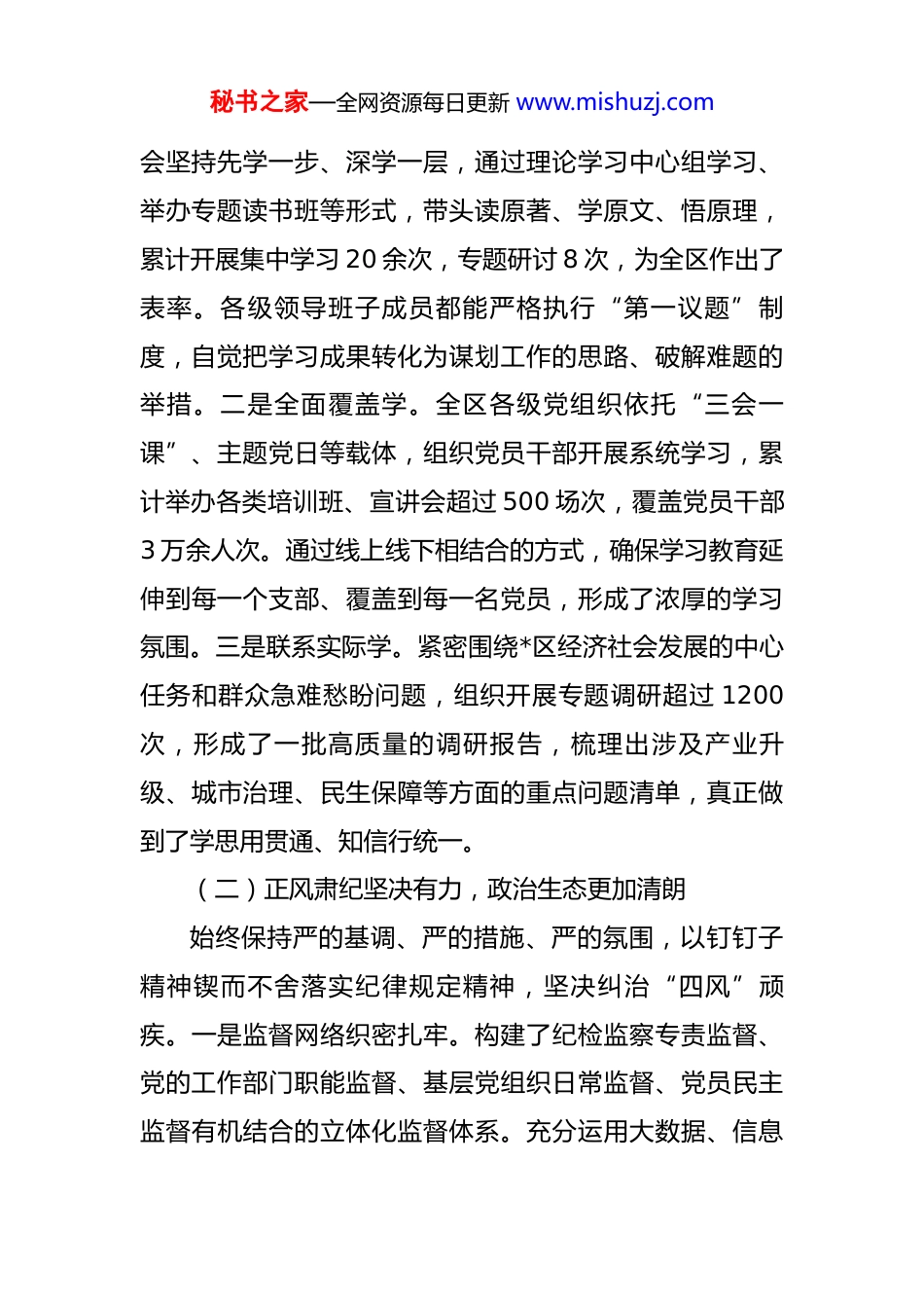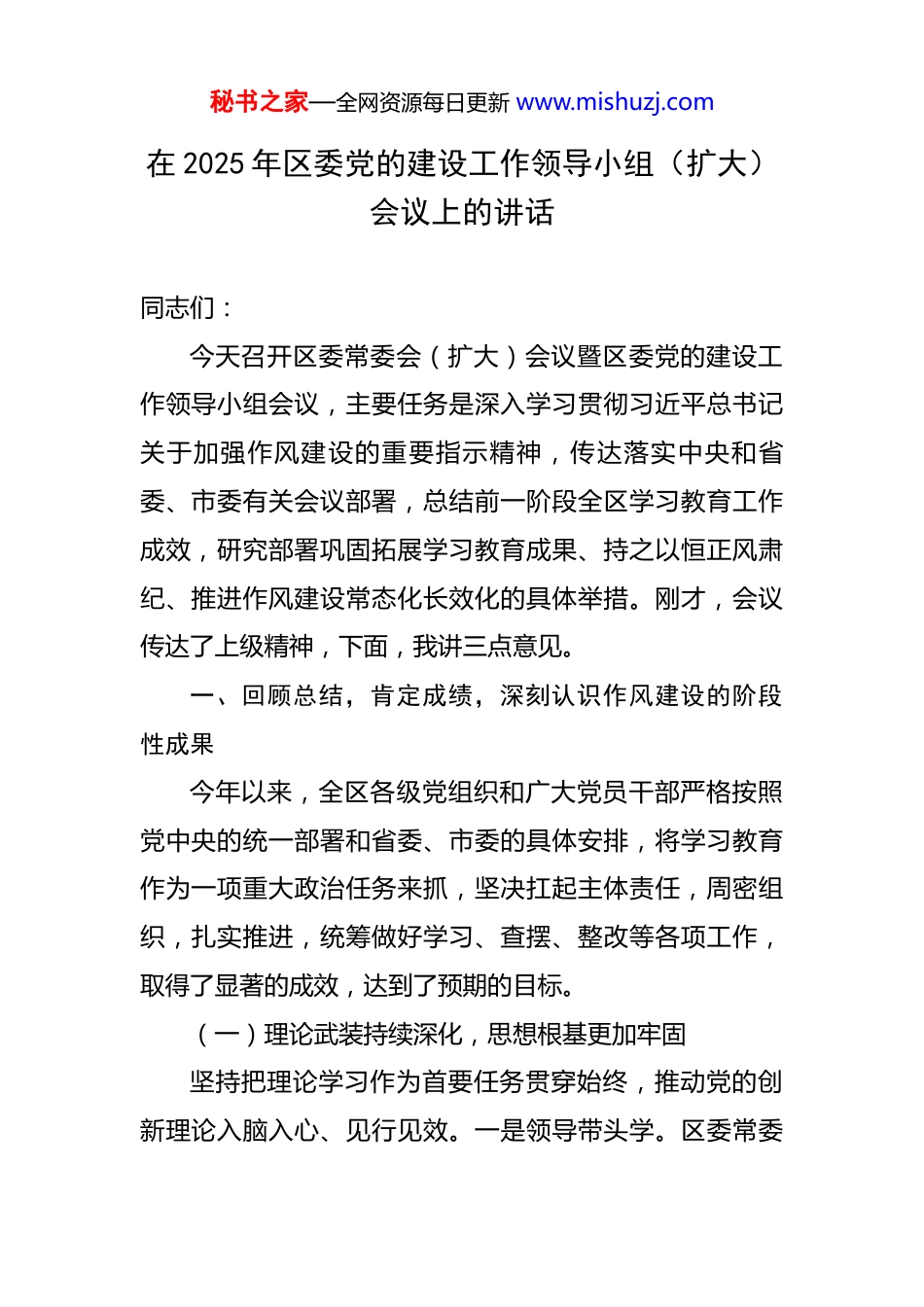 秘书之家—全网资源每日更新 www.mishuzj.com在 2025 年区委党的建设工作领导小组(扩大)会议上的讲话 同志们:今天召开区委常委会(扩大)会议暨区委党的建设工作领导小组会议,主要任务是深入学习贯彻习近平总书记关于加强作风建设的重要指示精神,传达落实中央和省委、市委有关会议部署,总结前一阶段全区学习教育工作成效,研究部署巩固拓展学习教育成果、持之以恒正风肃纪、推进作风建设常态化长效化的具体举措。刚才,会议传达了上级精神,下面,我讲三点意见。一、回顾总结,肯定成绩,深刻认识作风建设的阶段性成果今年以来,全区各级党组织和广大党员干部严格按照党中央的统一部署和省委、市委的具体安排,将学习教育作为一项重大政治任务来抓,坚决扛起主体责任,周密组织,扎实推进,统筹做好学习、查摆、整改等各项工作,取得了显著的成效,达到了预期的目标。(一)理论武装持续深化,思想根基更加牢固坚持把理论学习作为首要任务贯穿始终,推动党的创新理论入脑入心、见行见效。一是领导带头学。区委常委秘书之家—全网资源每日更新 www.mishuzj.com会坚持先学一步、深学一层,通过理论学习中心组学习、举办专题读书班等形式,带头读原著、学原文、悟原理,累计开展集中学习 20 余次,专题研讨 8 次,为全区作出了表率。各级领导班子成员都能严格执行“第一议题”制度,自觉把学习成果转化为谋划工作的思路、破解难题的举措。二是全面覆盖学。全区各级党组织依托“三会一课”、主题党日等载体,组织党员干部开展系统学习,累计举办各类培训班、宣讲会超过 500 场次,覆盖党员干部3 万余人次。通过线上线下相结合的方式,确保学习教育延伸到每一个支部、覆盖到每一名党员,形成了浓厚的学习氛围。三是联系实际学。紧密围绕*区经济社会发展的中心任务和群众急难愁盼问题,组织开展专题调研超过 1200次,形成了一批高质量的调研报告,梳理出涉及产业升级、城市治理、民生保障等方面的重点问题清单,真正做到了学思用贯通、知信行统一。(二)正风肃纪坚决有力,政治生态更加清朗始终保持严的基调、严的措施、严的氛围,以钉钉子精神锲而不舍落实纪律规定精神,坚决纠治“四风”顽疾。一是监督网络织密扎牢。构建了纪检监察专责监督、党的工作部门职能监督、基层党组织日常监督、党员民主监督有机结合的立体化监督体系。充分运用大数据、信息秘书之家—全网资源每日更新 www.mishuzj.com化手段,对公款消费、公车使用、津贴补贴发放等情况进行动态监测,让不正之风无处遁形。二是执纪问责动真碰硬。坚持问题导向,紧盯“四风”问题的新动向、新表现,特别是对隐形变异问题深挖细查、露头就打。学习教育开展以来,全区共查处违反纪律规定精神问题 35 起,处理党员干部 52 人,其中给予党纪政务处分 28 人。通过点名道姓通报曝光典型案例,释放了越往后执纪越严的强烈信号。三是源头治理不断深化。针对监督检查和案件查办中发现的制度漏洞、监管盲区,督促相关单位深入剖析原因,举一反三,建立健全了一批管长远、固根本的制度规定。例如,修订完善了公务接待、会议活动、差旅报销等方面的管理办法,从制度层面扎紧了笼子。(三)担当作为有效激发,发展动能更加强劲坚持把学习教育的成效体现在推动高质量发展的实践中,引导广大党员干部在攻坚克难中展现新担当、实现新作为。一是服务大局的意识更强。全区上下自觉把工作放到全区、全市乃至全省的发展大局中去思考和谋划,围绕“强省会”战略和“三高四新”美好蓝图,聚焦*区“打造现代化新*核心区”的目标定位,一批制约发展的瓶颈问题得到有效破解。今年 1 至 8 月,全区固定资产投资同比增长 9.2%,规模以上工业增加值增长 8.5%,主要经济指标秘书之家—全网资源每日更新 www.mishuzj.com位居全市前列。二是服务群众的效能更高。深入践行以人民为中心的发展思想,扎实开展“我为群众办实事”实践活动,推动解决了教育、医疗、养老、交通等领域一大批群众关心的热点难点问题。今年以来,全区民生支出占一般公共预算支出的比重达到 78.5%,15 项市级重点民生实事项目和 10 项区级民生实事...