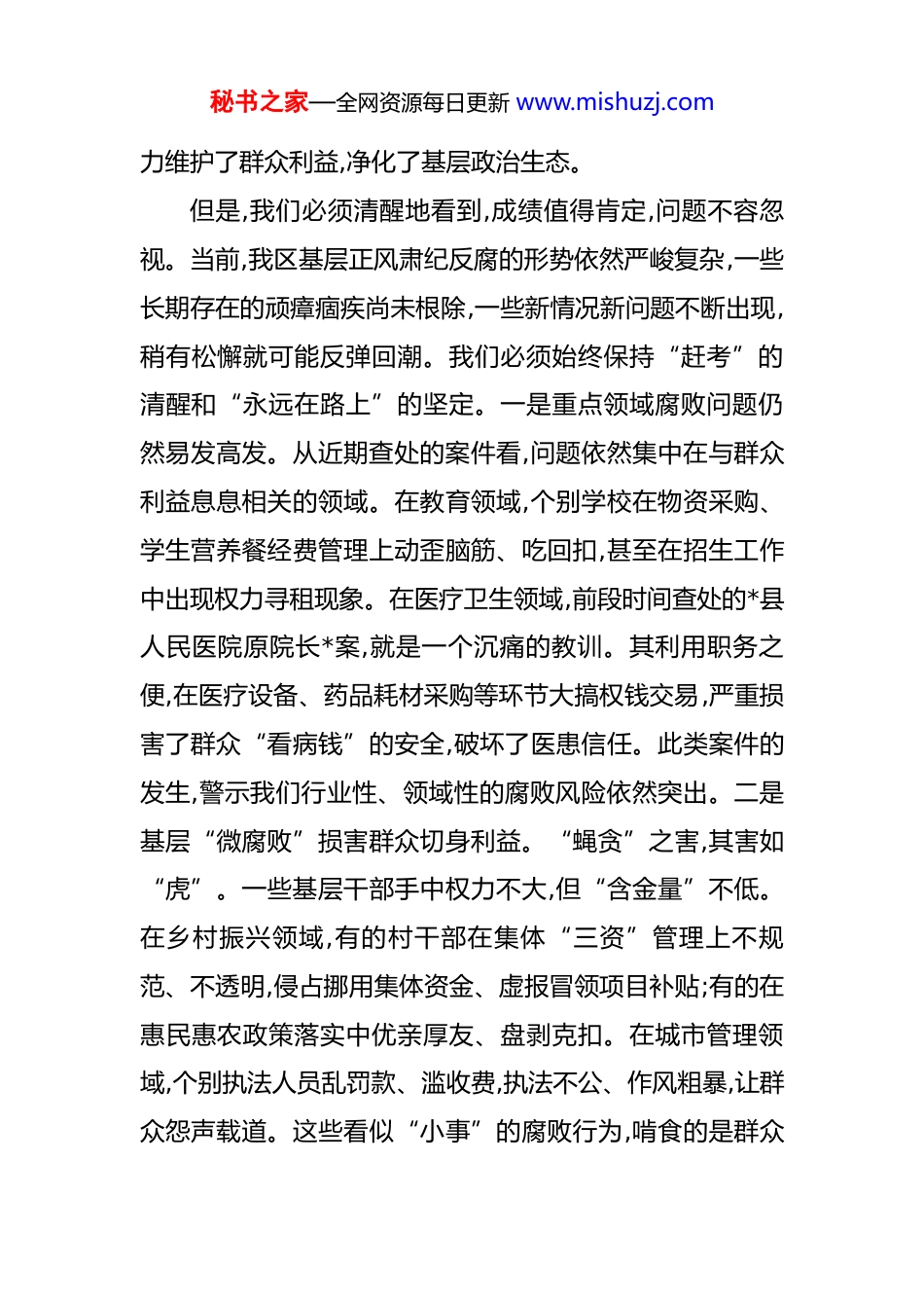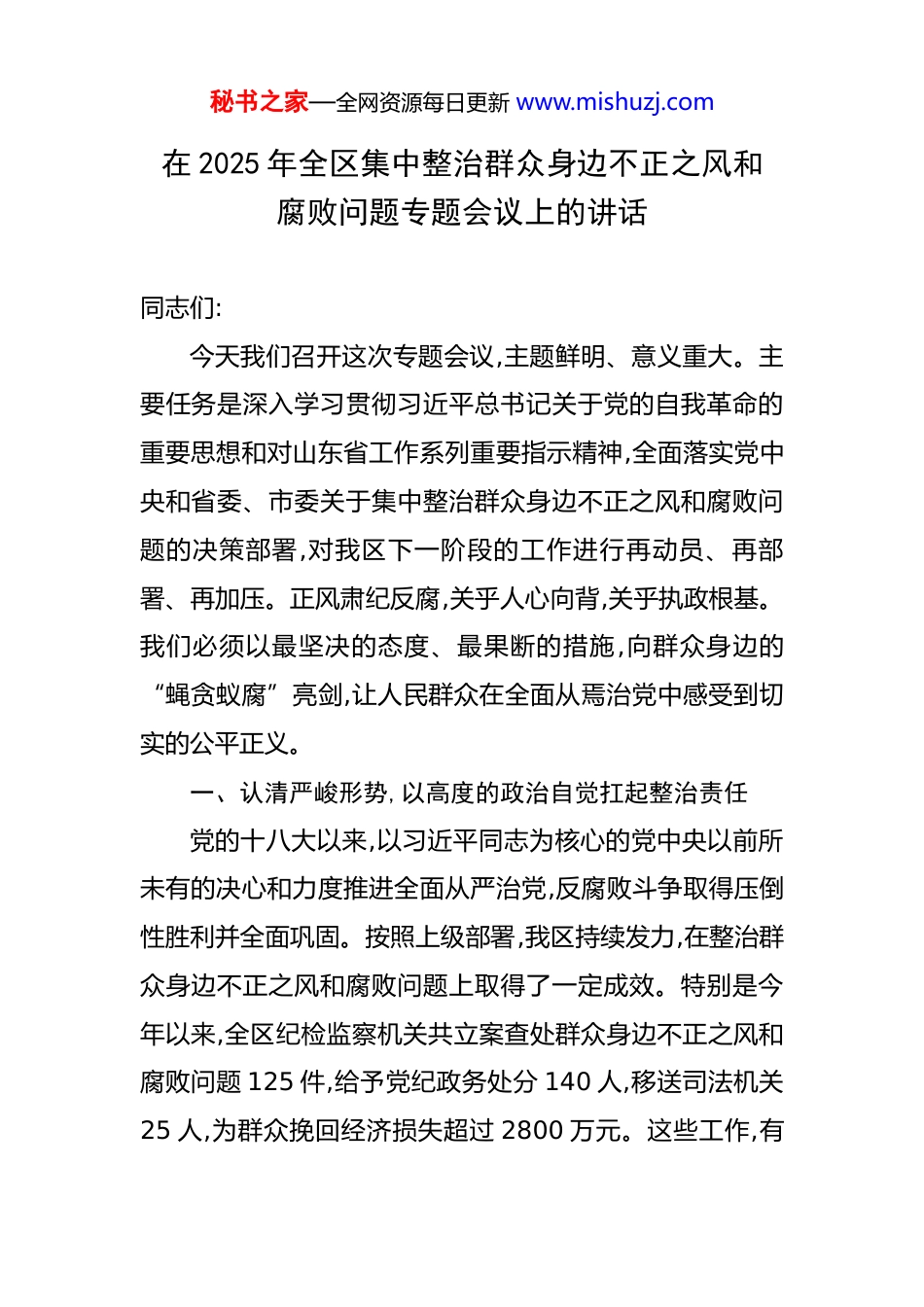 秘书之家—全网资源每日更新 www.mishuzj.com在 2025 年全区集中整治群众身边不正之风和腐败问题专题会议上的讲话 同志们:今天我们召开这次专题会议,主题鲜明、意义重大。主要任务是深入学习贯彻习近平总书记关于党的自我革命的重要思想和对山东省工作系列重要指示精神,全面落实党中央和省委、市委关于集中整治群众身边不正之风和腐败问题的决策部署,对我区下一阶段的工作进行再动员、再部署、再加压。正风肃纪反腐,关乎人心向背,关乎执政根基。我们必须以最坚决的态度、最果断的措施,向群众身边的“蝇贪蚁腐”亮剑,让人民群众在全面从焉治党中感受到切实的公平正义。一、认清严峻形势,以高度的政治自觉扛起整治责任党的十八大以来,以习近平同志为核心的党中央以前所未有的决心和力度推进全面从严治党,反腐败斗争取得压倒性胜利并全面巩固。按照上级部署,我区持续发力,在整治群众身边不正之风和腐败问题上取得了一定成效。特别是今年以来,全区纪检监察机关共立案查处群众身边不正之风和腐败问题 125 件,给予党纪政务处分 140 人,移送司法机关25 人,为群众挽回经济损失超过 2800 万元。这些工作,有秘书之家—全网资源每日更新 www.mishuzj.com力维护了群众利益,净化了基层政治生态。但是,我们必须清醒地看到,成绩值得肯定,问题不容忽视。当前,我区基层正风肃纪反腐的形势依然严峻复杂,一些长期存在的顽瘴痼疾尚未根除,一些新情况新问题不断出现,稍有松懈就可能反弹回潮。我们必须始终保持“赶考”的清醒和“永远在路上”的坚定。一是重点领域腐败问题仍然易发高发。从近期查处的案件看,问题依然集中在与群众利益息息相关的领域。在教育领域,个别学校在物资采购、学生营养餐经费管理上动歪脑筋、吃回扣,甚至在招生工作中出现权力寻租现象。在医疗卫生领域,前段时间查处的*县人民医院原院长*案,就是一个沉痛的教训。其利用职务之便,在医疗设备、药品耗材采购等环节大搞权钱交易,严重损害了群众“看病钱”的安全,破坏了医患信任。此类案件的发生,警示我们行业性、领域性的腐败风险依然突出。二是基层“微腐败”损害群众切身利益。“蝇贪”之害,其害如“虎”。一些基层干部手中权力不大,但“含金量”不低。在乡村振兴领域,有的村干部在集体“三资”管理上不规范、不透明,侵占挪用集体资金、虚报冒领项目补贴;有的在惠民惠农政策落实中优亲厚友、盘剥克扣。在城市管理领域,个别执法人员乱罚款、滥收费,执法不公、作风粗暴,让群众怨声载道。这些看似“小事”的腐败行为,啃食的是群众秘书之家—全网资源每日更新 www.mishuzj.com的获得感,侵蚀的是党的执政根基,必须下大力气整治。三是工作作风顽疾成为“绊脚石”。形式主义、官僚主义是腐败滋生的温床。有的部门服务群众意识淡漠,“门好进、脸好看、事难办”的现象依然存在;有的干部在处理群众急难愁盼问题时,推诿扯皮、敷衍塞责,习惯于“打太极”“踢皮球”;有的在落实政策时搞变通、打折扣,导致惠民政策“最后一公里”变成了“中梗阻”。这些作风问题,不仅影响了党和政府的形象,更疏远了党群干群关系。四是腐败手段隐形变异、花样翻新。随着正风肃纪反腐力度持续加大,一些腐败行为也穿上了“隐身衣”、玩起了“障眼法”。有的通过电子红包、快递礼品等方式收受贿赂;有的通过“影子公司”、虚假交易等方式输送利益;有的将腐败行为包装成“市场行为”“人情往来”,发现和查处的难度更大。这要求我们的斗争策略和方法必须与时俱进,不断提升精准发现、精准打击的能力。同志们,这些问题,每一个都直接关系到群众的切身利益,关系到我们党的形象和威信。我们必须正视问题、直面挑战,以“刮骨疗毒”的勇气和“壮士断腕”的决心,把集中整治工作一抓到底、抓出实效。二、聚焦关键环节,以精准有力的举措深化整治攻坚整治群众身边不正之风和腐败问题,是一场必须打赢的攻坚战。全区各级各部门要坚决贯彻“党委政府主责、纪秘书之家—全网资源每日更新 www.mishuzj.com委牵头抓总、部门协同推动、市县主抓主战”的联动体系要求,紧盯重点任务,以“四个再深化”推动整治工作走深走实。第一,在问题整改整治上再深化,务求“清仓见底”。整治不...