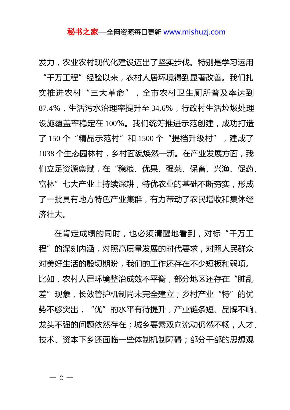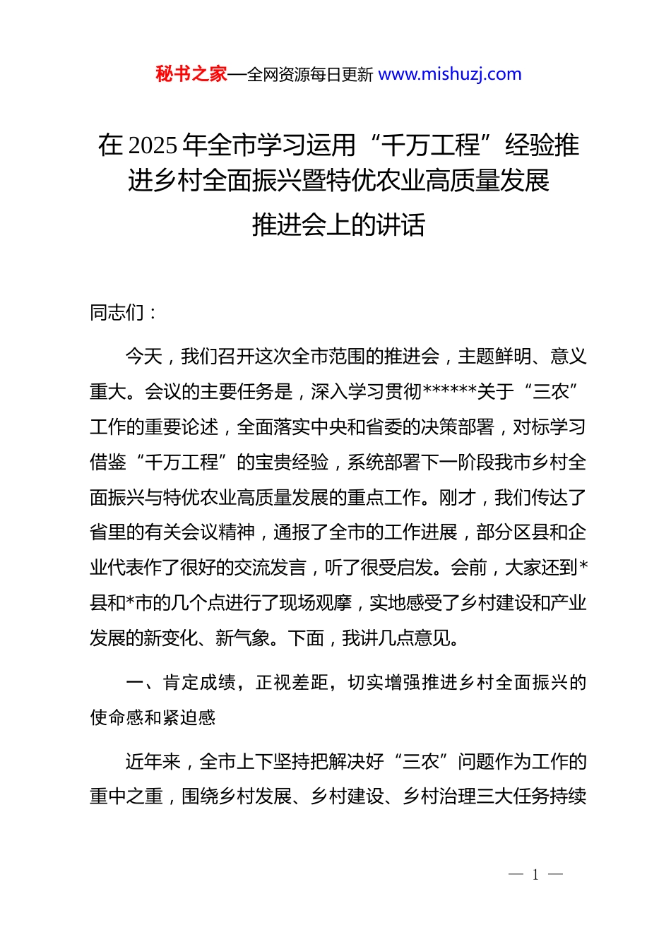 秘书之家—全网资源每日更新 www.mishuzj.com在 2025 年全市学习运用“千万工程”经验推进乡村全面振兴暨特优农业高质量发展推进会上的讲话同志们:今天,我们召开这次全市范围的推进会,主题鲜明、意义重大。会议的主要任务是,深入学习贯彻******关于“三农”工作的重要论述,全面落实中央和省委的决策部署,对标学习借鉴“千万工程”的宝贵经验,系统部署下一阶段我市乡村全面振兴与特优农业高质量发展的重点工作。刚才,我们传达了省里的有关会议精神,通报了全市的工作进展,部分区县和企业代表作了很好的交流发言,听了很受启发。会前,大家还到*县和*市的几个点进行了现场观摩,实地感受了乡村建设和产业发展的新变化、新气象。下面,我讲几点意见。一、肯定成绩,正视差距,切实增强推进乡村全面振兴的使命感和紧迫感近年来,全市上下坚持把解决好“三农”问题作为工作的重中之重,围绕乡村发展、乡村建设、乡村治理三大任务持续— 1 —秘书之家—全网资源每日更新 www.mishuzj.com发力,农业农村现代化建设迈出了坚实步伐。特别是学习运用“千万工程”经验以来,农村人居环境得到显著改善。我们扎实推进农村“三大革命”,全市农村卫生厕所普及率达到87.4%,生活污水治理率提升至 34.6%,行政村生活垃圾处理设施覆盖率稳定在 100%。我们统筹推进示范创建,成功打造了 150 个“精品示范村”和 1500 个“提档升级村”,建成了1038 个生态园林村,乡村面貌焕然一新。在产业发展方面,我们立足资源禀赋,在“稳粮、优果、强菜、保畜、兴渔、促药、富林”七大产业上持续深耕,特优农业的基础不断夯实,形成了一批具有地方特色产业集群,有力带动了农民增收和集体经济壮大。在肯定成绩的同时,也必须清醒地看到,对标“千万工程”的深刻内涵,对照高质量发展的时代要求,对照人民群众对美好生活的殷切期盼,我们的工作还存在不少短板和弱项。比如,农村人居环境整治成效不平衡,部分地区还存在“脏乱差”现象,长效管护机制尚未完全建立;乡村产业“特”的优势不够突出,“优”的水平有待提升,产业链条短、品牌不响、龙头不强的问题依然存在;城乡要素双向流动仍然不畅,人才、技术、资本下乡还面临一些体制机制障碍;部分干部的思想观— 2 —秘书之家—全网资源每日更新 www.mishuzj.com念、工作方法还不能完全适应新时代新征程对“三农”工作的新要求。这些问题,是前进中的问题,也是我们下一步必须下大力气解决的重点和难点。我们必须保持战略清醒,以“时时放心不下”的责任感,攻坚克难,奋起直追。二、深化认识,把握精髓,以“千万工程”经验引领和美乡村建设新实践“千万工程”是******在*工作期间亲自谋划、亲自部署、亲自推动的重大决策,从农村环境整治入手,由点及面、迭代升级,造就了万千美丽乡村,造福了万千农民群众,是推进乡村全面振兴的科学指引和生动范本。学习运用“千万工程”经验,绝不能简单地理解为搞搞卫生、种种花草,更不能满足于一时的“盆景”之美,而要深刻领会其蕴含的战略思维、科学方法和为民情怀。首先,要深刻领会其“人民至上”的核心立场。“千万工程”的出发点和落脚点,始终是为了满足农民群众对美好生活的向往。推进乡村建设,必须坚持农民的主体地位,问需于民、问计于民,充分调动农民群众的积极性、主动性和创造性,把民生痛点、治理难点转化为乡村建设的着力点和亮点。要让广大农民不仅成为乡村建设的受益者,更要成为参与者和维护者,— 3 —秘书之家—全网资源每日更新 www.mishuzj.com真正实现乡村共建共治共享。其次,要深刻领会其“系统观念”的科学方法。“千万工程”的成功之处在于它不是孤立地抓某一项工作,而是将农村环境整治、基础设施建设、产业发展、公共服务、乡风文明、基层治理等作为一个有机整体来统筹推进。它深刻揭示了“绿水青山”与“金山银山”的辩证统一关系。优美的生态环境是发展乡村产业、吸引人才资本的基础,而兴旺的产业则是维持和提升乡村环境、改善民生的经济保障。我们必须摒弃“头痛医头、脚痛医脚”的零敲碎打,坚持规划先行,一张蓝图绘到底,实现乡村形态、业态、生态...