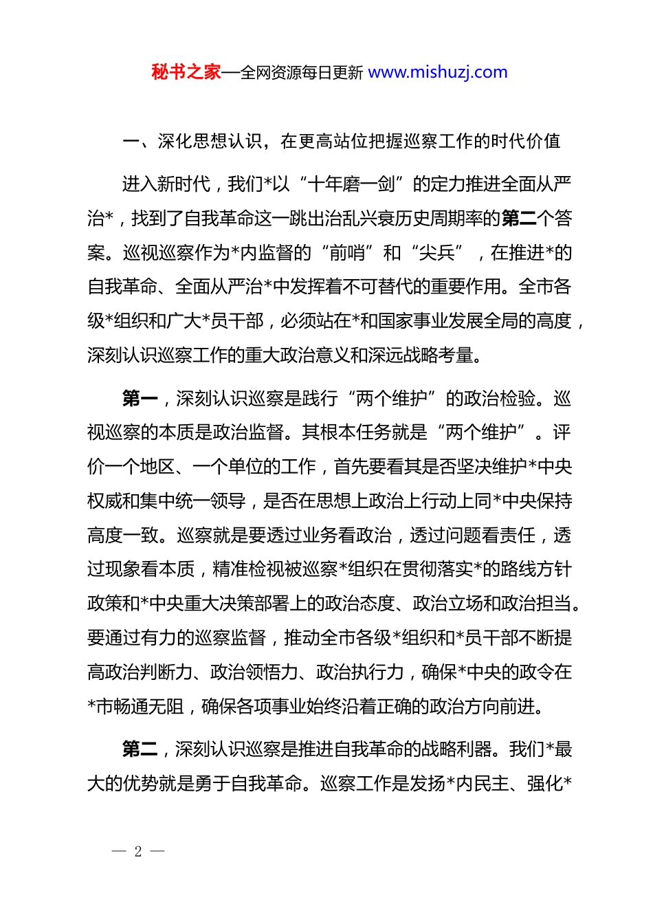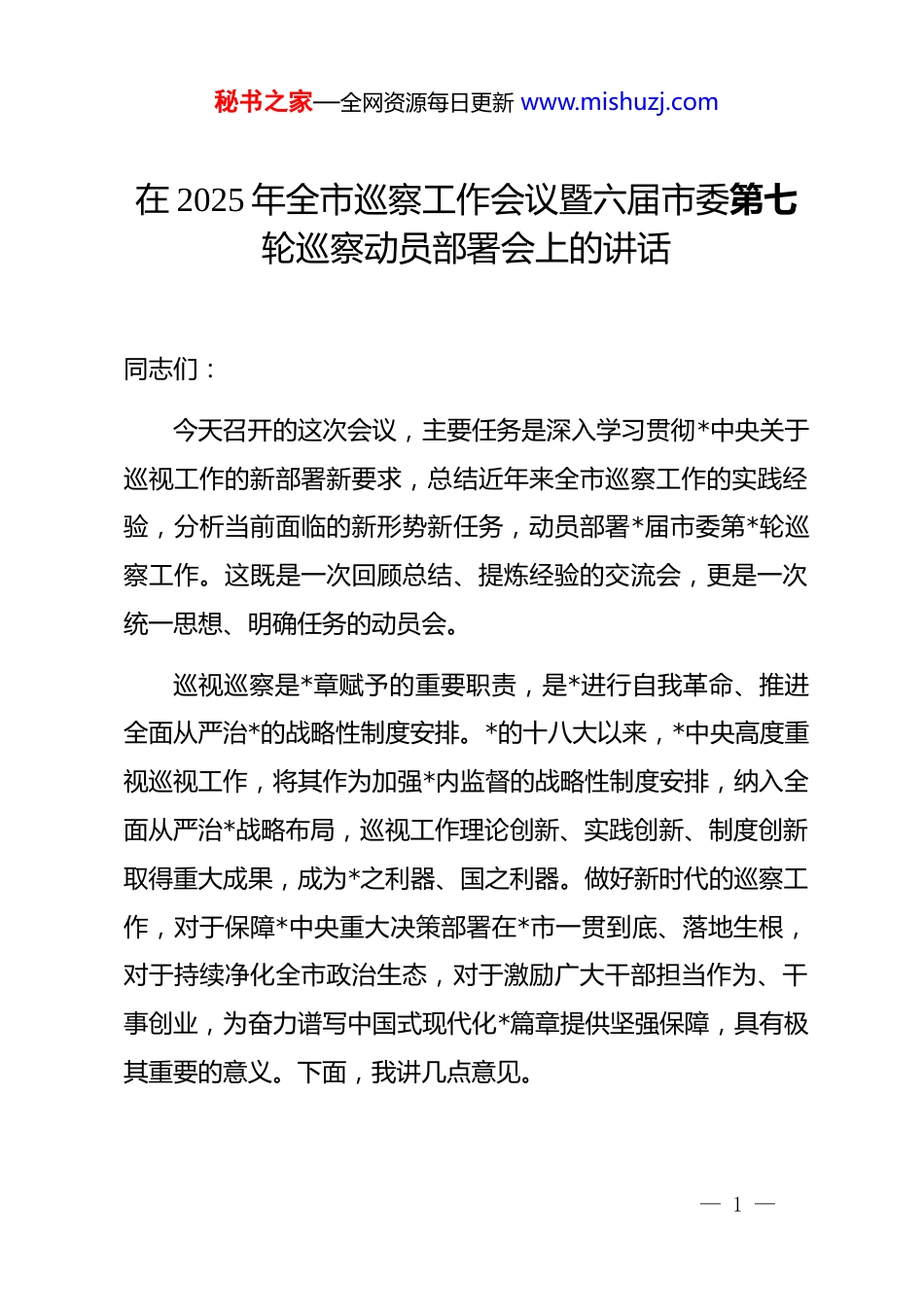 秘书之家—全网资源每日更新 www.mishuzj.com在 2025 年全市巡察工作会议暨六届市委第七轮巡察动员部署会上的讲话同志们:今天召开的这次会议,主要任务是深入学习贯彻*中央关于巡视工作的新部署新要求,总结近年来全市巡察工作的实践经验,分析当前面临的新形势新任务,动员部署*届市委第*轮巡察工作。这既是一次回顾总结、提炼经验的交流会,更是一次统一思想、明确任务的动员会。巡视巡察是*章赋予的重要职责,是*进行自我革命、推进全面从严治*的战略性制度安排。*的十八大以来,*中央高度重视巡视工作,将其作为加强*内监督的战略性制度安排,纳入全面从严治*战略布局,巡视工作理论创新、实践创新、制度创新取得重大成果,成为*之利器、国之利器。做好新时代的巡察工作,对于保障*中央重大决策部署在*市一贯到底、落地生根,对于持续净化全市政治生态,对于激励广大干部担当作为、干事创业,为奋力谱写中国式现代化*篇章提供坚强保障,具有极其重要的意义。下面,我讲几点意见。— 1 —秘书之家—全网资源每日更新 www.mishuzj.com一、深化思想认识,在更高站位把握巡察工作的时代价值进入新时代,我们*以“十年磨一剑”的定力推进全面从严治*,找到了自我革命这一跳出治乱兴衰历史周期率的第二个答案。巡视巡察作为*内监督的“前哨”和“尖兵”,在推进*的自我革命、全面从严治*中发挥着不可替代的重要作用。全市各级*组织和广大*员干部,必须站在*和国家事业发展全局的高度,深刻认识巡察工作的重大政治意义和深远战略考量。第一,深刻认识巡察是践行“两个维护”的政治检验。巡视巡察的本质是政治监督。其根本任务就是“两个维护”。评价一个地区、一个单位的工作,首先要看其是否坚决维护*中央权威和集中统一领导,是否在思想上政治上行动上同*中央保持高度一致。巡察就是要透过业务看政治,透过问题看责任,透过现象看本质,精准检视被巡察*组织在贯彻落实*的路线方针政策和*中央重大决策部署上的政治态度、政治立场和政治担当。要通过有力的巡察监督,推动全市各级*组织和*员干部不断提高政治判断力、政治领悟力、政治执行力,确保*中央的政令在*市畅通无阻,确保各项事业始终沿着正确的政治方向前进。第二,深刻认识巡察是推进自我革命的战略利器。我们*最大的优势就是勇于自我革命。巡察工作是发扬*内民主、强化*— 2 —秘书之家—全网资源每日更新 www.mishuzj.com内监督的有效形式,是依靠*自身力量发现问题、解决问题的关键一环。实践证明,巡察是发现问题的“显微镜”和“探照灯”,能够有效发现和推动解决管*治*中存在的深层次、根源性问题。当前,我市正处在推进强市行动、加快建设新时代美丽*的关键时期,改革发展稳定的任务十分繁重,面临的风险挑战也前所未有。越是这个时候,越要保持自我革命的清醒和坚定,用好巡察这把利剑,敢于刀刃向内,敢于刮骨疗毒,及时清除侵蚀*的健康肌体的病毒,确保我们的*始终保持先进性和纯洁性,始终成为领导*市各项事业发展的坚强核心。第三,深刻认识巡察是密切联系群众的桥梁纽带。人心向背是最大的政治。巡察工作直接面对基层、贴近群众,是了解社情民意、倾听群众呼声的重要渠道。人民群众最痛恨腐败现象,最反感不正之风。巡察工作要坚决贯彻群众路线,把监督的镜头对准群众反映强烈、深恶痛绝的突出问题,聚焦教育医疗、养老社保、生态环保、安全生产等民生领域,着力发现和推动解决群众身边的腐败问题和不正之风。通过实实在在的巡察成效,让群众感受到正风肃纪反腐就在身边、公平正义就在眼前,不断增强群众的获得感、幸福感、安全感,持续夯实*在*市的执政根基。— 3 —秘书之家—全网资源每日更新 www.mishuzj.com二、聚焦监督重点,在更实举措中提升巡察工作的质量效能巡察工作高质量发展,关键在于精准。必须坚持问题导向突出监督重点,创新方式方法,在精准发现问题、客观分析问题、推动解决问题上持续下功夫,不断增强巡察的震慑力、穿透力和推动力。一是要在推进政治监督具体化上求突破。政治监督不是空泛的口号,必须具体地、现实地落实在巡察工作的全过程和各方面。要紧扣推进中国式现代化这...