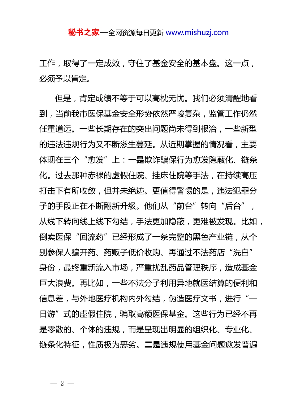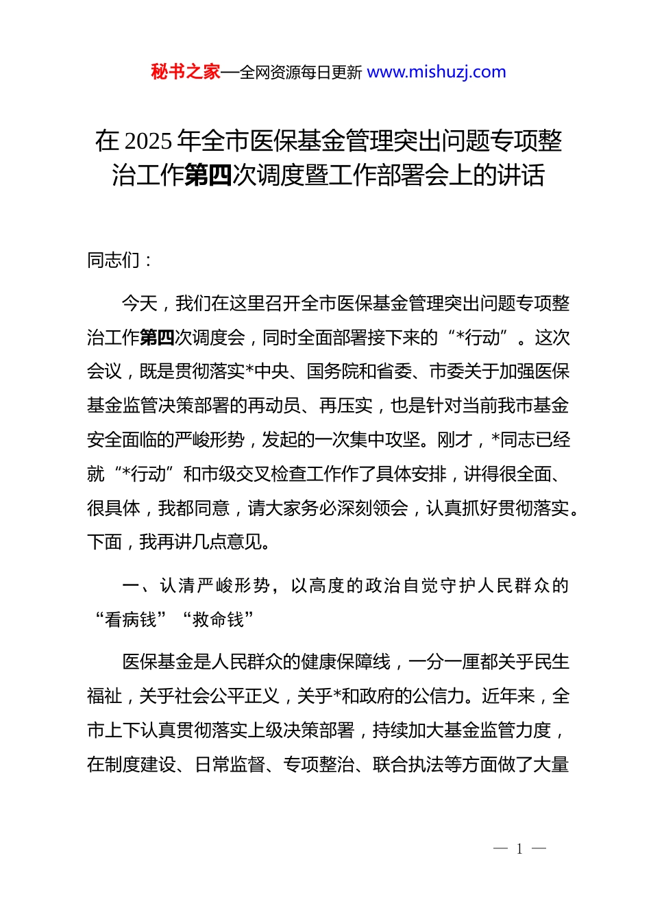 秘书之家—全网资源每日更新 www.mishuzj.com在 2025 年全市医保基金管理突出问题专项整治工作第四次调度暨工作部署会上的讲话同志们:今天,我们在这里召开全市医保基金管理突出问题专项整治工作第四次调度会,同时全面部署接下来的“*行动”。这次会议,既是贯彻落实*中央、国务院和省委、市委关于加强医保基金监管决策部署的再动员、再压实,也是针对当前我市基金安全面临的严峻形势,发起的一次集中攻坚。刚才,*同志已经就“*行动”和市级交叉检查工作作了具体安排,讲得很全面、很具体,我都同意,请大家务必深刻领会,认真抓好贯彻落实。下面,我再讲几点意见。一、认清严峻形势,以高度的政治自觉守护人民群众的“看病钱”“救命钱”医保基金是人民群众的健康保障线,一分一厘都关乎民生福祉,关乎社会公平正义,关乎*和政府的公信力。近年来,全市上下认真贯彻落实上级决策部署,持续加大基金监管力度,在制度建设、日常监督、专项整治、联合执法等方面做了大量— 1 —秘书之家—全网资源每日更新 www.mishuzj.com工作,取得了一定成效,守住了基金安全的基本盘。这一点,必须予以肯定。但是,肯定成绩不等于可以高枕无忧。我们必须清醒地看到,当前我市医保基金安全形势依然严峻复杂,监管工作仍然任重道远。一些长期存在的突出问题尚未得到根治,一些新型的违法违规行为又不断滋生蔓延。从近期掌握的情况看,主要体现在三个“愈发”上:一是欺诈骗保行为愈发隐蔽化、链条化。过去那种赤裸的虚假住院、挂床住院等手法,在持续高压打击下有所收敛,但并未绝迹。更值得警惕的是,违法犯罪分子的手段正在不断翻新升级。他们从“前台”转向“后台”,从线下转向线上线下勾结,手法更加隐蔽,更难被发现。比如,倒卖医保“回流药”已经形成了一条完整的黑色产业链,从个别参保人骗开药、药贩子低价收购、再通过不法药店“洗白”身份,最终重新流入市场,严重扰乱药品管理秩序,造成基金巨大浪费。再比如,一些不法分子利用异地就医结算的便利和信息差,与外地医疗机构内外勾结,伪造医疗文书,进行“一日游”式的虚假住院,骗取高额医保基金。这些行为已经不再是零散的、个体的违规,而是呈现出明显的组织化、专业化、链条化特征,性质极为恶劣。二是违规使用基金问题愈发普遍— 2 —秘书之家—全网资源每日更新 www.mishuzj.com化、常态化。在一些定点医药机构,违规似乎成了一种“潜规则”。有的医疗机构,在 dip 支付方式改革的背景下,不去钻研如何优化临床路径、提升服务效能,反而动起了“歪脑筋”,通过“高套分组”“分解住院”等方式,把小病当大病治,把简单病种套入复杂病组,以此套取更多的医保基金。有的定点药店,对处方审核形同虚设,无处方售药、超量开药现象屡见不鲜,甚至主动诱导参保人刷医保卡购买保健品、生活用品,把医保基金当成了“唐僧肉”。根据今年上半年市级抽查和大数据筛查情况,初步发现各类违规疑点线索超过 3000 条,同比增长约 15%,尤其在异地就医结算、特殊门诊购药等环节,违规行为组织化趋势明显,预估可能造成的基金损失数千万元。这些看似“金额不大”的违规行为,积少成多、聚沙成塔,正在不断侵蚀着基金的安全根基。三是基金监管的责任和能力愈发不适应新挑战。一方面,部分县市区和相关部门的重视程度仍然不够,责任压力传导存在“中梗阻”,存在“上热下冷”现象。有的地方满足于开了会、发了文,但在具体落实上办法不多、力度不够。个别监管人员存在“老好人”思想,执法失之于宽、失之于软。另一方面,我们的监管能力与违法手段的快速迭代相比,还存在明显差距。传统的现场检查模式,面对海量数据和隐形变异的违规行为,显得力不从心。大数据、人— 3 —秘书之家—全网资源每日更新 www.mishuzj.com工智能等现代信息技术的应用还不够深入,监管的精准性、预见性有待进一步提升。医保、卫健、公安、市场监管等部门之间的协同联动机制虽然已经建立,但在信息共享、线索移交、联合办案等方面的深度融合还需加强,尚未完全形成“一盘棋”的监管合力。同志们,以上这些问题,每一个都触目惊心,每一个都直接损害人...
