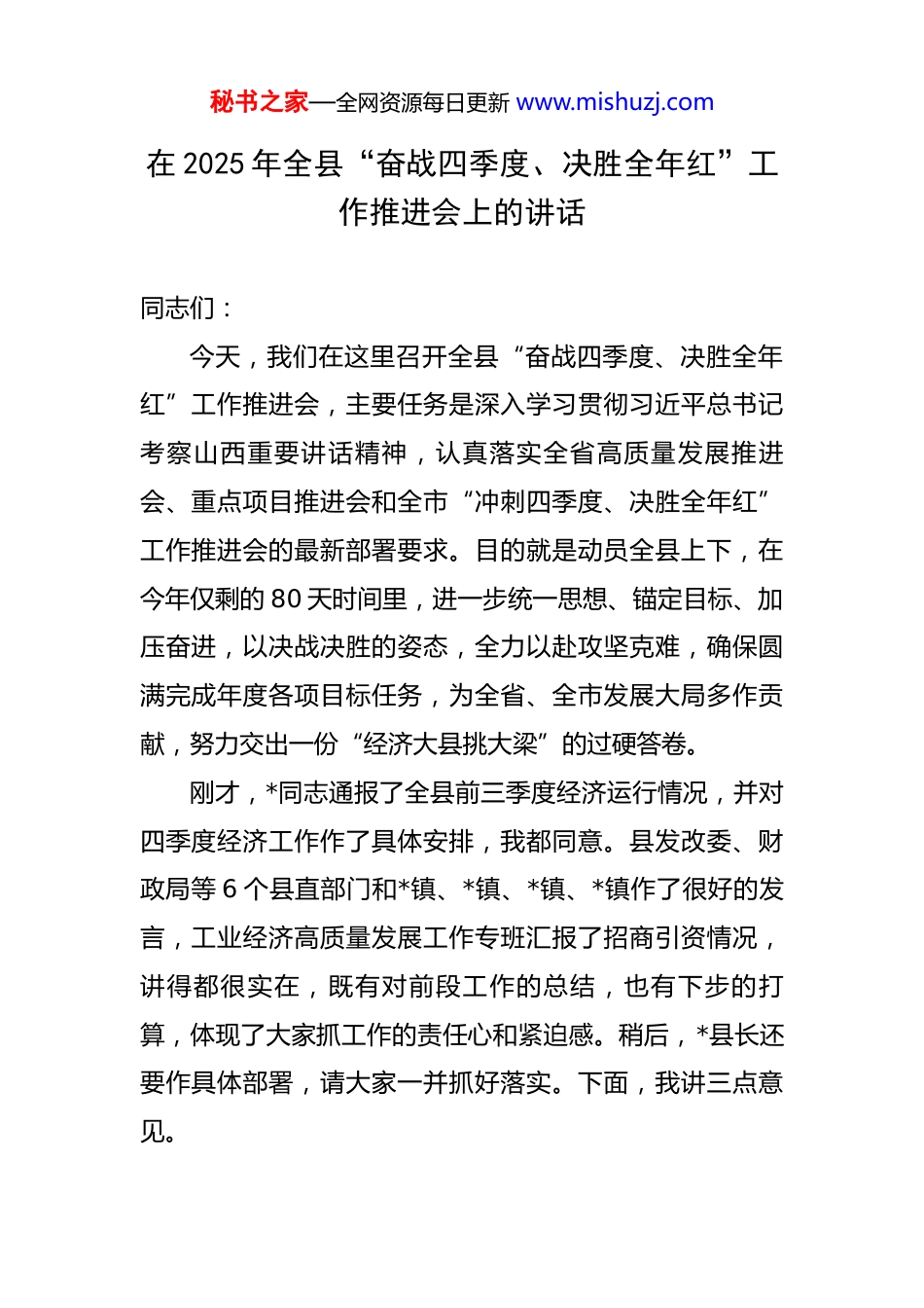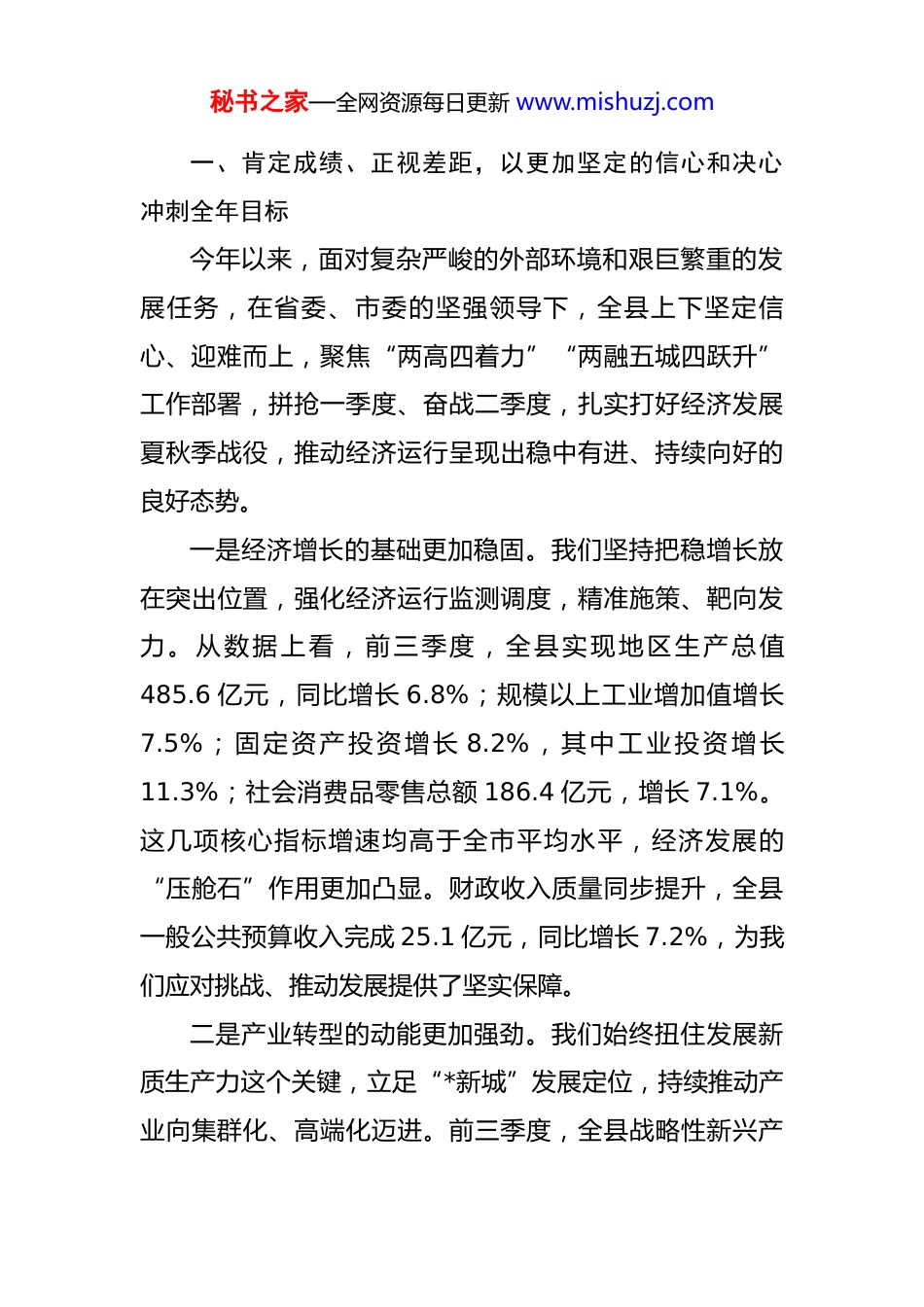 秘书之家—全网资源每日更新 www.mishuzj.com在 2025 年全县“奋战四季度、决胜全年红”工作推进会上的讲话 同志们:今天,我们在这里召开全县“奋战四季度、决胜全年红”工作推进会,主要任务是深入学习贯彻习近平总书记考察山西重要讲话精神,认真落实全省高质量发展推进会、重点项目推进会和全市“冲刺四季度、决胜全年红”工作推进会的最新部署要求。目的就是动员全县上下,在今年仅剩的 80 天时间里,进一步统一思想、锚定目标、加压奋进,以决战决胜的姿态,全力以赴攻坚克难,确保圆满完成年度各项目标任务,为全省、全市发展大局多作贡献,努力交出一份“经济大县挑大梁”的过硬答卷。刚才,*同志通报了全县前三季度经济运行情况,并对四季度经济工作作了具体安排,我都同意。县发改委、财政局等 6 个县直部门和*镇、*镇、*镇、*镇作了很好的发言,工业经济高质量发展工作专班汇报了招商引资情况,讲得都很实在,既有对前段工作的总结,也有下步的打算,体现了大家抓工作的责任心和紧迫感。稍后,*县长还要作具体部署,请大家一并抓好落实。下面,我讲三点意见。秘书之家—全网资源每日更新 www.mishuzj.com一、肯定成绩、正视差距,以更加坚定的信心和决心冲刺全年目标今年以来,面对复杂严峻的外部环境和艰巨繁重的发展任务,在省委、市委的坚强领导下,全县上下坚定信心、迎难而上,聚焦“两高四着力”“两融五城四跃升”工作部署,拼抢一季度、奋战二季度,扎实打好经济发展夏秋季战役,推动经济运行呈现出稳中有进、持续向好的良好态势。一是经济增长的基础更加稳固。我们坚持把稳增长放在突出位置,强化经济运行监测调度,精准施策、靶向发力。从数据上看,前三季度,全县实现地区生产总值485.6 亿元,同比增长 6.8%;规模以上工业增加值增长7.5%;固定资产投资增长 8.2%,其中工业投资增长11.3%;社会消费品零售总额 186.4 亿元,增长 7.1%。这几项核心指标增速均高于全市平均水平,经济发展的“压舱石”作用更加凸显。财政收入质量同步提升,全县一般公共预算收入完成 25.1 亿元,同比增长 7.2%,为我们应对挑战、推动发展提供了坚实保障。二是产业转型的动能更加强劲。我们始终扭住发展新质生产力这个关键,立足“*新城”发展定位,持续推动产业向集群化、高端化迈进。前三季度,全县战略性新兴产秘书之家—全网资源每日更新 www.mishuzj.com业产值占规上工业总产值的比重达到 32%,高技术制造业增加值增长 13.5%,增速领跑全市。工业经济高质量发展工作专班围绕产业链图谱和招商路线图,精准出击,成功引进了总投资 30 亿元的*光电新材料、总投资 25 亿元的*特种合金等一批关键节点项目,为产业发展注入了新的活力。三是发展后劲的支撑更加有力。我们牢固树立“项目为王”的理念,围绕项目建设全周期持续发力。会前,我们现场观摩了几个重点项目,也听取了项目谋划的专题培训,大家的共同感受是,今年的项目数量更多、体量更大、质量更优。截至 9 月底,全县 185 个重点项目累计完成投资 350 亿元,占年度计划的 85%,其中,120 个新开工项目已全部开工建设。这些项目既有补短板、利长远的重大基础设施,也有一批引领性、支撑性的重大产业项目,为我县可持续发展夯实了坚实基础。四是城乡发展的面貌更有品质。我们统筹推进城乡融合发展,人居环境持续改善。秋收秋种工作进展顺利,全县 85 万亩秋粮喜获丰收,基本实现颗粒归仓,冬小麦播种面积稳定在 80 万亩以上,为保障粮食安全作出了*贡献。沟渠整治、农村“六乱”治理成效显著,一批美丽乡村示范村成为新的亮点。生态环保攻坚战深入推进,前三季度秘书之家—全网资源每日更新 www.mishuzj.com我县空气质量优良天数比例达到 82%,主要河流断面水质稳定达标,蓝天、碧水、净土成为常态。在肯定成绩的同时,我们更要清醒地看到工作中存在的短板和弱项。比如,部分经济指标距离全年目标还有差距,投资增长的后劲仍需加强,一些重点项目推进速度不及预期,安全生产、生态环保等领域依然存在风险隐患。对于这些问题,我们必须高度重视,采取有力措施,在第四季度全力加以解...