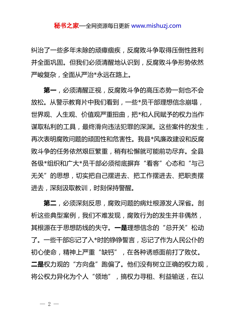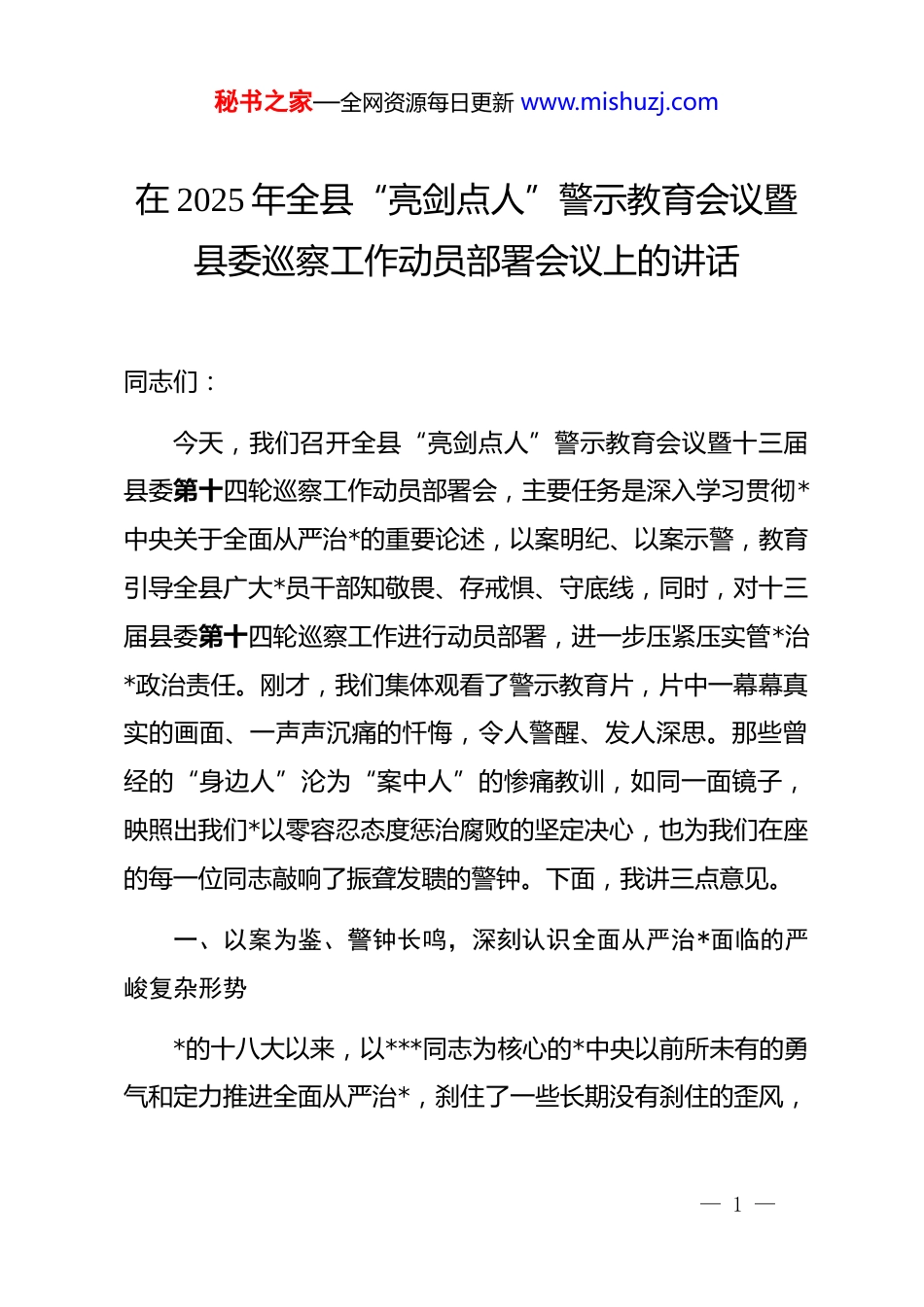 秘书之家—全网资源每日更新 www.mishuzj.com在 2025 年全县“亮剑点人”警示教育会议暨县委巡察工作动员部署会议上的讲话同志们:今天,我们召开全县“亮剑点人”警示教育会议暨十三届县委第十四轮巡察工作动员部署会,主要任务是深入学习贯彻*中央关于全面从严治*的重要论述,以案明纪、以案示警,教育引导全县广大*员干部知敬畏、存戒惧、守底线,同时,对十三届县委第十四轮巡察工作进行动员部署,进一步压紧压实管*治*政治责任。刚才,我们集体观看了警示教育片,片中一幕幕真实的画面、一声声沉痛的忏悔,令人警醒、发人深思。那些曾经的“身边人”沦为“案中人”的惨痛教训,如同一面镜子,映照出我们*以零容忍态度惩治腐败的坚定决心,也为我们在座的每一位同志敲响了振聋发聩的警钟。下面,我讲三点意见。一、以案为鉴、警钟长鸣,深刻认识全面从严治*面临的严峻复杂形势*的十八大以来,以***同志为核心的*中央以前所未有的勇气和定力推进全面从严治*,刹住了一些长期没有刹住的歪风,— 1 —秘书之家—全网资源每日更新 www.mishuzj.com纠治了一些多年未除的顽瘴痼疾,反腐败斗争取得压倒性胜利并全面巩固。但我们必须清醒地认识到,反腐败斗争形势依然严峻复杂,全面从严治*永远在路上。第一,必须清醒正视,反腐败斗争的高压态势一刻也不会放松。从警示教育片中我们看到,一些*员干部理想信念崩塌,世界观、人生观、价值观严重扭曲,把*和人民赋予的权力当作谋取私利的工具,最终滑向违法犯罪的深渊。这些案件的发生,再次表明腐败问题的顽固性和危害性。我县*风廉政建设和反腐败斗争的任务依然艰巨繁重,稍有松懈就可能前功尽弃。全县各级*组织和广大*员干部必须彻底摒弃“看客”心态和“与己无关”的思想,切实把自己摆进去、把工作摆进去、把职责摆进去,深刻汲取教训,时刻保持警醒。第二,必须深刻反思,腐败问题的病灶根源发人深省。剖析这些典型案例,我们不难发现,腐败行为的发生并非偶然,其根源在于思想防线的失守。一是理想信念的“总开关”松动了。一些干部忘记了入*时的铮铮誓言,忘记了作为人民公仆的初心使命,精神上严重“缺钙”,在各种诱惑面前打了败仗。二是权力观的“方向盘”跑偏了。他们没有树立正确的权力观,将公权力异化为个人“领地”,搞权力寻租、利益输送,在以— 2 —秘书之家—全网资源每日更新 www.mishuzj.com权谋私的道路上越走越远。三是纪律规矩的“高压线”触碰了。这些人对 dj 国法缺乏敬畏之心,心存侥幸,认为“天知地知、你知我知”,殊不知“天网恢恢,疏而不漏”,任何违纪违法行为都必将受到严惩。四是自我约束的“防火墙”失效了。面对“糖衣炮弹”的攻击,他们放松了警惕,沉溺于吃喝玩乐,热衷于拉关系、搞“小圈子”,最终被别有用心之人“围猎”,一步步陷入泥潭。这些血的教训告诉我们,思想上的滑坡是最危险的滑坡,信念上的动摇是最致命的动摇。第三,必须扛牢责任,管*治*的政治担当一丝也不能懈怠。全面从言治*是各级*组织的政治责任。从查处的案件看,一些单位之所以问题多发,一个重要原因就是管*治*责任虚化、弱化、边缘化。有的*组织负责人履行“第一责任人”职责不力,对干部疏于教育、管理和监督,搞“好人主义”,奉行“无为而治”;有的班子成员落实“一岗双责”不到位,对分管领域的干部队伍状况不甚了了,只重业务不重廉政。这种失之于宽、失之于软的状况,必须彻底改变。全县各级*组织要切实担负起主体责任,敢于较真、敢于碰硬,真正把严的要求贯彻到管*治*全过程、落实到干部队伍建设各方面。二、标本兼治、固本培元,全面筑牢拒腐防变的思想和制— 3 —秘书之家—全网资源每日更新 www.mishuzj.com度防线警示教育的最终目的,在于治病救人、防患于未然。全县广大*员干部要以案为戒,深刻自省,举一反三,在思想深处和行动自觉上筑起一道坚不可摧的防线。一要筑牢理想信念之基,永葆对*忠诚的政治本色。理想信念是共产*人精神上的“钙”。没有理想信念,或者理想信念不坚定,精神上就会“缺钙”,就会得“软骨病”。全县*员干部要把学习贯彻**************思想作为首要政治任务,...