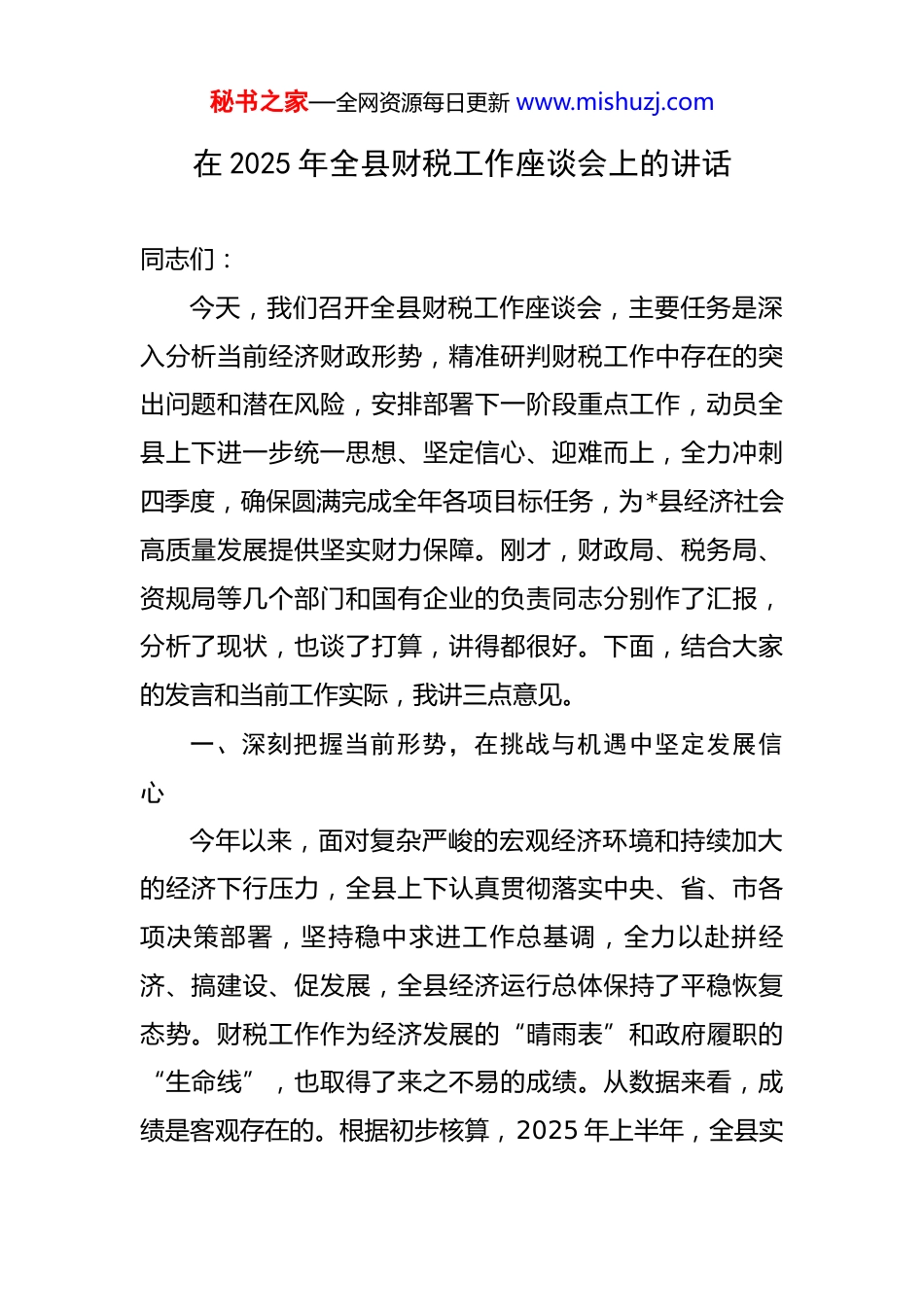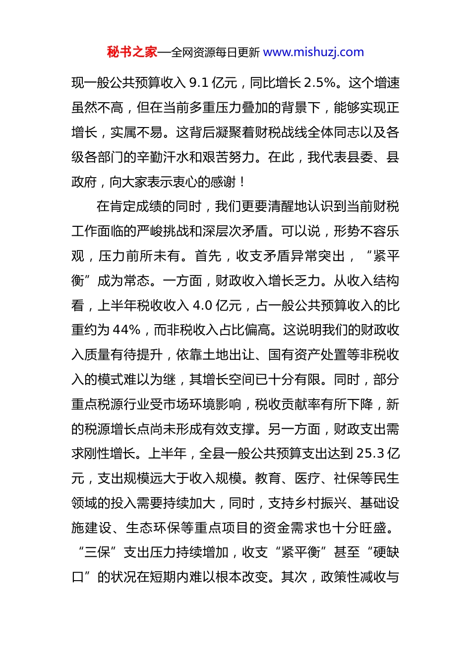 秘书之家—全网资源每日更新 www.mishuzj.com在 2025 年全县财税工作座谈会上的讲话 同志们:今天,我们召开全县财税工作座谈会,主要任务是深入分析当前经济财政形势,精准研判财税工作中存在的突出问题和潜在风险,安排部署下一阶段重点工作,动员全县上下进一步统一思想、坚定信心、迎难而上,全力冲刺四季度,确保圆满完成全年各项目标任务,为*县经济社会高质量发展提供坚实财力保障。刚才,财政局、税务局、资规局等几个部门和国有企业的负责同志分别作了汇报,分析了现状,也谈了打算,讲得都很好。下面,结合大家的发言和当前工作实际,我讲三点意见。一、深刻把握当前形势,在挑战与机遇中坚定发展信心今年以来,面对复杂严峻的宏观经济环境和持续加大的经济下行压力,全县上下认真贯彻落实中央、省、市各项决策部署,坚持稳中求进工作总基调,全力以赴拼经济、搞建设、促发展,全县经济运行总体保持了平稳恢复态势。财税工作作为经济发展的“晴雨表”和政府履职的“生命线”,也取得了来之不易的成绩。从数据来看,成绩是客观存在的。根据初步核算,2025 年上半年,全县实秘书之家—全网资源每日更新 www.mishuzj.com现一般公共预算收入 9.1 亿元,同比增长 2.5%。这个增速虽然不高,但在当前多重压力叠加的背景下,能够实现正增长,实属不易。这背后凝聚着财税战线全体同志以及各级各部门的辛勤汗水和艰苦努力。在此,我代表县委、县政府,向大家表示衷心的感谢!在肯定成绩的同时,我们更要清醒地认识到当前财税工作面临的严峻挑战和深层次矛盾。可以说,形势不容乐观,压力前所未有。首先,收支矛盾异常突出,“紧平衡”成为常态。一方面,财政收入增长乏力。从收入结构看,上半年税收收入 4.0 亿元,占一般公共预算收入的比重约为 44%,而非税收入占比偏高。这说明我们的财政收入质量有待提升,依靠土地出让、国有资产处置等非税收入的模式难以为继,其增长空间已十分有限。同时,部分重点税源行业受市场环境影响,税收贡献率有所下降,新的税源增长点尚未形成有效支撑。另一方面,财政支出需求刚性增长。上半年,全县一般公共预算支出达到 25.3 亿元,支出规模远大于收入规模。教育、医疗、社保等民生领域的投入需要持续加大,同时,支持乡村振兴、基础设施建设、生态环保等重点项目的资金需求也十分旺盛。“三保”支出压力持续增加,收支“紧平衡”甚至“硬缺口”的状况在短期内难以根本改变。其次,政策性减收与秘书之家—全网资源每日更新 www.mishuzj.com财力需求之间的张力持续加大。近年来,国家实施了一系列大规模减税降费、退税缓税政策,为激发市场主体活力、稳定宏观经济大盘发挥了至关重要的作用。这些政策是必须不折不扣落实的政治任务。但客观上,政策的落地也直接导致了我们财政收入的减少。一边是“减收”的硬任务,一边是“增支”的硬需求,这种张力给我们的财政统筹和预算安排带来了巨大挑战。再次,潜在的风险隐患不容忽视。地方政府债务风险防范化解工作进入关键时期,我们需要投入更多财力来稳妥处置存量、坚决遏制增量。部分县属国有企业经营效益不佳,自我“造血”功能不强,对财政的依赖度较高,既未能成为稳定的财源贡献者,反而可能成为潜在的财政风险点。同志们,看问题要用全面、辩证、长远的眼光。困难和挑战是现实存在的,但我们决不能被眼前的困难吓倒,更不能失去发展的信心。*县发展的基本面是好的,长期向好的趋势没有改变。我们的机遇和优势同样突出。一是政策红利蕴含巨大潜力。国家宏观调控政策工具箱依然充足,积极的财政政策要加力提效,稳健的货币政策要精准有力。随着一系列稳增长、扩内需、促消费政策的深入实施,经济复苏的步伐有望进一步加快,这将为我们财政收入的增长提供根本性的宏观环境支撑。二是项目建设积蓄秘书之家—全网资源每日更新 www.mishuzj.com强劲动能。“项目为王”的理念已经深入人心。当前,全县上下正大力推进总投资达 296 亿元的 64 个省、市、县三级重点项目,上半年已完成投资超过 70 亿元。这些项目中,既有投资 50 亿元的城区道路建设等重大基础设施项目,也有农副产...