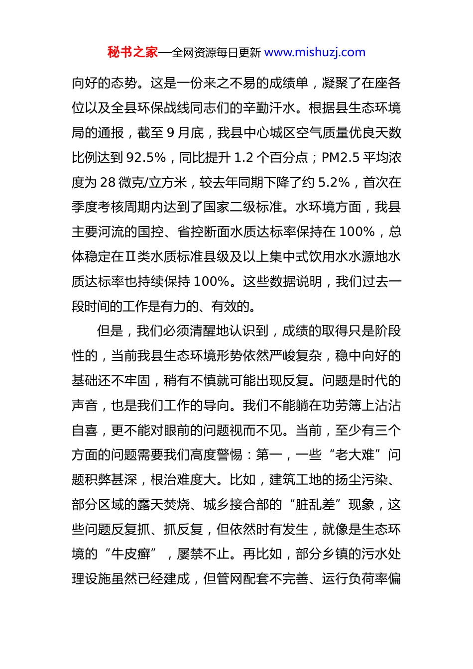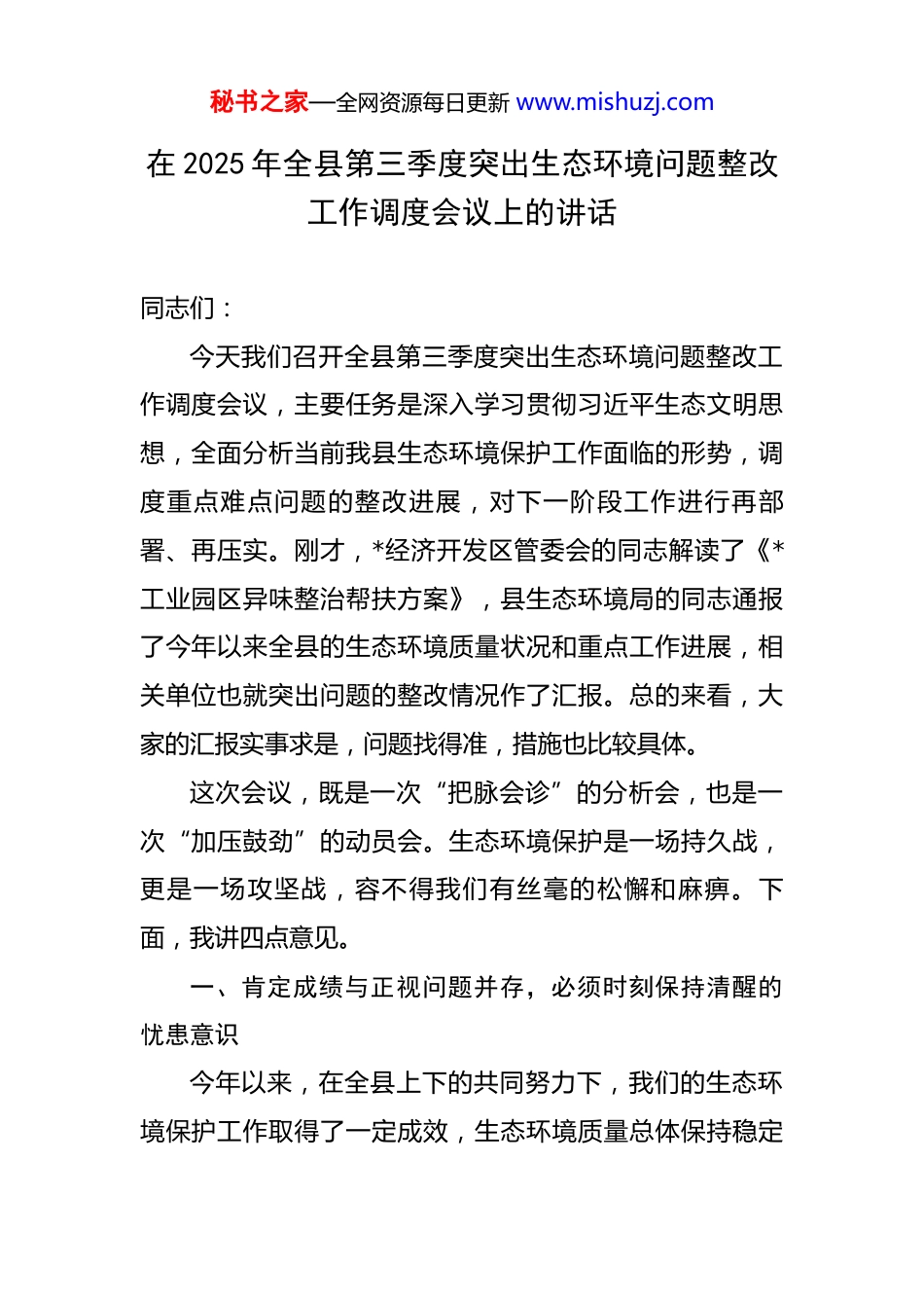 秘书之家—全网资源每日更新 www.mishuzj.com在 2025 年全县第三季度突出生态环境问题整改工作调度会议上的讲话 同志们:今天我们召开全县第三季度突出生态环境问题整改工作调度会议,主要任务是深入学习贯彻习近平生态文明思想,全面分析当前我县生态环境保护工作面临的形势,调度重点难点问题的整改进展,对下一阶段工作进行再部署、再压实。刚才,*经济开发区管委会的同志解读了《*工业园区异味整治帮扶方案》,县生态环境局的同志通报了今年以来全县的生态环境质量状况和重点工作进展,相关单位也就突出问题的整改情况作了汇报。总的来看,大家的汇报实事求是,问题找得准,措施也比较具体。这次会议,既是一次“把脉会诊”的分析会,也是一次“加压鼓劲”的动员会。生态环境保护是一场持久战,更是一场攻坚战,容不得我们有丝毫的松懈和麻痹。下面,我讲四点意见。一、肯定成绩与正视问题并存,必须时刻保持清醒的忧患意识今年以来,在全县上下的共同努力下,我们的生态环境保护工作取得了一定成效,生态环境质量总体保持稳定秘书之家—全网资源每日更新 www.mishuzj.com向好的态势。这是一份来之不易的成绩单,凝聚了在座各位以及全县环保战线同志们的辛勤汗水。根据县生态环境局的通报,截至 9 月底,我县中心城区空气质量优良天数比例达到 92.5%,同比提升 1.2 个百分点;PM2.5 平均浓度为 28 微克/立方米,较去年同期下降了约 5.2%,首次在季度考核周期内达到了国家二级标准。水环境方面,我县主要河流的国控、省控断面水质达标率保持在 100%,总体稳定在Ⅱ类水质标准县级及以上集中式饮用水水源地水质达标率也持续保持 100%。这些数据说明,我们过去一段时间的工作是有力的、有效的。但是,我们必须清醒地认识到,成绩的取得只是阶段性的,当前我县生态环境形势依然严峻复杂,稳中向好的基础还不牢固,稍有不慎就可能出现反复。问题是时代的声音,也是我们工作的导向。我们不能躺在功劳簿上沾沾自喜,更不能对眼前的问题视而不见。当前,至少有三个方面的问题需要我们高度警惕:第一,一些“老大难”问题积弊甚深,根治难度大。比如,建筑工地的扬尘污染、部分区域的露天焚烧、城乡接合部的“脏乱差”现象,这些问题反复抓、抓反复,但依然时有发生,就像是生态环境的“牛皮癣”,屡禁不止。再比如,部分乡镇的污水处理设施虽然已经建成,但管网配套不完善、运行负荷率偏秘书之家—全网资源每日更新 www.mishuzj.com低,导致处理效能大打折扣。还有一些区域的畜禽养殖污染问题,虽然经过多轮整治,但散户污染、粪污资源化利用水平不高等问题依然存在。这些问题的背后,反映出的是我们常态化监管机制的短板和末端治理能力的不足。第二,一些“新发性”问题凸显,成为群众反映强烈的痛点。随着我县工业化、城镇化进程的加快,一些新的环境问题开始浮出水面,其中最典型的就是今天会议重点讨论的*工业园区异味扰民问题。这个问题不仅影响了周边群众的正常生产生活,也损害了我县的对外形象,成了一个亟待解决的“民生之患”。这类问题技术性强、涉及面广,治理起来更为复杂,考验着我们的治理智慧和担当精神。如果我们不能及时有效应对,就可能从一个环境问题演变为社会稳定问题。第三,一些整改工作存在“温差”现象,责任压力传导不到位。从督查情况看,部分单位和干部在思想认识上仍然存在偏差,认为环保是“软任务”,说起来重要、干起来次要、忙起来不要。具体表现为:有的问题整改方案制定得很好,但行动迟缓、推进不力,停留在“纸上整改”;有的问题整改满足于“头痛医头、脚痛医脚”,缺乏举一反三、标本兼治的长效机制,导致问题整改后不久又死灰复燃;还有的单位之间推诿扯皮,“上热中温下冷”的现象依然存在,压力传导层层递减。秘书之家—全网资源每日更新 www.mishuzj.com这种“制度空转”的现象,是抓好问题整改的最大障碍。这些问题,无论新旧,都是我们绕不开、躲不过的坎,是我们必须啃下的“硬骨头”。全县各级各部门务必要把思想和行动统一到县委、县政府的决策部署上来,以“等不起”的紧迫感、“慢不得”的危机感和“坐不住”的责...