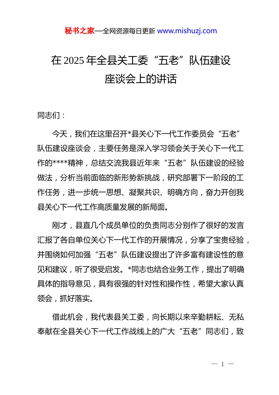 秘书之家—全网资源每日更新 www.mishuzj.com在 2025 年全县关工委“五老”队伍建设座谈会上的讲话同志们:今天,我们在这里召开*县关心下一代工作委员会“五老”队伍建设座谈会,主要任务是深入学习领会关于关心下一代工作的****精神,总结交流我县近年来“五老”队伍建设的经验做法,分析当前面临的新形势新挑战,研究部署下一阶段的工作任务,进一步统一思想、凝聚共识、明确方向,奋力开创我县关心下一代工作高质量发展的新局面。刚才,县直几个成员单位的负责同志分别作了很好的发言汇报了各自单位关心下一代工作的开展情况,分享了宝贵经验,并围绕如何加强“五老”队伍建设提出了许多富有建设性的意见和建议,听了很受启发。*同志也结合业务工作,提出了明确具体的指导意见,具有很强的针对性和操作性,希望大家认真领会,抓好落实。借此机会,我代表县关工委,向长期以来辛勤耕耘、无私奉献在全县关心下一代工作战线上的广大“五老”同志们,致— 1 —秘书之家—全网资源每日更新 www.mishuzj.com以最崇高的敬意!向高度重视、大力支持关心下一代工作的各成员单位,表示最衷心的感谢!下面,我讲三点意见。一、肯定成绩,深化认识,深刻把握加强“五老”队伍建设的时代价值与重大意义关心下一代工作,是事关*和国家前途命运的战略工程,是关系中华民族伟大复兴的基础工程。“五老”队伍是开展关心下一代工作的主力军和宝贵财富。回顾过去几年的工作,在县委、县政府的坚强领导下,在社会各界的大力支持下,我县关工委紧紧围绕中心、服务大局,团结带领全县广大“五老”,在教育、引导、关爱、保护青少年方面做了大量卓有成效的工作,取得了令人瞩目的成绩。一是“五老”队伍规模持续壮大,组织基础更加坚实。我们始终把“五老”队伍建设作为一项基础性、先导性工程来抓,坚持“巩固、发展、提高、壮大”的方针,通过组织发动、典型带动、感情感召等多种方式,广泛动员和吸纳身体健康、热心公益、经验丰富的离退休老同志参与到关心下一代事业中来。据不完全统计,过去三年,我县在各级关工委登记在册的“五老”志愿者队伍从最初的不足 800人发展到现在的 1500 余人,基本形成了覆盖城乡、遍布各行各业的“五老”工作网络。特别是在教育、政法、卫生、农业等— 2 —秘书之家—全网资源每日更新 www.mishuzj.com领域,涌现出了一大批有威望、有热情、有专长的骨干力量,为我们工作的深入开展奠定了坚实的组织基础。二是品牌活动特色日益彰显,社会影响更加广泛。全县各级关工委和广大“五老”紧扣时代脉搏,围绕青少年成长成才的实际需求,精心策划并组织实施了一系列主题鲜明、内容丰富、形式多样的品牌活动。例如,以传承红色基因为核心的“老兵话传统”宣讲团,三年来深入全县 100 多所中小学校和社区,开展巡回宣讲超过 200 场次,听众超过 5 万人次,让红色江山代代相传的信念在青少年心中深深扎根。以法治护航为目标的“夕阳青风”普法工作站,由退休老法官、老检察官、老警官组成,通过模拟法庭、法治班会、法律咨询等形式,有效提升了青少年的法治意识和自我保护能力。以关爱帮扶为重点的“爱心爷爷奶奶”结对活动,三年来累计与超过 300 名留守儿童、困境儿童结成帮扶对子,从生活照料、学业辅导到心理疏导,给予他们全方位的关爱,让他们感受到了社会的温暖。这些品牌活动,已经成为我县精神文明建设的一道亮丽风景线,赢得了社会各界的广泛赞誉。三是服务大局贡献更加突出,育人成效更加显著。广大“五老”积极响应*委、政府号召,主动融入全县经济社会发展大局,在参与社会治理、化解矛盾纠纷、优化育人环境等方面发挥了不可替代的作用。在社区,他们是网格里的— 3 —秘书之家—全网资源每日更新 www.mishuzj.com“政策宣传员”“民情联络员”和“矛盾调解员”,为构建和谐社区贡献智慧;在乡村,他们是“乡风文明监督员”和“科技致富辅导员”,助力乡村振兴;在网络空间,他们组建“银发护网队”,主动监督和抵制不良信息,为青少年营造清朗的网络环境。正是因为有了这支可敬可爱的“五老”队伍,我们的工作才有了坚实的根基和不竭的动...