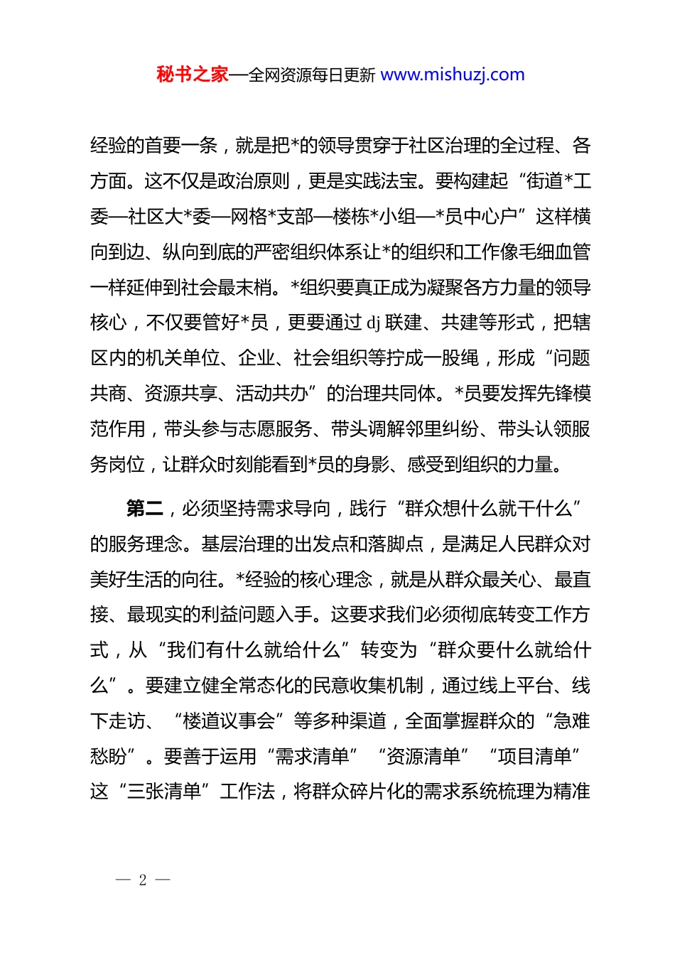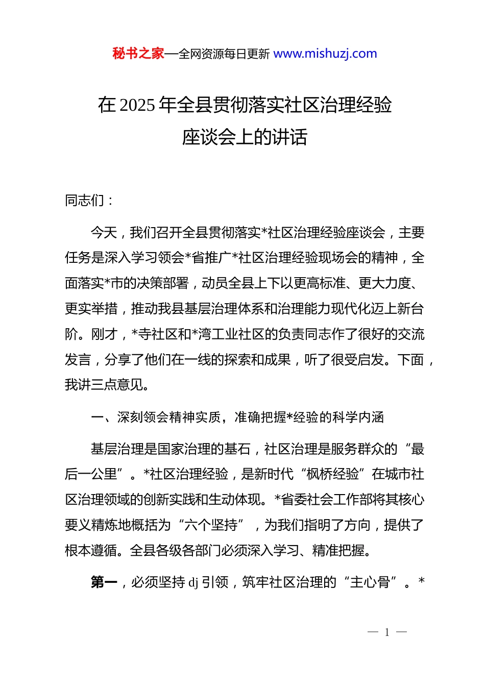 秘书之家—全网资源每日更新 www.mishuzj.com在 2025 年全县贯彻落实社区治理经验座谈会上的讲话同志们:今天,我们召开全县贯彻落实*社区治理经验座谈会,主要任务是深入学习领会*省推广*社区治理经验现场会的精神,全面落实*市的决策部署,动员全县上下以更高标准、更大力度、更实举措,推动我县基层治理体系和治理能力现代化迈上新台阶。刚才,*寺社区和*湾工业社区的负责同志作了很好的交流发言,分享了他们在一线的探索和成果,听了很受启发。下面,我讲三点意见。一、深刻领会精神实质,准确把握*经验的科学内涵基层治理是国家治理的基石,社区治理是服务群众的“最后一公里”。*社区治理经验,是新时代“枫桥经验”在城市社区治理领域的创新实践和生动体现。*省委社会工作部将其核心要义精炼地概括为“六个坚持”,为我们指明了方向,提供了根本遵循。全县各级各部门必须深入学习、精准把握。第一,必须坚持 dj 引领,筑牢社区治理的“主心骨”。*— 1 —秘书之家—全网资源每日更新 www.mishuzj.com经验的首要一条,就是把*的领导贯穿于社区治理的全过程、各方面。这不仅是政治原则,更是实践法宝。要构建起“街道*工委—社区大*委—网格*支部—楼栋*小组—*员中心户”这样横向到边、纵向到底的严密组织体系让*的组织和工作像毛细血管一样延伸到社会最末梢。*组织要真正成为凝聚各方力量的领导核心,不仅要管好*员,更要通过 dj 联建、共建等形式,把辖区内的机关单位、企业、社会组织等拧成一股绳,形成“问题共商、资源共享、活动共办”的治理共同体。*员要发挥先锋模范作用,带头参与志愿服务、带头调解邻里纠纷、带头认领服务岗位,让群众时刻能看到*员的身影、感受到组织的力量。第二,必须坚持需求导向,践行“群众想什么就干什么”的服务理念。基层治理的出发点和落脚点,是满足人民群众对美好生活的向往。*经验的核心理念,就是从群众最关心、最直接、最现实的利益问题入手。这要求我们必须彻底转变工作方式,从“我们有什么就给什么”转变为“群众要什么就给什么”。要建立健全常态化的民意收集机制,通过线上平台、线下走访、“楼道议事会”等多种渠道,全面掌握群众的“急难愁盼”。要善于运用“需求清单”“资源清单”“项目清单”这“三张清单”工作法,将群众碎片化的需求系统梳理为精准— 2 —秘书之家—全网资源每日更新 www.mishuzj.com的服务项目,再链接辖区内外的资源进行有效供给。从解决“爱心教室”的孩子托管难题,到推动老旧小区加装电梯的“电梯公交”模式,*社区的成功案例反复证明,只有把群众的“心上事”当作我们的“上心事”,治理工作才能获得最广泛的支持。第三,必须坚持群众主体,引导“群众的事情由群众商量着办”。社区的主人是居民,基层治理的最大伟力蕴藏于人民群众之中。*经验强调要充分发动群众、组织群众、依靠群众,让居民从“旁观者”变为“参与者”,从“治理对象”变为“治理主体”。要大力发展基层民主,拓宽群众参与治理的制度化渠道。议事协商是关键一环,要搭建好协商平台,让涉及群众切身利益的大小事务,都能在公开、平等的沟通中找到最大公约数。要注重培育居民自治的骨干力量,发掘那些有威望、有能力、有热情的“能人”“达人”,支持他们牵头成立自治组织、开展公益活动,形成“头雁引领、群雁齐飞”的生动局面。当群众自己的事情自己说了算、自己动手办,社区的内生动力就会被彻底激活,许多过去看来老大难的问题,也将在群众的智慧和行动中迎刃而解。第四,必须坚持社会协同,凝聚多元共治的磅礴力量。现— 3 —秘书之家—全网资源每日更新 www.mishuzj.com代社会治理是一个复杂的系统工程,单靠政府部门或社区“单打独斗”难以为继。*经验的突出特点,就是构建了*委领导、政府负责、社会协同、公众参与、法治保障的多元共治格局。“社会协同”是其中的关键变量。要大力培育和发展社区社会组织,特别是扶持那些服务性、公益性、互助性的“草根”组织,支持他们承接专业服务、组织文体活动、化解邻里矛盾,使其成为社区服务的重要补充力量。要建立健全志愿服务体系,完善志愿者招募、培训、激...