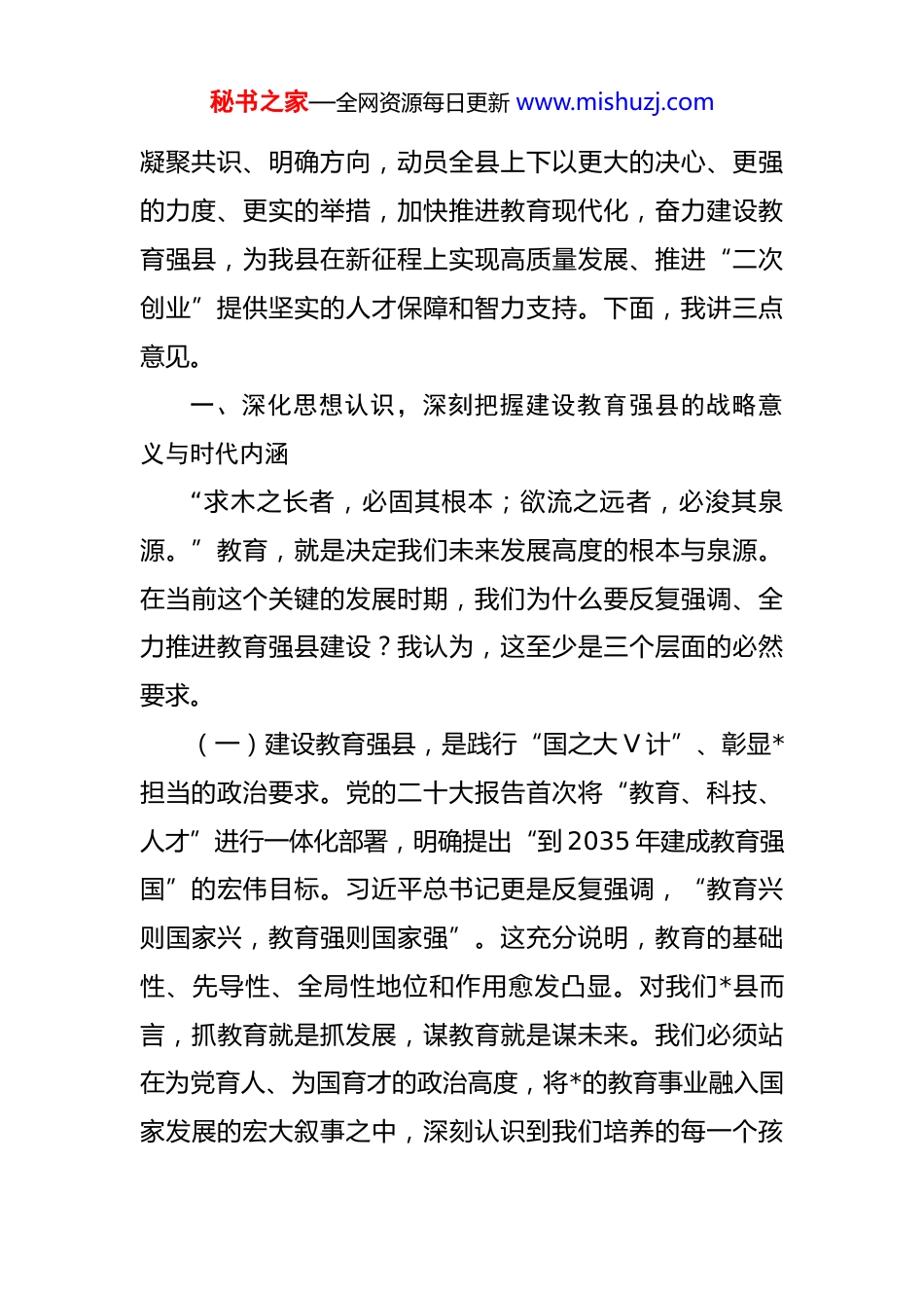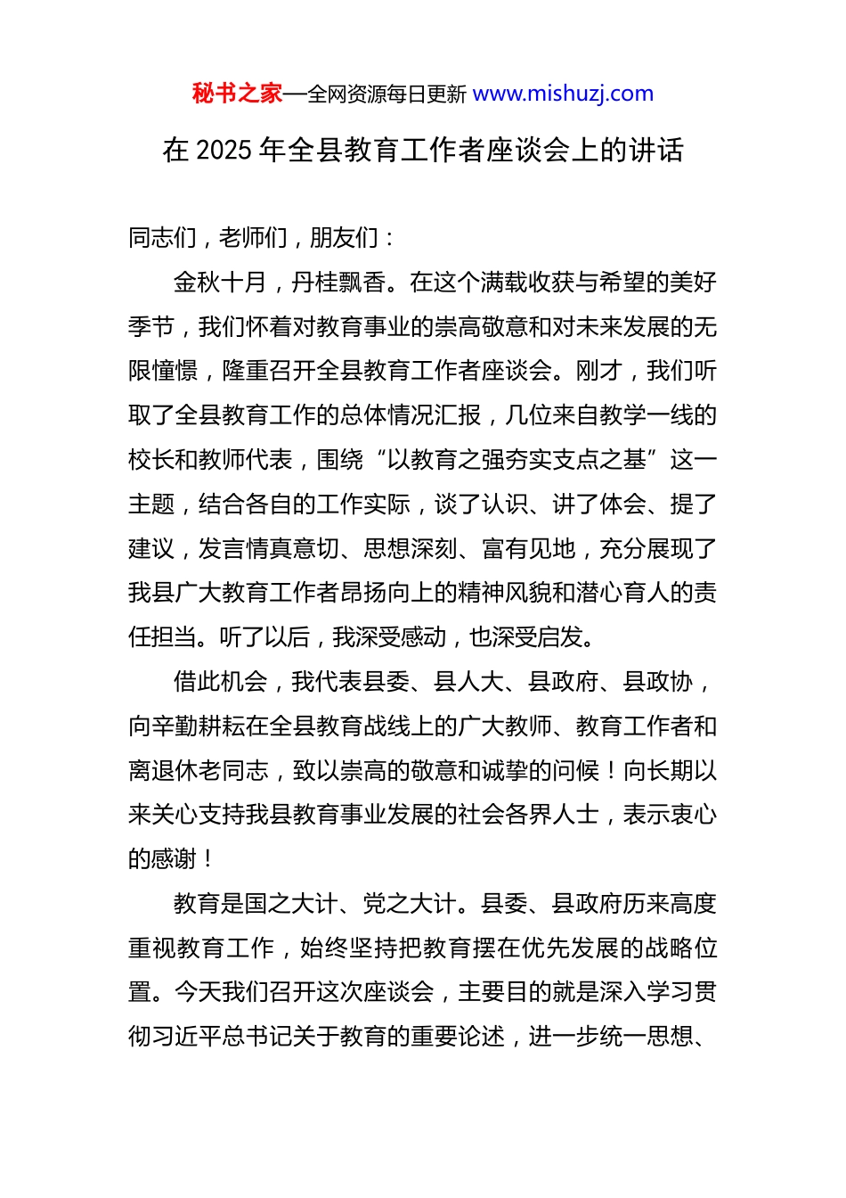 秘书之家—全网资源每日更新 www.mishuzj.com在 2025 年全县教育工作者座谈会上的讲话 同志们,老师们,朋友们:金秋十月,丹桂飘香。在这个满载收获与希望的美好季节,我们怀着对教育事业的崇高敬意和对未来发展的无限憧憬,隆重召开全县教育工作者座谈会。刚才,我们听取了全县教育工作的总体情况汇报,几位来自教学一线的校长和教师代表,围绕“以教育之强夯实支点之基”这一主题,结合各自的工作实际,谈了认识、讲了体会、提了建议,发言情真意切、思想深刻、富有见地,充分展现了我县广大教育工作者昂扬向上的精神风貌和潜心育人的责任担当。听了以后,我深受感动,也深受启发。借此机会,我代表县委、县人大、县政府、县政协,向辛勤耕耘在全县教育战线上的广大教师、教育工作者和离退休老同志,致以崇高的敬意和诚挚的问候!向长期以来关心支持我县教育事业发展的社会各界人士,表示衷心的感谢!教育是国之大计、党之大计。县委、县政府历来高度重视教育工作,始终坚持把教育摆在优先发展的战略位置。今天我们召开这次座谈会,主要目的就是深入学习贯彻习近平总书记关于教育的重要论述,进一步统一思想、秘书之家—全网资源每日更新 www.mishuzj.com凝聚共识、明确方向,动员全县上下以更大的决心、更强的力度、更实的举措,加快推进教育现代化,奋力建设教育强县,为我县在新征程上实现高质量发展、推进“二次创业”提供坚实的人才保障和智力支持。下面,我讲三点意见。一、深化思想认识,深刻把握建设教育强县的战略意义与时代内涵“求木之长者,必固其根本;欲流之远者,必浚其泉源。”教育,就是决定我们未来发展高度的根本与泉源。在当前这个关键的发展时期,我们为什么要反复强调、全力推进教育强县建设?我认为,这至少是三个层面的必然要求。(一)建设教育强县,是践行“国之大 V 计”、彰显*担当的政治要求。党的二十大报告首次将“教育、科技、人才”进行一体化部署,明确提出“到 2035 年建成教育强国”的宏伟目标。习近平总书记更是反复强调,“教育兴则国家兴,教育强则国家强”。这充分说明,教育的基础性、先导性、全局性地位和作用愈发凸显。对我们*县而言,抓教育就是抓发展,谋教育就是谋未来。我们必须站在为党育人、为国育才的政治高度,将*的教育事业融入国家发展的宏大叙事之中,深刻认识到我们培养的每一个孩秘书之家—全网资源每日更新 www.mishuzj.com子,都关系到国家的未来和民族的希望。因此,加快建设教育强县,不是一个选择题,而是一个必须完成的政治任务;不是一个地方性的工作部署,而是我们作为一个基层执政单元必须扛起的时代重任。我们必须以高度的政治自觉,把党中央的宏伟蓝图转化为*的生动实践。(二)建设教育强县,是实现“突围破局”、激发*潜能的现实需要。当前,区域竞争日趋激烈,其本质是人才的竞争、创新的竞争,归根结底是教育的竞争。*县要实现跨越式发展,在激烈的区域竞争中赢得主动、占据优势,最根本的动力源在哪里?就在教育。教育是吸引人才、留住人才、培育人才的核心磁场。一个地方有了优质的教育,就能让高端人才愿意来、留得住,让本地企业家安心创业、放心发展,更能让我们自己的孩子在家门口就能享受到高质量的教育,成长为建设家乡的栋梁之材。可以说,教育强县是我们实现“二次创业”、推进产业升级的“发动机”,是我们优化营商环境、提升城市吸引力的“强磁场”,是我们增强发展后劲、积蓄长远动力的“蓄水池”。我们必须把教育从过去单纯的“基础支撑”角色,提升到“引领发展”的新高度,让教育成为我们最宝贵的资源、最持久的动力。(三)建设教育强县,是顺应“民心所盼”、兑现*承秘书之家—全网资源每日更新 www.mishuzj.com诺的民生之本。“治国有常,而利民为本。”人民群众对美好生活的向往,最朴素、最直接的体现就是希望自己的孩子能接受更好的教育。从“有学上”到“上好学”,从“学知识”到“促成才”,这不仅是广大家庭最深切的期盼,也是我们党委、政府必须用心用情办好的头等民生大事。教育公平是社会公平的重要基石。办好每一所学校,关爱好每一个孩子,就是守护千万个家...