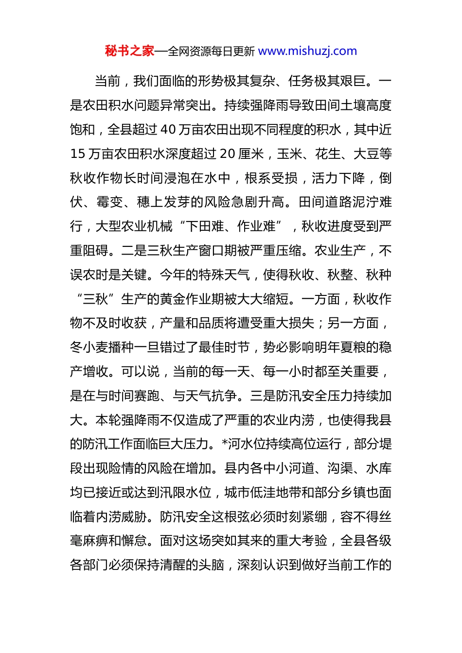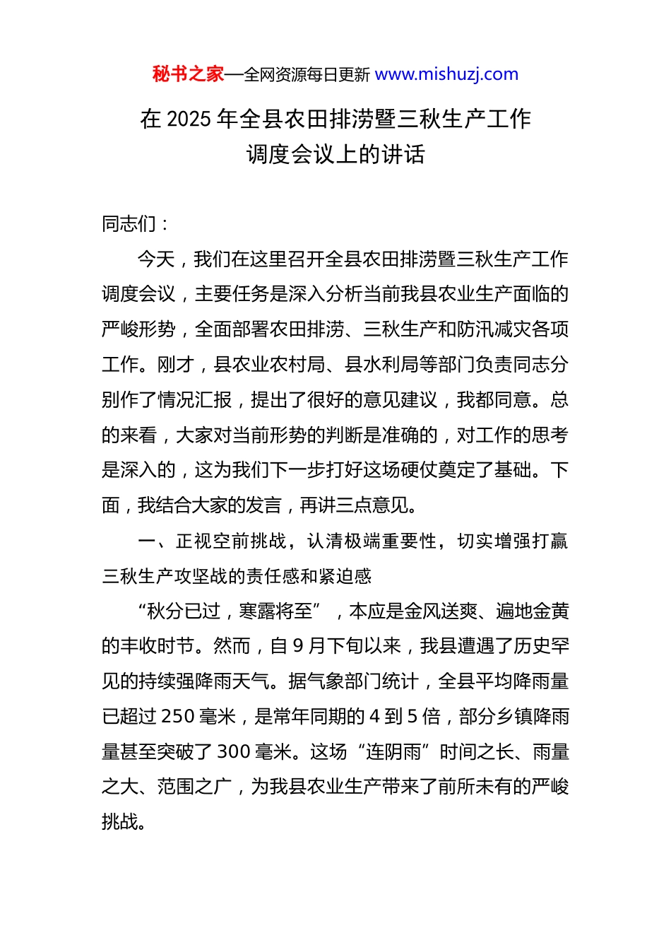 秘书之家—全网资源每日更新 www.mishuzj.com在 2025 年全县农田排涝暨三秋生产工作调度会议上的讲话 同志们:今天,我们在这里召开全县农田排涝暨三秋生产工作调度会议,主要任务是深入分析当前我县农业生产面临的严峻形势,全面部署农田排涝、三秋生产和防汛减灾各项工作。刚才,县农业农村局、县水利局等部门负责同志分别作了情况汇报,提出了很好的意见建议,我都同意。总的来看,大家对当前形势的判断是准确的,对工作的思考是深入的,这为我们下一步打好这场硬仗奠定了基础。下面,我结合大家的发言,再讲三点意见。一、正视空前挑战,认清极端重要性,切实增强打赢三秋生产攻坚战的责任感和紧迫感“秋分已过,寒露将至”,本应是金风送爽、遍地金黄的丰收时节。然而,自 9 月下旬以来,我县遭遇了历史罕见的持续强降雨天气。据气象部门统计,全县平均降雨量已超过 250 毫米,是常年同期的 4 到 5 倍,部分乡镇降雨量甚至突破了 300 毫米。这场“连阴雨”时间之长、雨量之大、范围之广,为我县农业生产带来了前所未有的严峻挑战。秘书之家—全网资源每日更新 www.mishuzj.com当前,我们面临的形势极其复杂、任务极其艰巨。一是农田积水问题异常突出。持续强降雨导致田间土壤高度饱和,全县超过 40 万亩农田出现不同程度的积水,其中近15 万亩农田积水深度超过 20 厘米,玉米、花生、大豆等秋收作物长时间浸泡在水中,根系受损,活力下降,倒伏、霉变、穗上发芽的风险急剧升高。田间道路泥泞难行,大型农业机械“下田难、作业难”,秋收进度受到严重阻碍。二是三秋生产窗口期被严重压缩。农业生产,不误农时是关键。今年的特殊天气,使得秋收、秋整、秋种“三秋”生产的黄金作业期被大大缩短。一方面,秋收作物不及时收获,产量和品质将遭受重大损失;另一方面,冬小麦播种一旦错过了最佳时节,势必影响明年夏粮的稳产增收。可以说,当前的每一天、每一小时都至关重要,是在与时间赛跑、与天气抗争。三是防汛安全压力持续加大。本轮强降雨不仅造成了严重的农业内涝,也使得我县的防汛工作面临巨大压力。*河水位持续高位运行,部分堤段出现险情的风险在增加。县内各中小河道、沟渠、水库均已接近或达到汛限水位,城市低洼地带和部分乡镇也面临着内涝威胁。防汛安全这根弦必须时刻紧绷,容不得丝毫麻痹和懈怠。面对这场突如其来的重大考验,全县各级各部门必须保持清醒的头脑,深刻认识到做好当前工作的秘书之家—全网资源每日更新 www.mishuzj.com极端重要性。这不仅是一场关系到广大农民群众切身利益的“收成保卫战”,更是一场关系到全县粮食安全大局和经济社会稳定发展的“关键攻坚战”。“民为国基,谷为民命”。粮食安全是“国之大者”,是社会稳定的“压舱石”。我们必须站在讲政治、顾大局的高度,充分认识到抓好三秋生产、确保粮食颗粒归仓的重大意义。我们肩上的担子,一头连着国家粮食安全战略,一头连着全县数十万农民群众的“钱袋子”和一年的辛勤期盼。我们没有任何退路,必须以“临战状态、战时标准”,迎难而上,主动作为,坚决打赢这场硬仗,最大限度降低灾害损失,全力保障农业增产、农民增收。二、聚焦关键环节,采取超常措施,坚决有力地抓好当前各项重点工作任务已经明确,关键在于落实。全县上下要立即行动起来,把工作重心、资源力量、干部精力全部集中到抗灾减灾和三秋生产上来,突出重点,精准施策,务求实效。(一)全力以赴,坚决打好农田排涝歼灭战。排水是减灾的基础,是抢收抢种的前提。必须把农田排涝作为当前最紧迫、最核心的任务来抓,采取一切可以采取的措施,动员一切可以动员的力量,与积水“抢时间”,为丰收“抢空间”。一要精准摸排,做到心中有数。各乡镇秘书之家—全网资源每日更新 www.mishuzj.com(街道)要立即组织乡村干部、技术人员和网格员,深入田间地头,开展拉网式排查。要逐村、逐地块精准核实农田积水面积、平均深度、受灾作物种类以及预估受灾程度,建立详细台账,绘制“作战图”。这项工作要细之又细,确保数据真实准确,为我们科学决策、分类施策、精准调度提供可靠依据。县农业农村局要加强统筹...