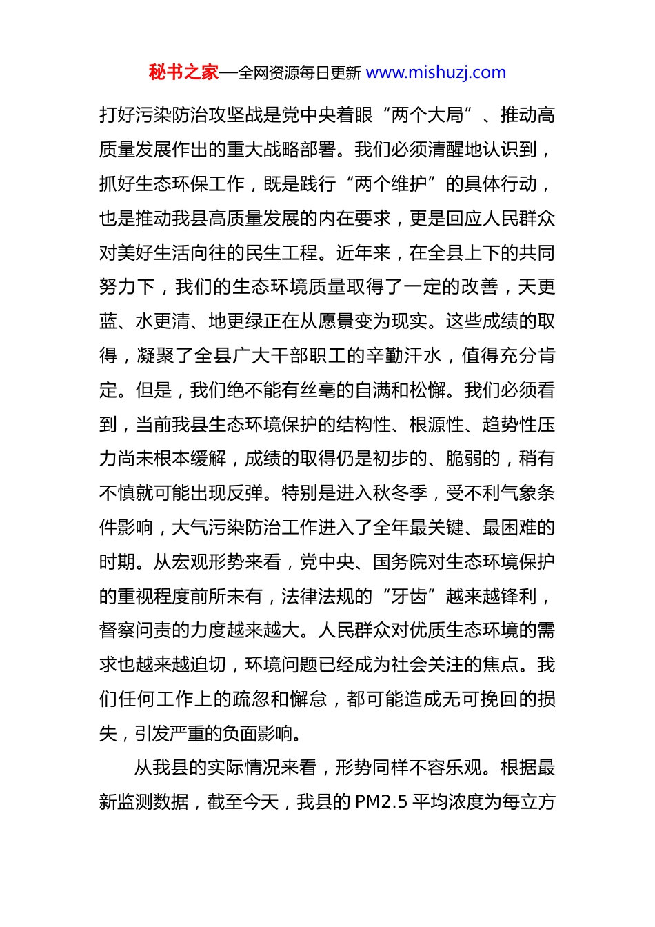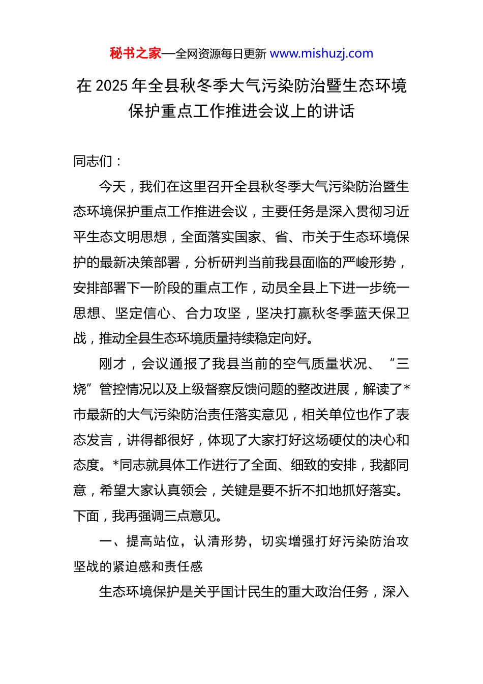 秘书之家—全网资源每日更新 www.mishuzj.com在 2025 年全县秋冬季大气污染防治暨生态环境保护重点工作推进会议上的讲话 同志们:今天,我们在这里召开全县秋冬季大气污染防治暨生态环境保护重点工作推进会议,主要任务是深入贯彻习近平生态文明思想,全面落实国家、省、市关于生态环境保护的最新决策部署,分析研判当前我县面临的严峻形势,安排部署下一阶段的重点工作,动员全县上下进一步统一思想、坚定信心、合力攻坚,坚决打赢秋冬季蓝天保卫战,推动全县生态环境质量持续稳定向好。刚才,会议通报了我县当前的空气质量状况、“三烧”管控情况以及上级督察反馈问题的整改进展,解读了*市最新的大气污染防治责任落实意见,相关单位也作了表态发言,讲得都很好,体现了大家打好这场硬仗的决心和态度。*同志就具体工作进行了全面、细致的安排,我都同意,希望大家认真领会,关键是要不折不扣地抓好落实。下面,我再强调三点意见。一、提高站位,认清形势,切实增强打好污染防治攻坚战的紧迫感和责任感生态环境保护是关乎国计民生的重大政治任务,深入秘书之家—全网资源每日更新 www.mishuzj.com打好污染防治攻坚战是党中央着眼“两个大局”、推动高质量发展作出的重大战略部署。我们必须清醒地认识到,抓好生态环保工作,既是践行“两个维护”的具体行动,也是推动我县高质量发展的内在要求,更是回应人民群众对美好生活向往的民生工程。近年来,在全县上下的共同努力下,我们的生态环境质量取得了一定的改善,天更蓝、水更清、地更绿正在从愿景变为现实。这些成绩的取得,凝聚了全县广大干部职工的辛勤汗水,值得充分肯定。但是,我们绝不能有丝毫的自满和松懈。我们必须看到,当前我县生态环境保护的结构性、根源性、趋势性压力尚未根本缓解,成绩的取得仍是初步的、脆弱的,稍有不慎就可能出现反弹。特别是进入秋冬季,受不利气象条件影响,大气污染防治工作进入了全年最关键、最困难的时期。从宏观形势来看,党中央、国务院对生态环境保护的重视程度前所未有,法律法规的“牙齿”越来越锋利,督察问责的力度越来越大。人民群众对优质生态环境的需求也越来越迫切,环境问题已经成为社会关注的焦点。我们任何工作上的疏忽和懈怠,都可能造成无可挽回的损失,引发严重的负面影响。从我县的实际情况来看,形势同样不容乐观。根据最新监测数据,截至今天,我县的 PM2.5 平均浓度为每立方秘书之家—全网资源每日更新 www.mishuzj.com米 42 微克,虽然在全市排名相对靠前,但距离我们年度38 微克的考核目标还有不小的差距。全县空气质量优良天数累计为 215 天,距离全年优良天数比例 80%的目标任务,还差近 40 天。这意味着,在剩下的两个多月时间里,我们必须争分夺秒,付出超常的努力,才能确保完成年度目标。同时,我们必须正视,上级环保督察反馈的部分问题整改还不够彻底、不够到位,一些深层次的矛盾和问题尚未得到根本解决;工业围城、产业结构偏重、能源结构不优的局面短期内难以根本改变;散煤治理、扬尘管控、移动源污染等领域的监管还存在短板和漏洞。这些都是摆在我们面前的“硬骨头”,也是我们下一步必须集中力量攻克的重点。全县各级各部门必须把思想和行动统一到县委、县政府的决策部署上来,深刻认识做好秋冬季大气污染防治工作的极端重要性和现实紧迫性。这不仅是一场环境治理的攻坚战,更是一场检验我们干部队伍责任担当和能力作风的政治大考。我们必须摒弃“歇歇脚、松口气”的麻痹思想,克服“看天吃饭等风来”的侥幸心理,以“时时放心不下”的责任感和“逆水行舟、不进则退”的危机感,锚定我县建设“一个核心、两大片区、三大廊道”生态屏障的战略目标,以决战决胜的姿态,全力以赴投入到这场攻坚战中,坚决守护好*的蓝天白云。秘书之家—全网资源每日更新 www.mishuzj.com二、聚焦重点,精准施策,全面落实秋冬季污染防治的各项硬核措施打赢秋冬季污染防治攻坚战,必须坚持目标导向、问题导向、结果导向,抓住主要矛盾和矛盾的主要方面,精准发力、综合施策。要紧紧围绕空气质量改善目标,对照上级要求和我县实际,拿出更坚决的态度、更...