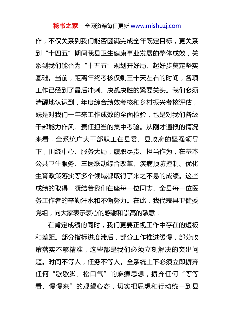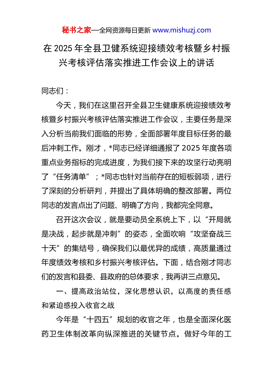 秘书之家—全网资源每日更新 www.mishuzj.com在 2025 年全县卫健系统迎接绩效考核暨乡村振兴考核评估落实推进工作会议上的讲话 同志们:今天,我们在这里召开全县卫生健康系统迎接绩效考核暨乡村振兴考核评估落实推进工作会议,主要任务是深入分析当前我们面临的形势,全面部署年度目标任务的最后冲刺工作。刚才,*同志已经详细通报了 2025 年度各项重点业务指标的完成进度,为我们接下来的攻坚行动亮明了“任务清单”;*同志也针对当前存在的短板弱项,进行了深刻的分析研判,并提出了具体明确的整改部署。两位同志的发言点出了问题、明确了方向,我都完全同意。召开这次会议,就是要动员全系统上下,以“开局就是决战,起步就是冲刺”的姿态,全面吹响“攻坚奋战三十天”的集结号,确保我们以最优异的成绩,高质量通过年度绩效考核和乡村振兴考核评估。下面,结合刚才同志们的发言和县委、县政府的总体要求,我再讲三点意见。一、提高政治站位,深化思想认识,以高度的责任感和紧迫感投入收官之战今年是“十四五”规划的收官之年,也是全面深化医药卫生体制改革向纵深推进的关键节点。做好今年的工秘书之家—全网资源每日更新 www.mishuzj.com作,不仅关系到我们能否圆满完成全年既定目标,更关系到“十四五”期间我县卫生健康事业发展的整体成效,关系到我们能否为“十五五”规划开好局、起好步奠定坚实基础。当前,距离年终考核仅剩三十天左右的时间,各项工作已经到了最后冲刺、决战决胜的紧要关头。我们必须清醒地认识到,年度综合绩效考核和乡村振兴考核评估,既是对我们一年来工作成效的全面检验,也是对我们各级干部能力作风、责任担当的集中考验。从刚才通报的情况来看,全系统广大干部职工在县委、县政府的坚强领导下,围绕中心、服务大局,履职尽责、担当作为,在基本公共卫生服务、三医联动综合改革、疾病预防控制、优化生育政策落实等多个领域都取得了来之不易的成绩。这些成绩的取得,凝结着我们在座每一位同志、全县每一位医务工作者的辛勤汗水和不懈努力。在此,我代表县卫健委党组,向大家表示衷心的感谢和崇高的敬意!在肯定成绩的同时,我们更要正视工作中存在的短板和差距。部分指标进度滞后,部分工作推进缓慢,部分政策落实不够精准,这些都是我们必须立刻解决的突出问题。时间不等人,任务不等人。全系统上下必须立即摒弃任何“歇歇脚、松口气”的麻痹思想,摒弃任何“等等看、慢慢来”的观望心态,切实把思想和行动统一到县秘书之家—全网资源每日更新 www.mishuzj.com委、县政府的决策部署上来,统一到这次会议的工作要求上来。各单位、各科室要迅速进入临战状态,把迎接考核作为当前压倒一切的中心任务,以“一天也不耽误、一刻也不懈怠”的精神状态,以“不破楼兰终不还”的决心和意志,全力以赴投入到这场收官之战中,确保交出一份让组织放心、让群众满意的优异答卷。二、聚焦核心指标,狠抓整改落实,以精准有力的举措坚决打赢攻坚之战目标已经明确,关键在于落实。面对最后的三十天冲刺期,我们必须坚持问题导向、目标导向、结果导向,对照考核标准,逐项梳理分析,拿出超常规的举措,付出超常规的努力,确保各项工作任务落地见效、各项考核指标圆满完成。第一,要全面对标自查,建立问题整改清单。会后,各县直医疗机构、委机关各科室要立即行动起来,对照县级考核的最新标准和要求,组织开展一次全面、系统、深入的“回头看”。要逐条逐项地过筛子,把指标完成情况、工作推进情况、资料准备情况彻底摸清、摸透。对于已经完成的指标,要认真核查佐证材料是否齐全、规范,确保万无一失;对于进度滞后的指标,要深挖根源、找准症结,分析清楚是思想认识不到位、工作措施不得力,还秘书之家—全网资源每日更新 www.mishuzj.com是协调配合不顺畅。要建立翔实的问题清单、责任清单和整改清单,明确整改内容、整改标准、责任单位、责任人和完成时限,实行台账式管理、项目化推进,确保所有问题都能在考核前动态清零、全部销号。第二,要紧盯重点任务,实现关键环节突破。我们要集中优势兵力,在重点领域和关键环节上实现重点突破,以点带面,推...