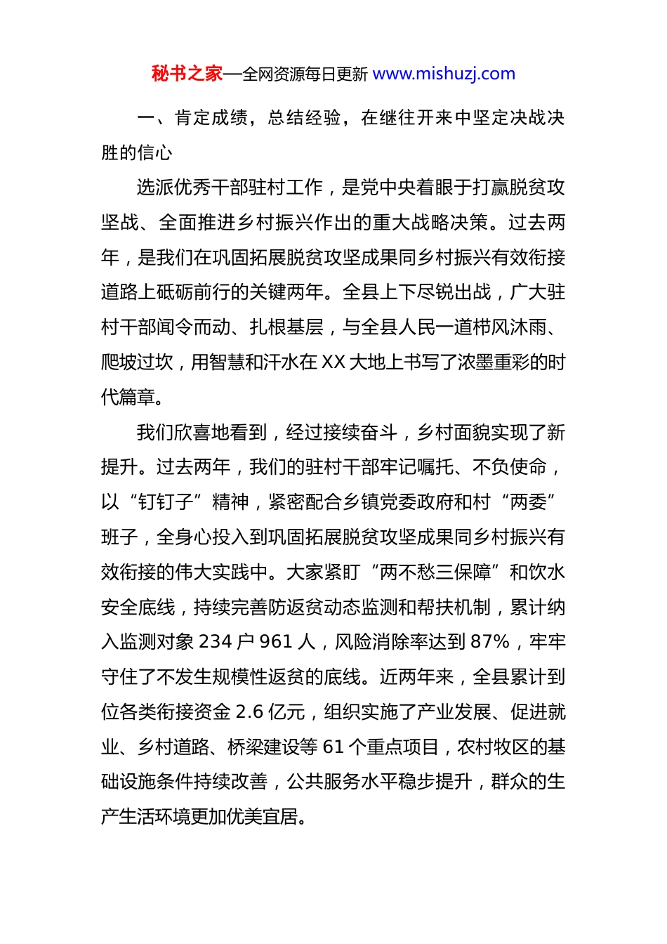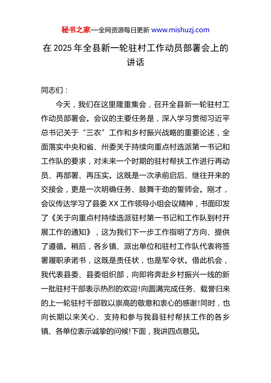 秘书之家—全网资源每日更新 www.mishuzj.com在 2025 年全县新一轮驻村工作动员部署会上的讲话 同志们:今天,我们在这里隆重集会,召开全县新一轮驻村工作动员部署会。会议的主要任务是,深入学习贯彻习近平总书记关于“三农”工作和乡村振兴战略的重要论述,全面落实中央和省、州委关于持续向重点村选派第一书记和工作队的要求,对未来一个时期的驻村帮扶工作进行再动员、再部署、再压实。这既是一次承前启后、继往开来的交接会,更是一次明确任务、鼓舞干劲的誓师会。刚才,会议传达学习了县委 XX 工作领导小组会议精神,书面印发了《关于向重点村持续选派驻村第一书记和工作队到村开展工作的通知》,这为我们下一步工作指明了方向、提供了遵循。稍后,各乡镇、派出单位和驻村工作队代表将签署履职承诺书,这既是责任状,也是军令状。借此机会,我代表县委、县委组织部,向即将奔赴乡村振兴一线的新一批驻村干部表示热烈的欢迎!向圆满完成任务、载誉归来的上一轮驻村干部致以崇高的敬意和衷心的感谢!同时,也向长期以来关心、支持和参与我县驻村帮扶工作的各乡镇、各单位表示诚挚的问候!下面,我讲四点意见。秘书之家—全网资源每日更新 www.mishuzj.com一、肯定成绩,总结经验,在继往开来中坚定决战决胜的信心选派优秀干部驻村工作,是党中央着眼于打赢脱贫攻坚战、全面推进乡村振兴作出的重大战略决策。过去两年,是我们在巩固拓展脱贫攻坚成果同乡村振兴有效衔接道路上砥砺前行的关键两年。全县上下尽锐出战,广大驻村干部闻令而动、扎根基层,与全县人民一道栉风沐雨、爬坡过坎,用智慧和汗水在 XX 大地上书写了浓墨重彩的时代篇章。我们欣喜地看到,经过接续奋斗,乡村面貌实现了新提升。过去两年,我们的驻村干部牢记嘱托、不负使命,以“钉钉子”精神,紧密配合乡镇党委政府和村“两委”班子,全身心投入到巩固拓展脱贫攻坚成果同乡村振兴有效衔接的伟大实践中。大家紧盯“两不愁三保障”和饮水安全底线,持续完善防返贫动态监测和帮扶机制,累计纳入监测对象 234 户 961 人,风险消除率达到 87%,牢牢守住了不发生规模性返贫的底线。近两年来,全县累计到位各类衔接资金 2.6 亿元,组织实施了产业发展、促进就业、乡村道路、桥梁建设等 61 个重点项目,农村牧区的基础设施条件持续改善,公共服务水平稳步提升,群众的生产生活环境更加优美宜居。秘书之家—全网资源每日更新 www.mishuzj.com我们欣喜地看到,经过接续奋斗,群众生活迈上了新台阶。驻村工作,核心在人,关键在民。我们的工作队始终把群众的安危冷暖放在心上,把富民增收作为首要任务。通过持续抓好稳岗就业,全县脱贫人口务工就业达到4936 人;通过大力发展特色产业,我们的生态畜牧业、光伏扶贫、旅游扶贫等富民产业不断壮大。数据是最有力的证 明:到 2023 年底 ,全县脱贫 户人均纯收 入达到了12498.03 元,同比增长 25.5%,这个增幅来之不易,饱含了大家的心血与付出。更为可喜的是,全县 20 个行政村集体经济全面实现“破零”,其中 12 个村年收入突破百万元大关,2 个村甚至突破了千万元,村级组织自我“造血”功能和服务群众能力显著增强。我们欣喜地看到,经过接续奋斗,干部队伍锤炼了新作风。乡村振兴一线是淬炼干部党性、磨砺干部意志、提升干部能力的“大熔炉”和“练兵场”。两年来,一批又一批驻村干部告别家人,奔赴基层,吃在村、住在村、干在村,把群众当亲人,把村庄当家乡,解决了一大批群众急难愁盼问题,调解了大量矛盾纠纷,办成了一系列好事实事,赢得了群众的广泛赞誉,在实践中砥砺了初心、增长了才干,展现了新时代 XX 干部的良好形象,为打赢巩固衔接这场“翻身仗”贡献了不可替代的重要力量。秘书之家—全网资源每日更新 www.mishuzj.com这些成绩的取得,是县委、县政府坚强领导的结果,是各乡镇、各单位通力协作的结果,更是全体驻村干部倾情奉献、扎实工作的结果。实践充分证明,驻村帮扶工作队是党的政策的“宣传队”,是社情民意的“信息员”,是为民办事的“服务员”,是推动发展的“战斗员”。在此,我再次向大家表示衷心的感谢!...