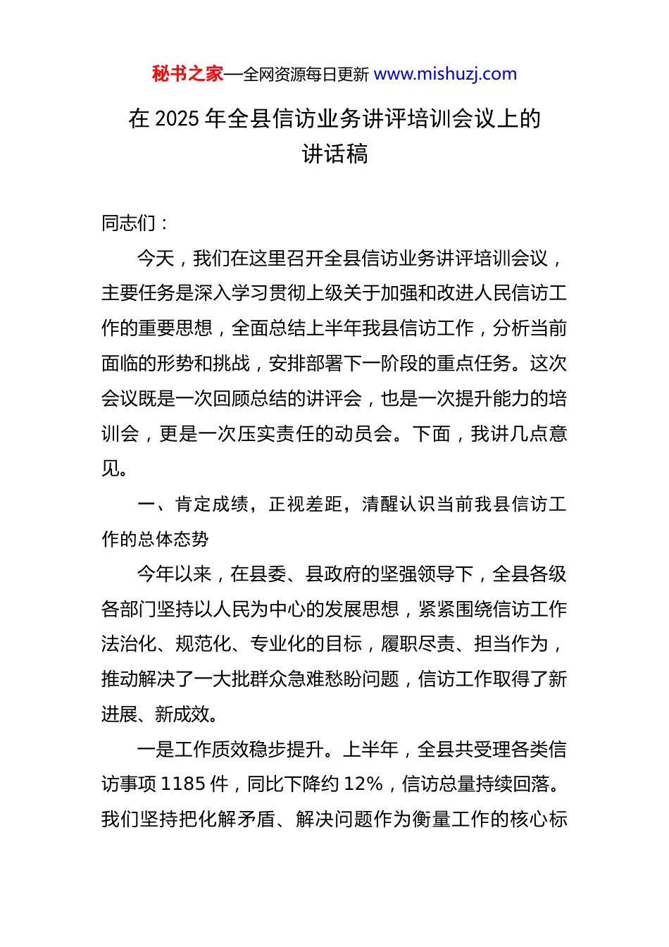 秘书之家—全网资源每日更新 www.mishuzj.com在 2025 年全县信访业务讲评培训会议上的讲话稿同志们:今天,我们在这里召开全县信访业务讲评培训会议,主要任务是深入学习贯彻上级关于加强和改进人民信访工作的重要思想,全面总结上半年我县信访工作,分析当前面临的形势和挑战,安排部署下一阶段的重点任务。这次会议既是一次回顾总结的讲评会,也是一次提升能力的培训会,更是一次压实责任的动员会。下面,我讲几点意见。一、肯定成绩,正视差距,清醒认识当前我县信访工作的总体态势今年以来,在县委、县政府的坚强领导下,全县各级各部门坚持以人民为中心的发展思想,紧紧围绕信访工作法治化、规范化、专业化的目标,履职尽责、担当作为,推动解决了一大批群众急难愁盼问题,信访工作取得了新进展、新成效。一是工作质效稳步提升。上半年,全县共受理各类信访事项 1185 件,同比下降约 12%,信访总量持续回落。我们坚持把化解矛盾、解决问题作为衡量工作的核心标秘书之家—全网资源每日更新 www.mishuzj.com准,全县信访事项按期办结率达到 81%,群众综合满意率提升至 75.3%,两项指标均实现明显增长。特别是在初次信访办理方面,我们下大力气压实首办责任,初信初访一次性化解率保持在 97%以上的高位水平,有效防止了“小问题”拖成“大麻烦”。二是源头治理持续深化。各乡镇(街道)和县直部门普遍加强了矛盾纠纷排查化解力度,主动发现和处置了一批苗头性、倾向性问题。我们着力推广“有事找书记”等基层治理品牌,畅通和规范群众诉求表达渠道,将大量矛盾化解在基层、化解在萌芽状态。针对国家和省市交办的重点信访积案,我们实行清单化管理、挂图作战,二季度以来,积案化解率环比大幅提升了 20 多个百分点,啃下了一批硬骨头。三是法治化水平不断提高。我们严格依照《信访工作条例》等法规文件开展工作,依法分类处理信访诉求的导向更加鲜明。信访事项的受理、办理、督办、反馈等环节进一步规范,业务流程的闭环管理机制初步形成。通过组织培训、案例指导等方式,全县信访干部的法治意识和业务能力得到了普遍增强,运用法治思维和法治方式解决问题的能力有了新的提升。在肯定成绩的同时,我们必须清醒地看到,对标上级秘书之家—全网资源每日更新 www.mishuzj.com的要求和群众的期待,我县的信访工作仍然存在一些不容忽视的短板和弱项。主要表现在:第一,工作发展不平衡。有的单位对信访工作的重要性认识不足、投入精力不够,存在“重发展、轻稳定”的倾向,工作时紧时松,导致该单位或领域的信访问题易发多发。第二,源头预防不扎实。从信访问题的领域分布看,城乡建设、征地拆迁、劳动社保、农村农业等领域的矛盾依然比较集中,这深刻反映出一些单位在政策执行、项目推进过程中,群众工作做得不深不细,前端预防和化解机制未能有效发挥作用。第三,办理质效不够高。部分信访事项虽然程序上已经办结,但“案结事了、群众满意”的目标并未真正实现,导致重复访、越级访时有发生。一些干部在处理问题时方法简单、作风生硬,未能做到情理法相统一,影响了办理效果。第四,队伍建设有待加强。面对新形势新任务,少数信访干部的专业素养和综合能力还跟不上,不善于做群众工作,不熟悉相关法律政策,处理复杂矛盾时“手中有招”的能力不足。对于这些问题,我们必须高度重视,采取有力措施,切实加以解决。二、聚焦关键,精准发力,全力推动我县信访工作再上新台阶做好新时代的信访工作,责任重大,使命光荣。全县秘书之家—全网资源每日更新 www.mishuzj.com各级各部门要切实把思想和行动统一到中央和省市的决策部署上来,以更高的标准、更实的举措、更优的作风,抓好各项工作落实。这里,我再强调五点要求:第一,要“心中有责”抓信访,在敢于担当中履职尽责。发展是第一要务,稳定是第一责任。信访工作是衡量一个地区、一个部门社会治理能力和干部担当精神的“试金石”。各级领导干部特别是“一把手”,必须深刻认识到,抓信访就是抓稳定,抓稳定就是抓发展。要坚决扛起信访工作的政治责任,将其作为“一把手”工程来抓,定期听取汇报、分析形势、研究对策,...