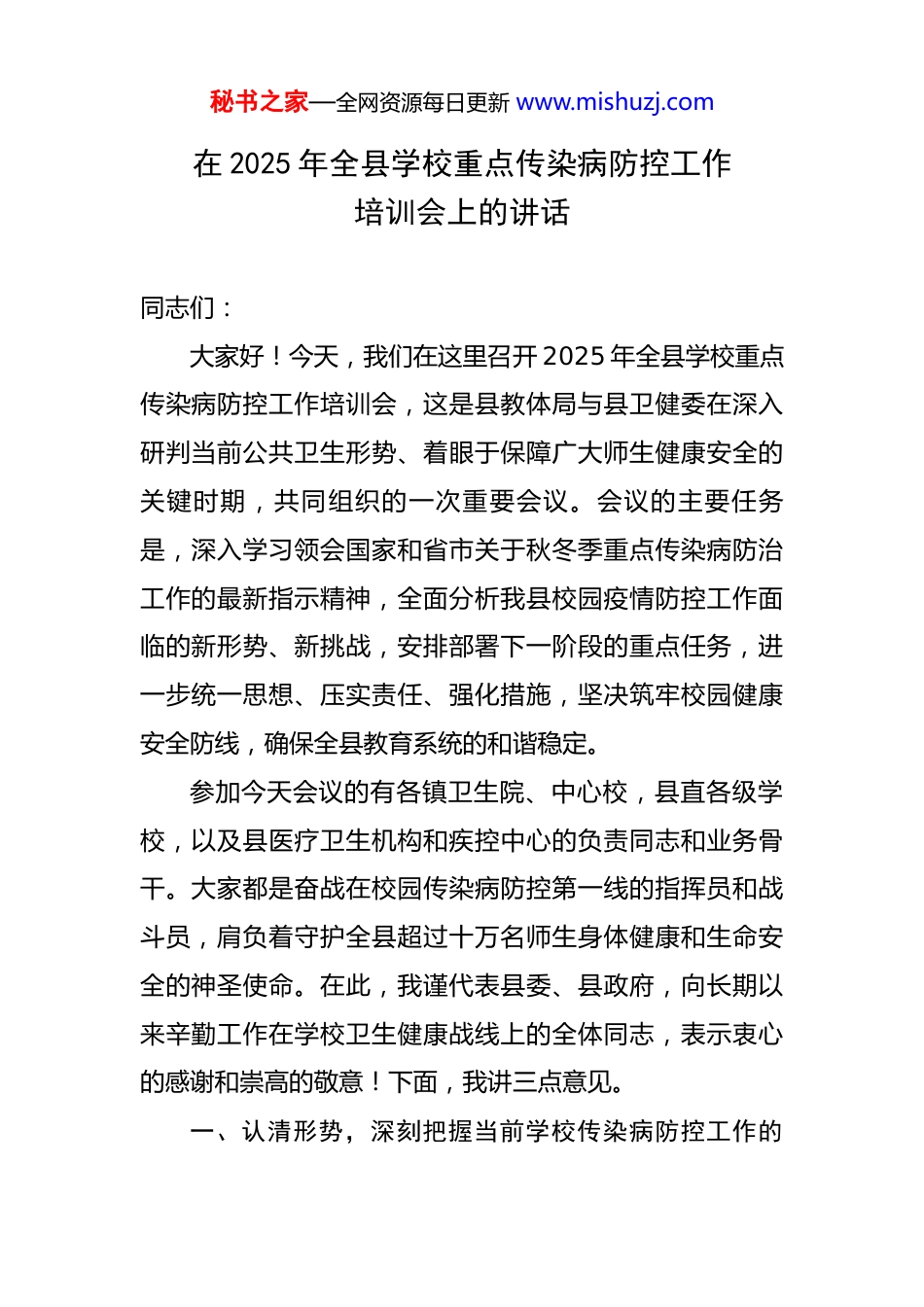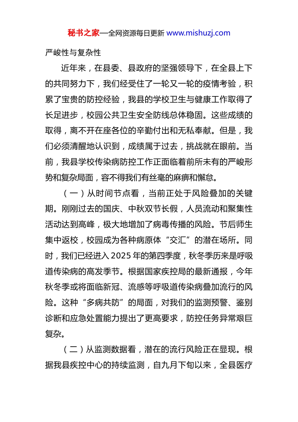 秘书之家—全网资源每日更新 www.mishuzj.com在 2025 年全县学校重点传染病防控工作培训会上的讲话 同志们:大家好!今天,我们在这里召开 2025 年全县学校重点传染病防控工作培训会,这是县教体局与县卫健委在深入研判当前公共卫生形势、着眼于保障广大师生健康安全的关键时期,共同组织的一次重要会议。会议的主要任务是,深入学习领会国家和省市关于秋冬季重点传染病防治工作的最新指示精神,全面分析我县校园疫情防控工作面临的新形势、新挑战,安排部署下一阶段的重点任务,进一步统一思想、压实责任、强化措施,坚决筑牢校园健康安全防线,确保全县教育系统的和谐稳定。参加今天会议的有各镇卫生院、中心校,县直各级学校,以及县医疗卫生机构和疾控中心的负责同志和业务骨干。大家都是奋战在校园传染病防控第一线的指挥员和战斗员,肩负着守护全县超过十万名师生身体健康和生命安全的神圣使命。在此,我谨代表县委、县政府,向长期以来辛勤工作在学校卫生健康战线上的全体同志,表示衷心的感谢和崇高的敬意!下面,我讲三点意见。一、认清形势,深刻把握当前学校传染病防控工作的秘书之家—全网资源每日更新 www.mishuzj.com严峻性与复杂性近年来,在县委、县政府的坚强领导下,在全县上下的共同努力下,我们经受住了一轮又一轮的疫情考验,积累了宝贵的防控经验,我县的学校卫生与健康工作取得了长足进步,校园公共卫生安全防线总体稳固。这些成绩的取得,离不开在座各位的辛勤付出和无私奉献。但是,我们必须清醒地认识到,成绩属于过去,挑战就在眼前。当前,我县学校传染病防控工作正面临着前所未有的严峻形势和复杂局面,容不得我们有丝毫的麻痹和懈怠。(一)从时间节点看,当前正处于风险叠加的关键期。刚刚过去的国庆、中秋双节长假,人员流动和聚集性活动达到高峰,极大地增加了病毒传播的风险。节后师生集中返校,校园成为各种病原体“交汇”的潜在场所。同时,我们已经进入 2025 年的第四季度,秋冬季历来是呼吸道传染病的高发季节。根据国家疾控局的最新通报,今年秋冬季或将面临新冠、流感等呼吸道传染病叠加流行的风险。这种“多病共防”的局面,对我们的监测预警、鉴别诊断和应急处置能力提出了更高要求,防控任务异常艰巨复杂。(二)从监测数据看,潜在的流行风险正在显现。根据我县疾控中心的持续监测,自九月下旬以来,全县医疗秘书之家—全网资源每日更新 www.mishuzj.com机构报告的流感样病例数量呈现出缓慢攀升的趋势,个别学校也出现了零星的散发病例。虽然目前整体态势平稳可控,但这无疑是一个需要我们高度警惕的信号。回顾过去几年的防控实践,无论是 2023 年春季的甲流,还是去年秋冬季的支原体肺炎,都曾在我县部分学校造成一定影响。这些历史数据和现实苗头反复警示我们,病毒离我们并不遥远,风险就在我们身边。我们必须坚决克服“疫情已经过去”的松懈思想和“偶发病例不要紧”的侥幸心理,时刻保持临战状态。(三)从防控主体看,学校是传染病防控的薄弱环节。学校作为特殊的人群密集场所,其内在脆弱性不言而喻。一是学生年龄偏小,特别是中小学和托幼机构的儿童,自身免疫系统尚未发育完全,是传染病的易感人群。二是空间密闭,教室、宿舍、食堂等区域人口密度大、通风条件有限,一旦出现传染源,极易在短时间内形成快速传播,造成聚集性疫情。三是管理难度大,学生自我防护意识和能力相对较弱,健康习惯养成需要长期引导,这给学校的日常防控管理带来了巨大挑战。可以说,守住了校园,就守住了全县公共卫生安全的半壁江山;校园一旦“失守”,后果将不堪设想,不仅直接危害师生健康,更会通过“学校-家庭-社会”的链条放大传播效应,影响秘书之家—全网资源每日更新 www.mishuzj.com全县的社会稳定和经济发展大局。同志们,我们必须从讲政治、顾大局、保民生的高度,充分认识做好当前学校传染病防控工作的极端重要性和现实紧迫性。这既是一项严肃的政治任务,也是一项重大的民生工程。全县教体、卫健系统必须立即行动起来,把思想和行动统一到县委、县政府的决策部署上来,以“时时放心不下”的责任感和“事事落实到位”...
